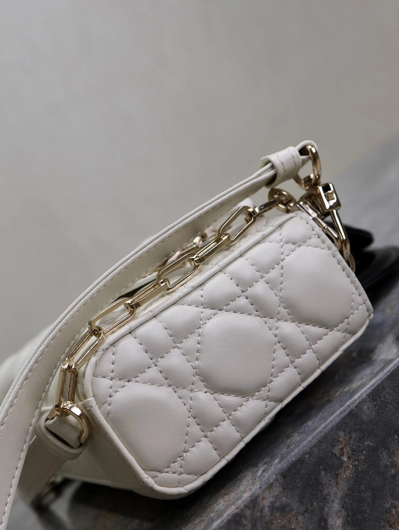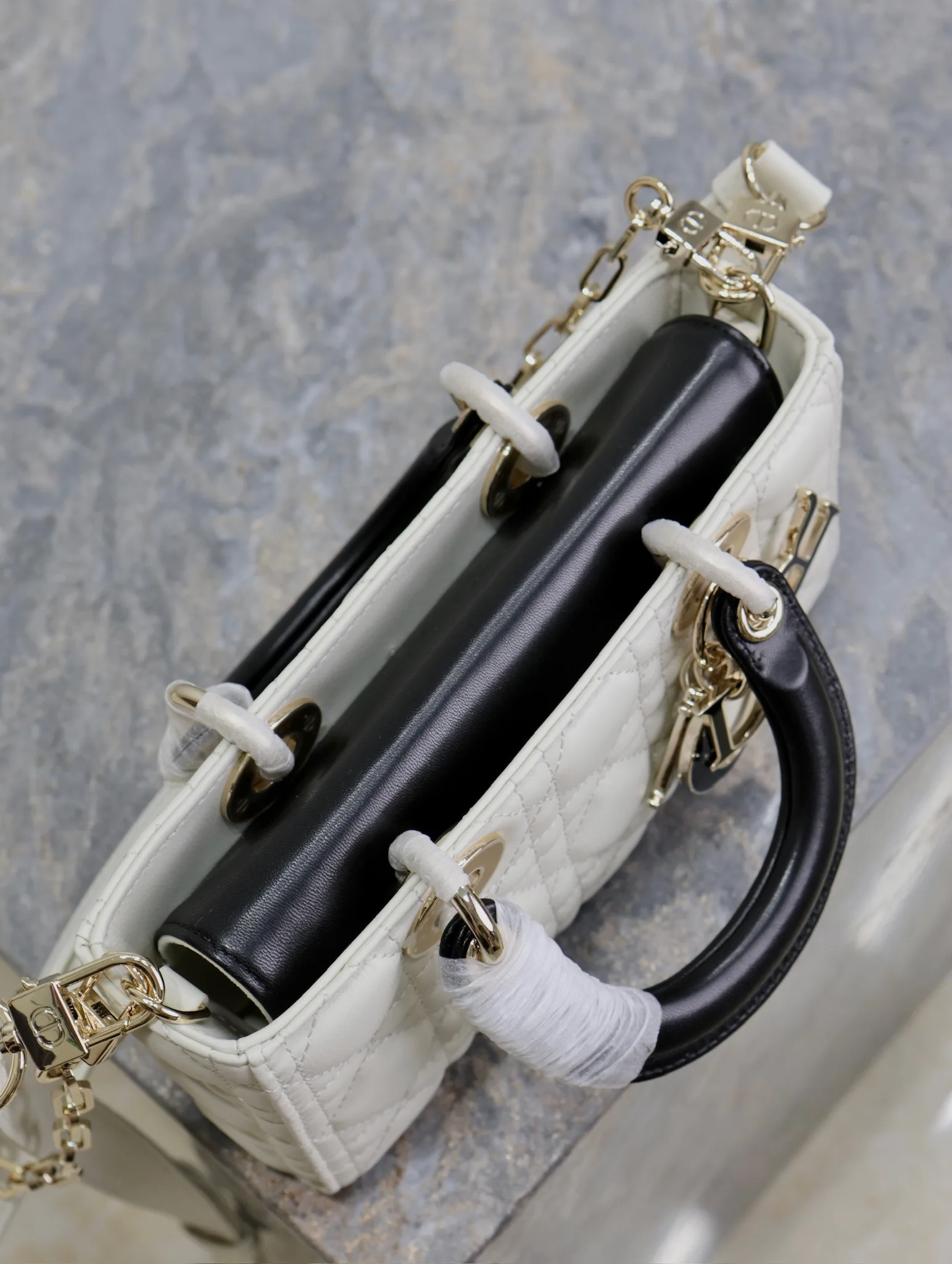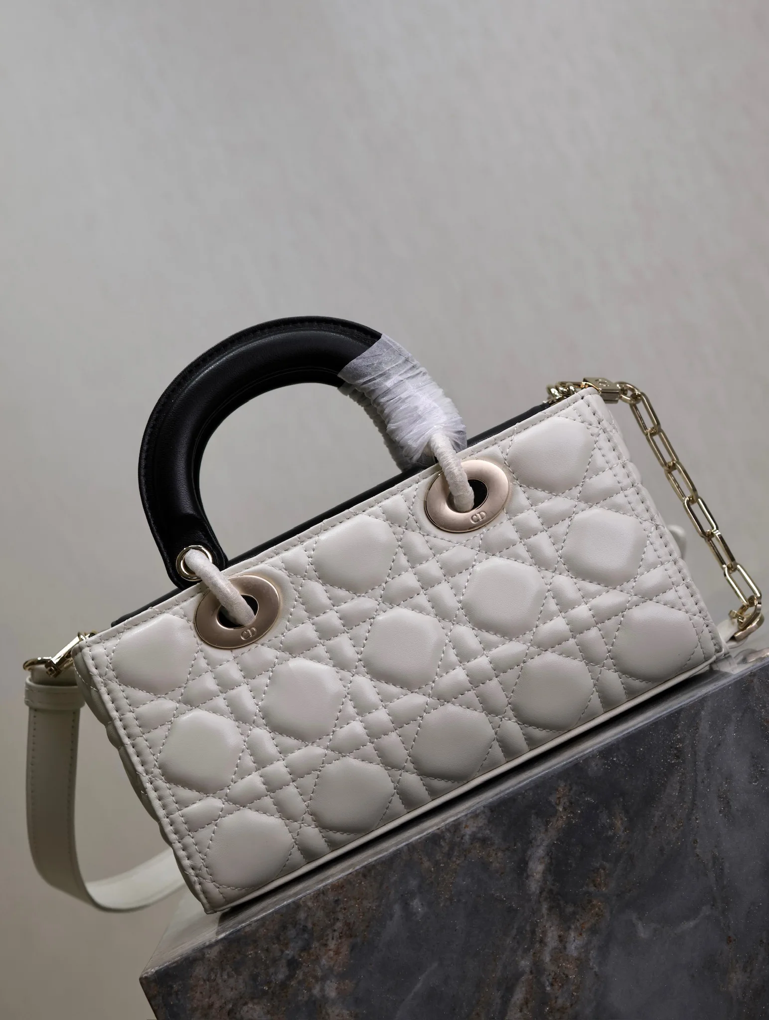 横版戴妃包 白拼黑色小号全新Lady D−Joy包包 很多人应该都被这只窄版戴妃包吸引住了 大爆款的节奏 包包自带一长一短两根肩带 多种背法 可斜挎可腋下 上身又美又飒 经典的菱格设计 搭配柔软的绵羊皮优雅又时尚