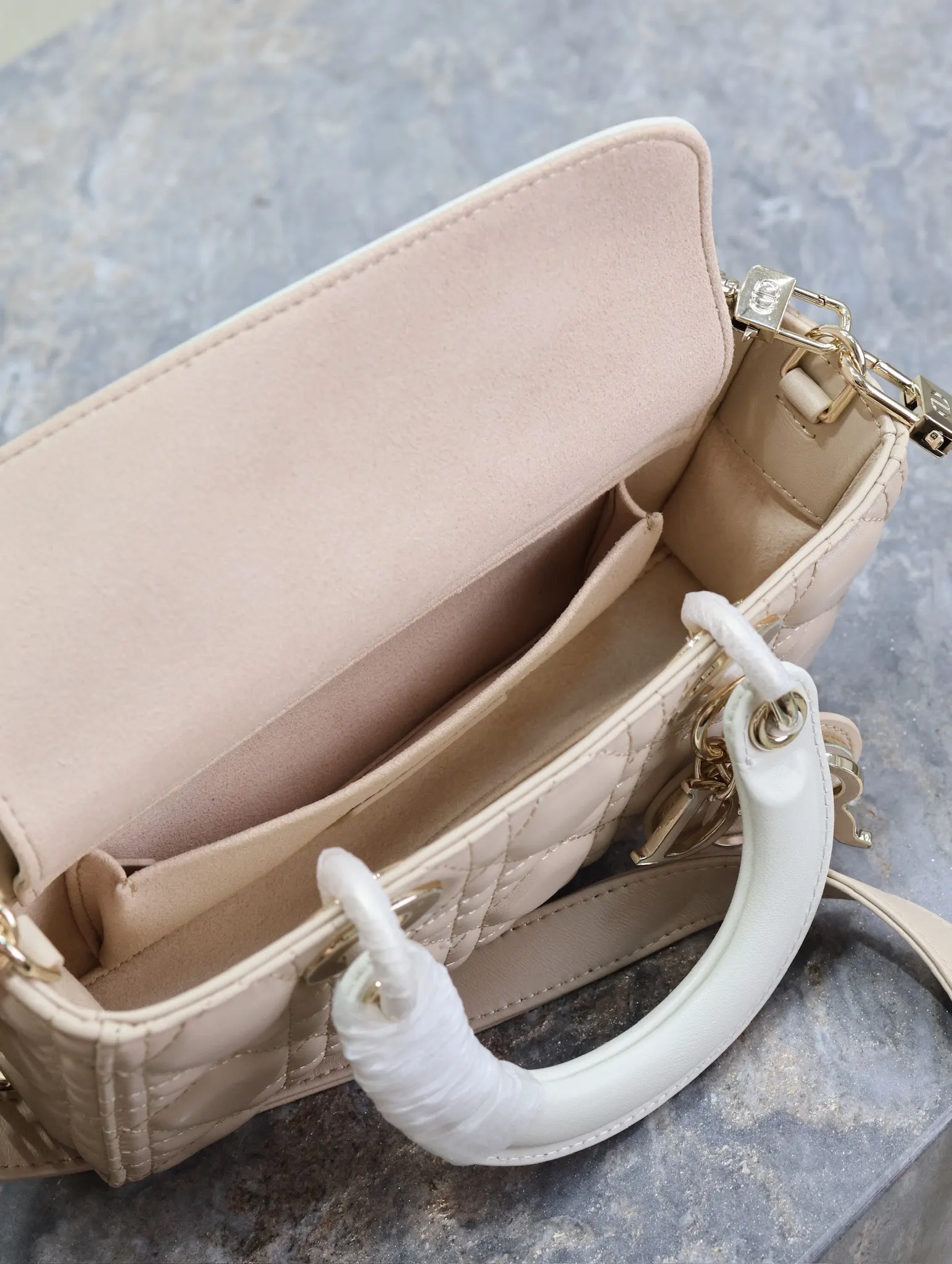 横版戴妃包 杏拼白色小号全新Lady D−Joy包包 很多人应该都被这只窄版戴妃包吸引住了 大爆款的节奏 包包自带一长一短两根肩带 多种背法 可斜挎可腋下 上身又美又飒 经典的菱格设计 搭配柔软的绵羊皮优雅又时尚