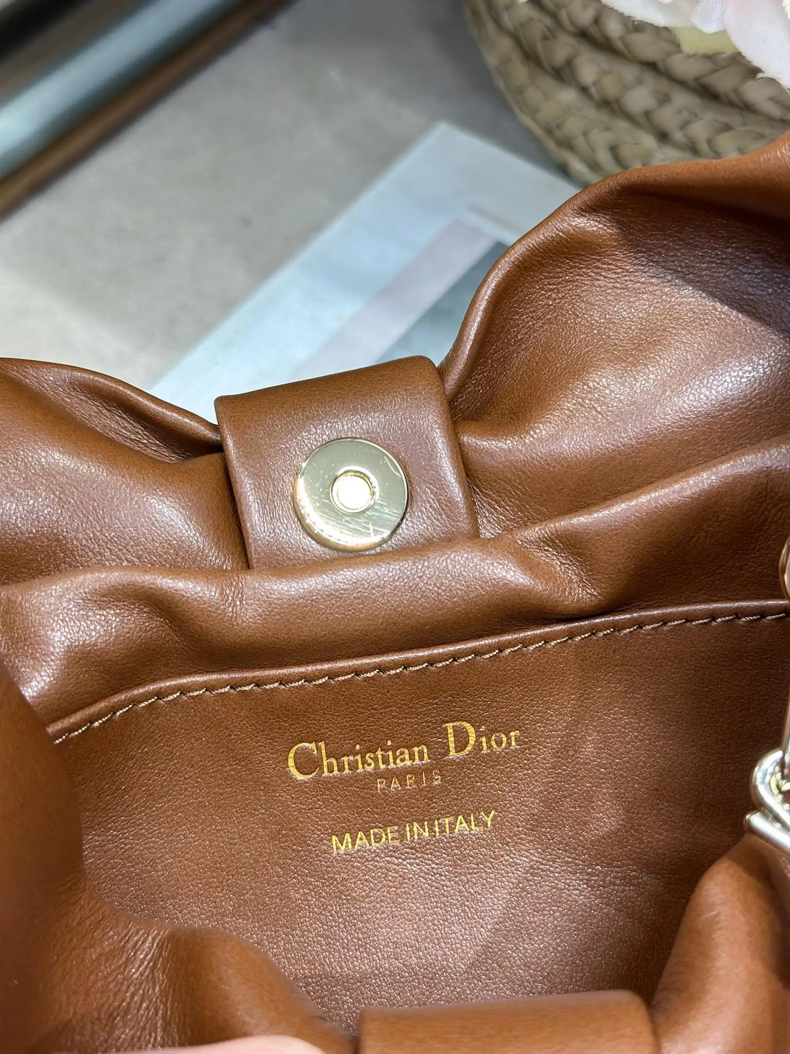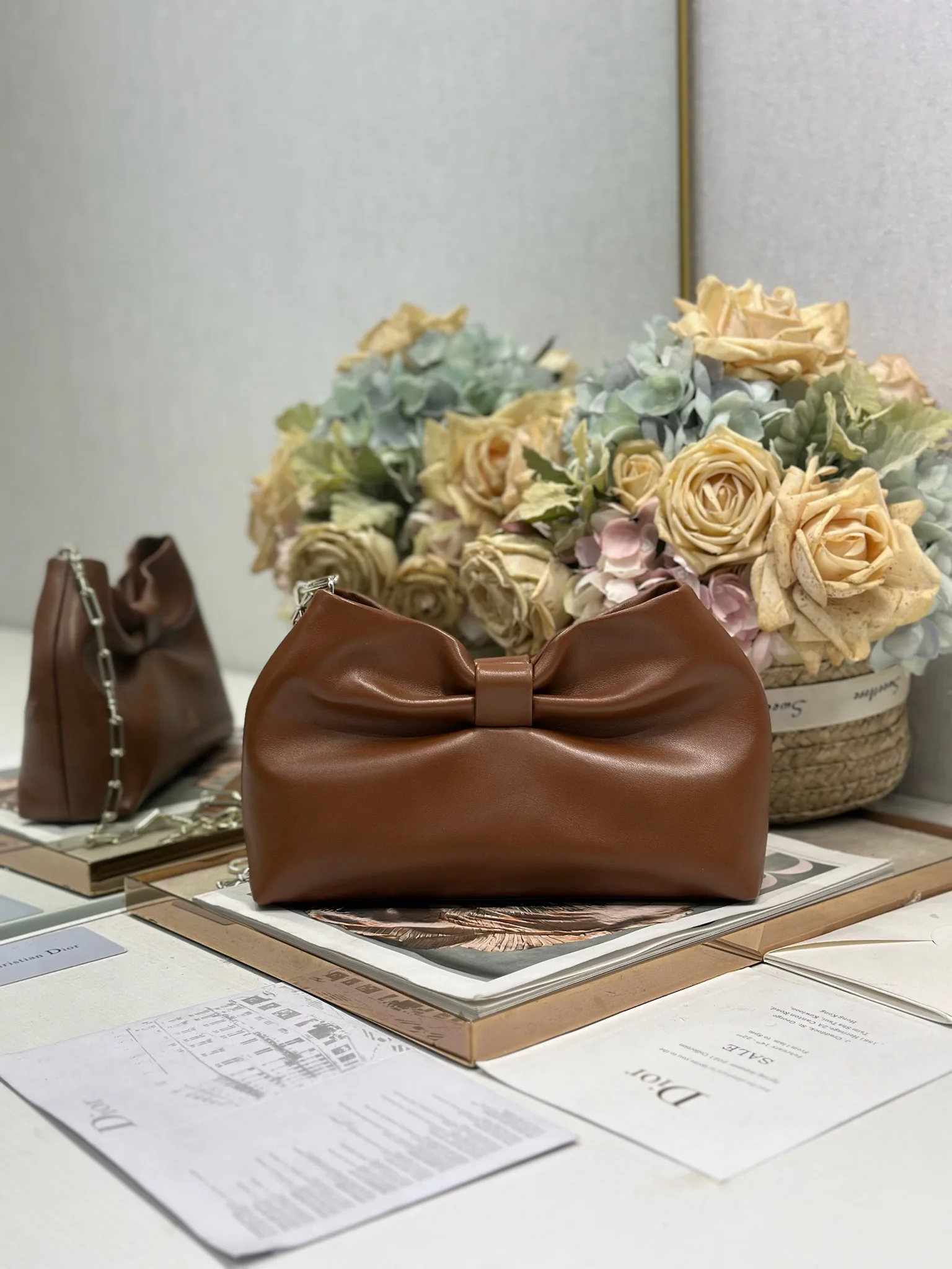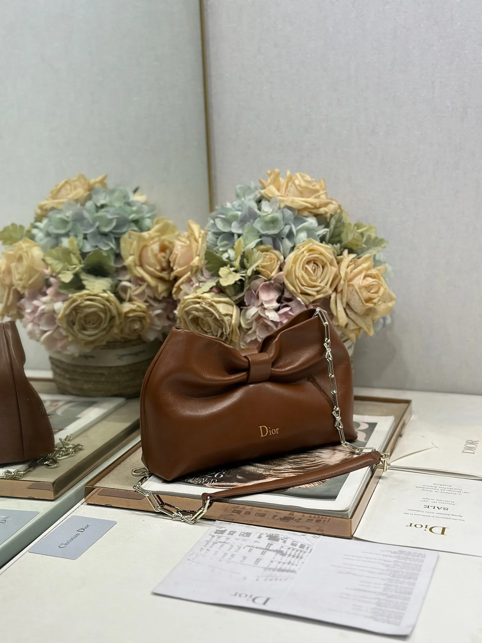 Dior-LAMBSKIN 2026春夏 新款手袋 棕色 浅金链 LAMBSKIN链条包 全新的包形 小牛皮革的质感 优雅大气 款式实用 可收纳各种日常用品 是日装和晚装的理想良伴 可拆卸链条以蝴蝶结点缀更显精致 可手提或斜挎 型号 0714尺寸 27×8×18cm 长×宽×高