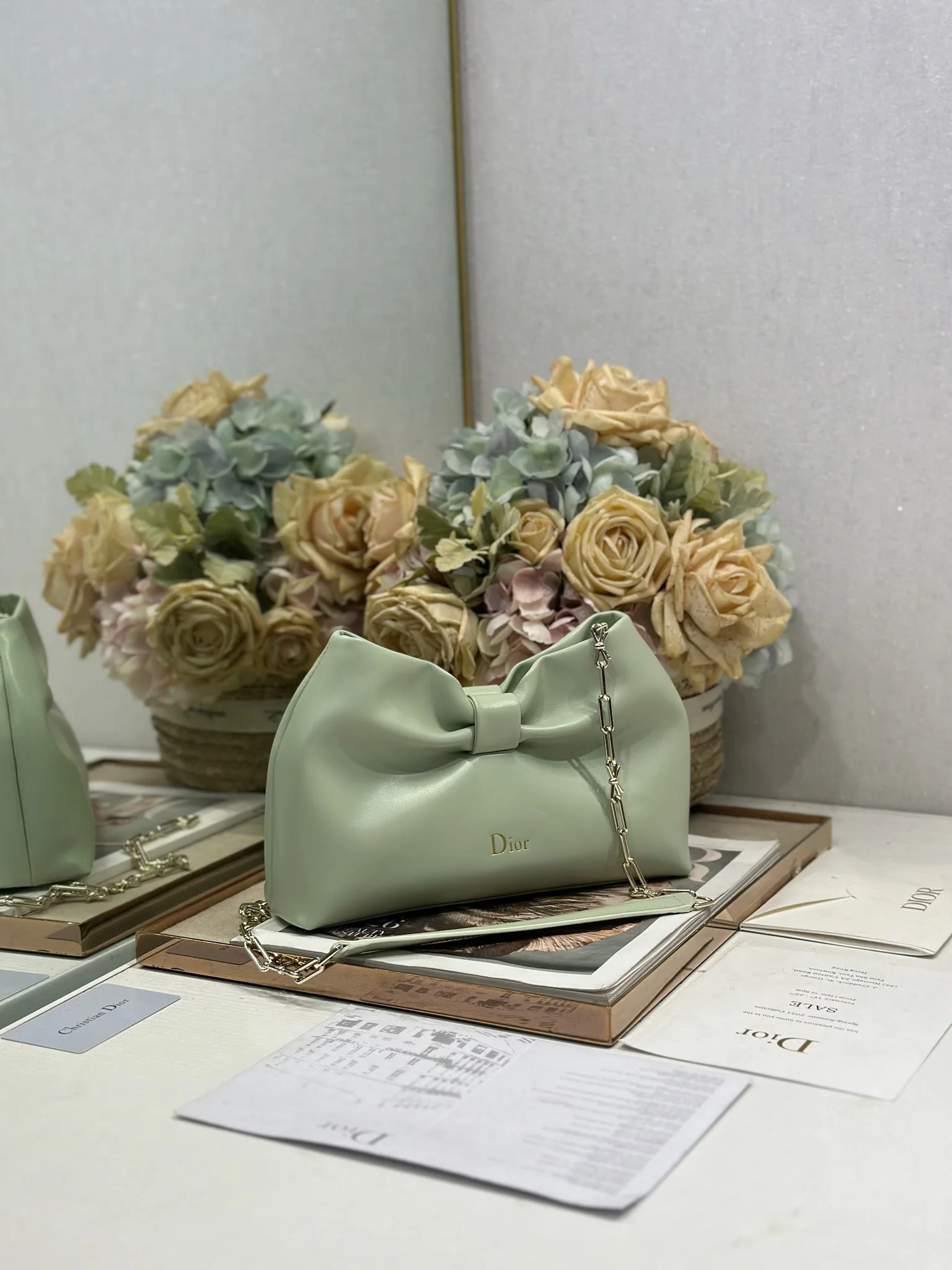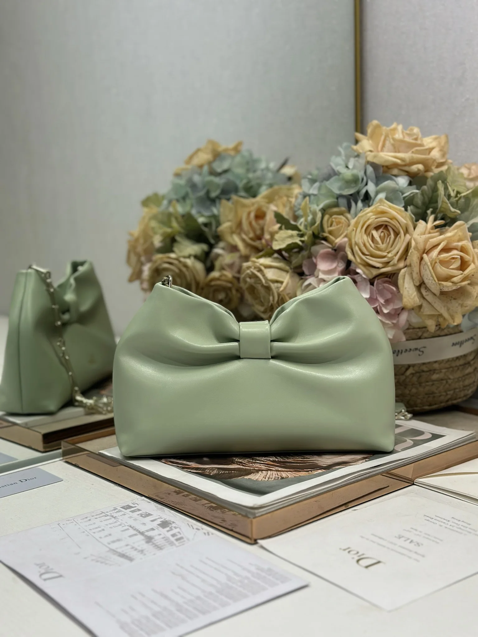 Dior-LAMBSKIN 2026春夏 新款手袋 牛油果绿 浅金链 LAMBSKIN链条包 全新的包形 小牛皮革的质感 优雅大气 款式实用 可收纳各种日常用品 是日装和晚装的理想良伴 可拆卸链条以蝴蝶结点缀更显精致 可手提或斜挎 型号 0714尺寸 27×8×18cm 长×宽×高