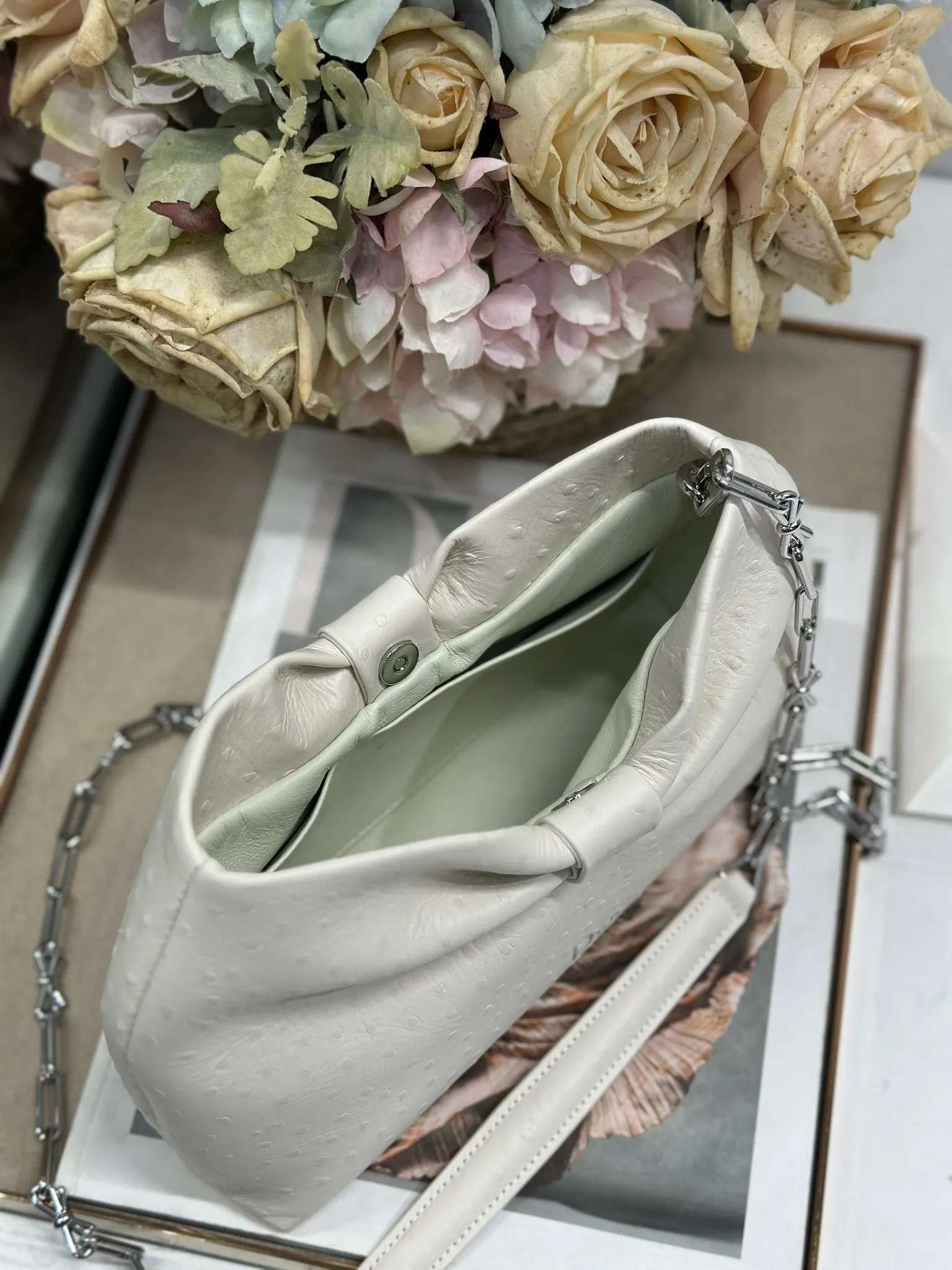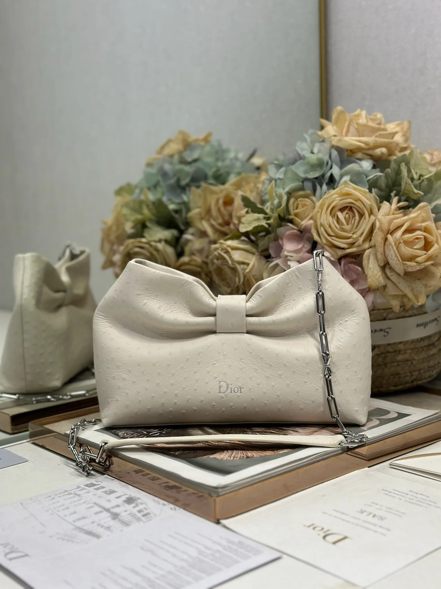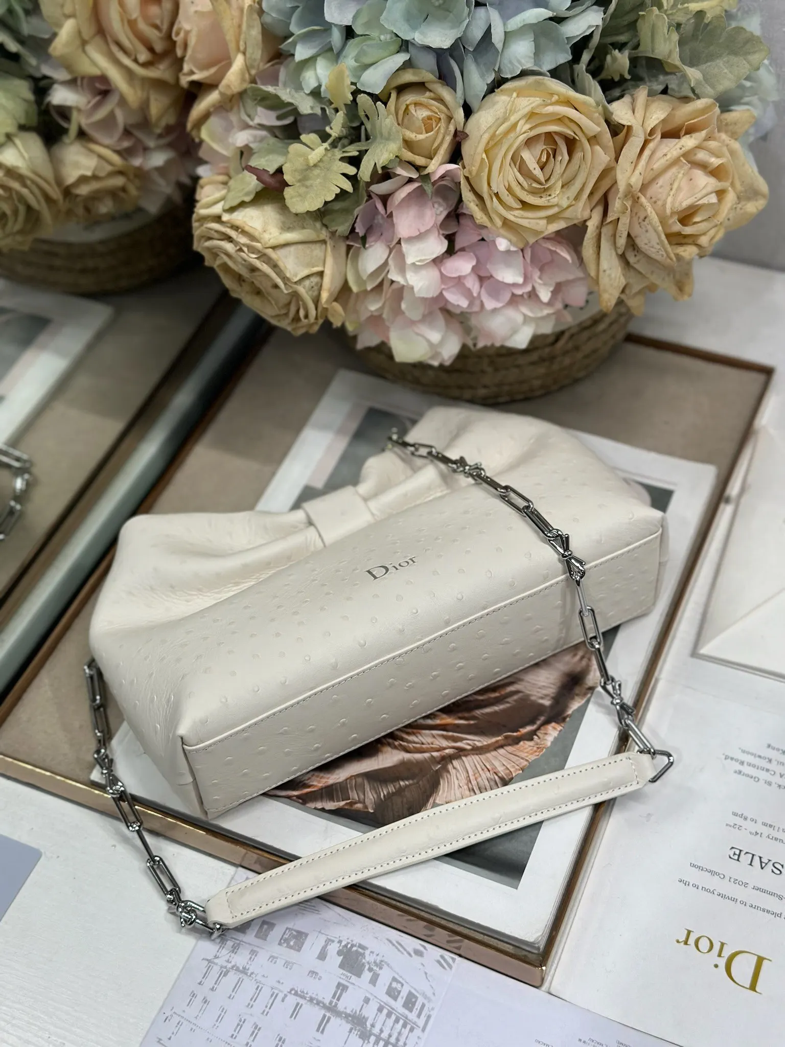 Dior-LAMBSKIN 2026春夏 新款手袋 鸵鸟白色 银链 LAMBSKIN链条包 全新的包形 小牛皮革的质感 优雅大气 款式实用 可收纳各种日常用品 是日装和晚装的理想良伴 可拆卸链条以蝴蝶结点缀更显精致 可手提或斜挎 型号 0714尺寸 27×8×18cm 长×宽×高