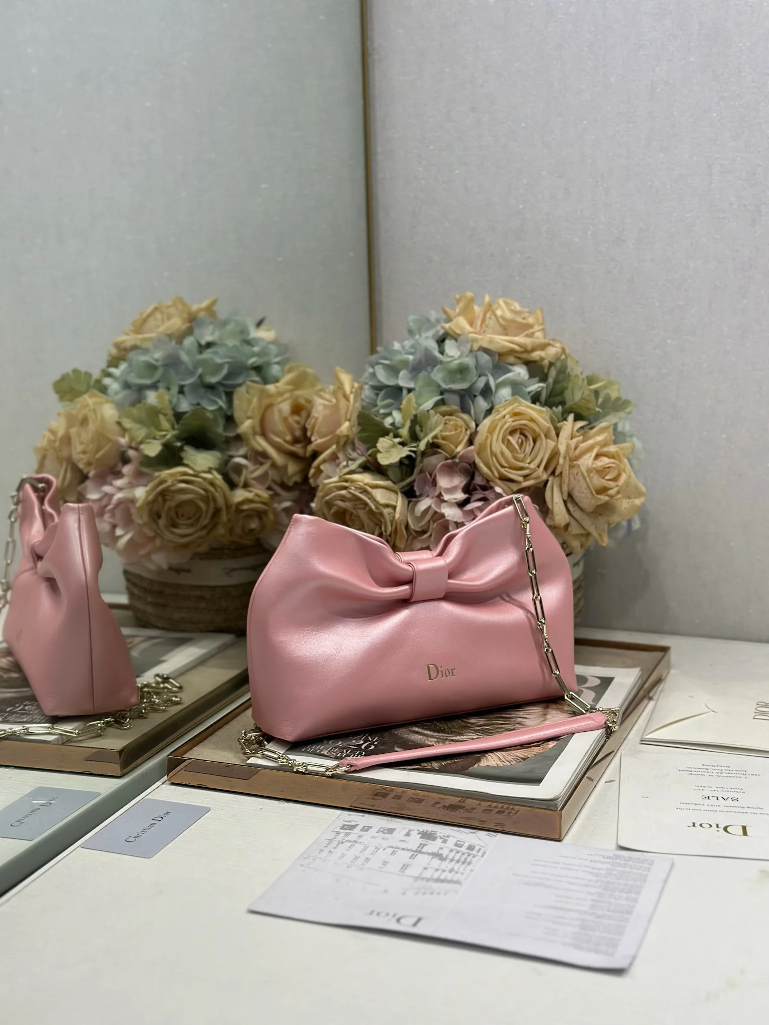 Dior-LAMBSKIN 2026春夏 新款手袋 荧光粉 浅金链 LAMBSKIN链条包 全新的包形 小牛皮革的质感 优雅大气 款式实用 可收纳各种日常用品 是日装和晚装的理想良伴 可拆卸链条以蝴蝶结点缀更显精致 可手提或斜挎