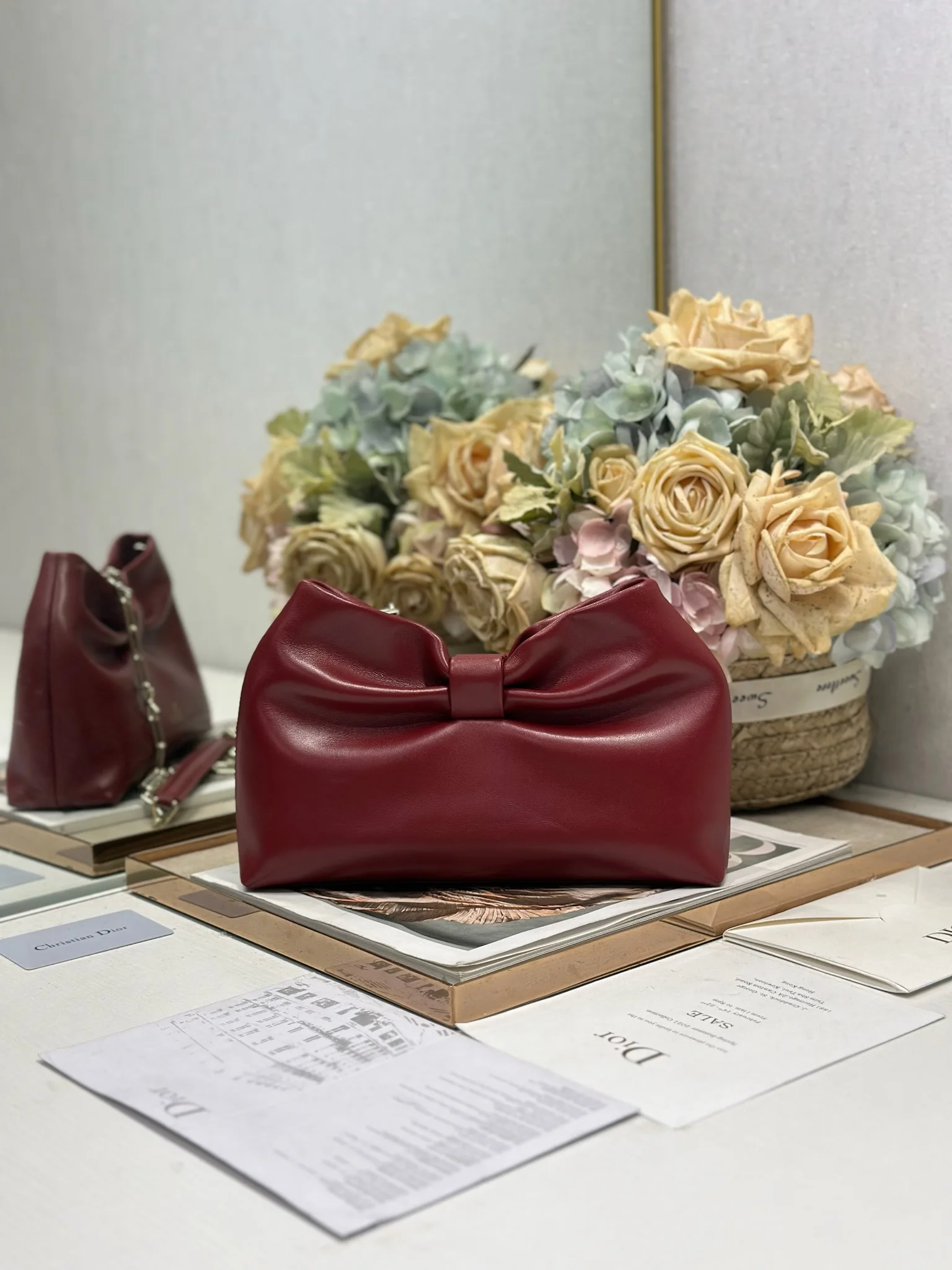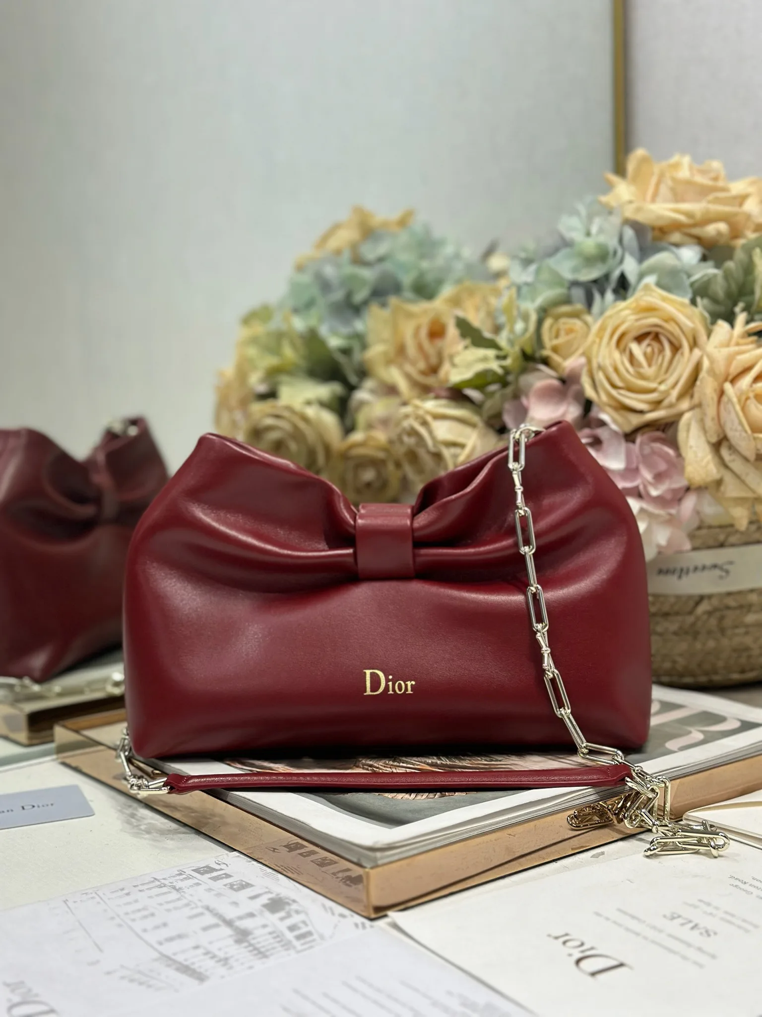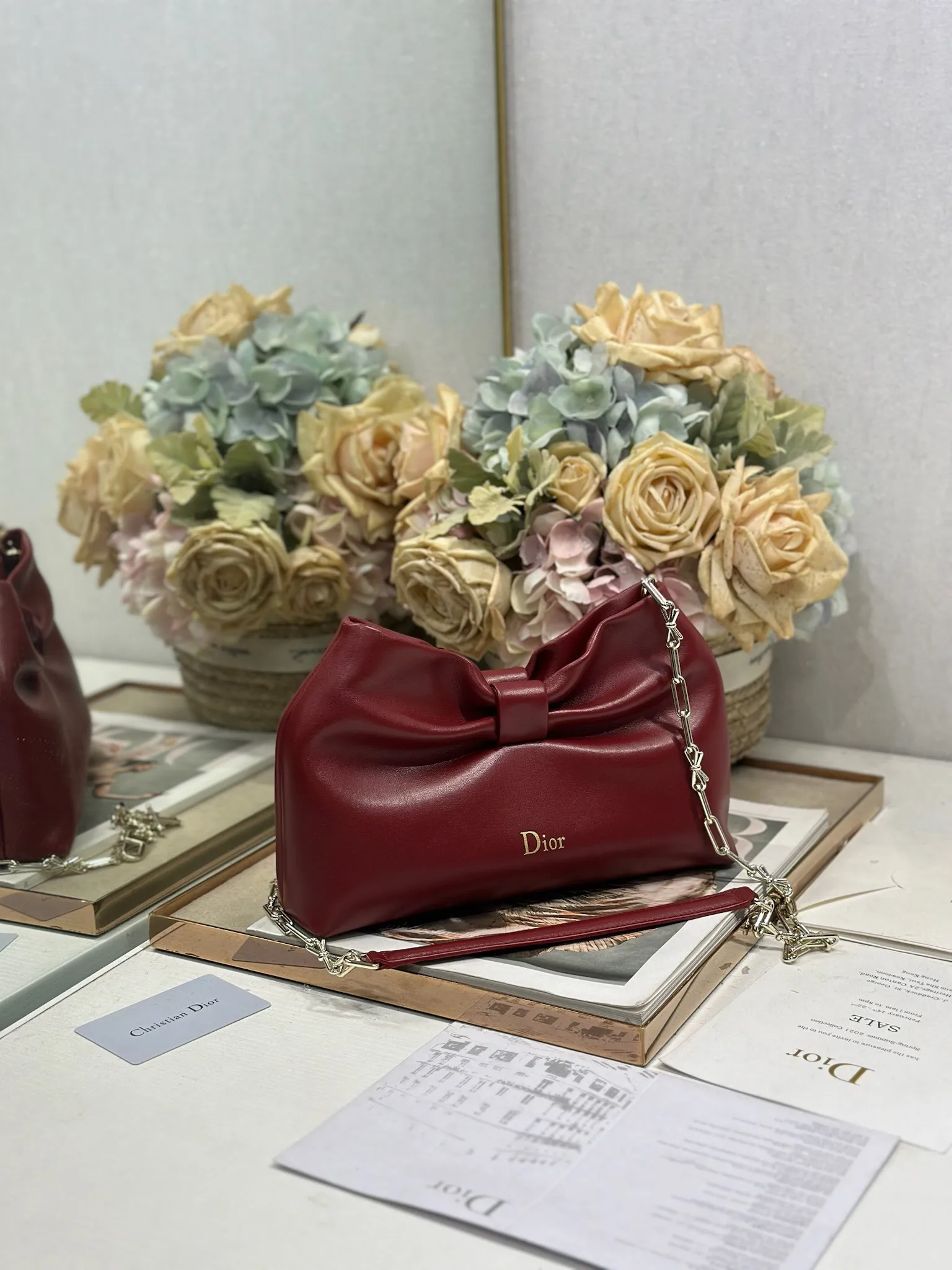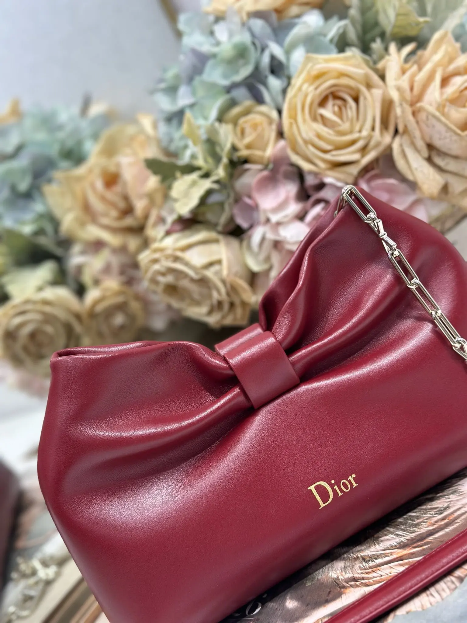 Dior-LAMBSKIN 2026春夏 新款手袋 酒红色 浅金链 LAMBSKIN链条包 全新的包形 小牛皮革的质感 优雅大气 款式实用 可收纳各种日常用品 是日装和晚装的理想良伴 可拆卸链条以蝴蝶结点缀更显精致 可手提或斜挎