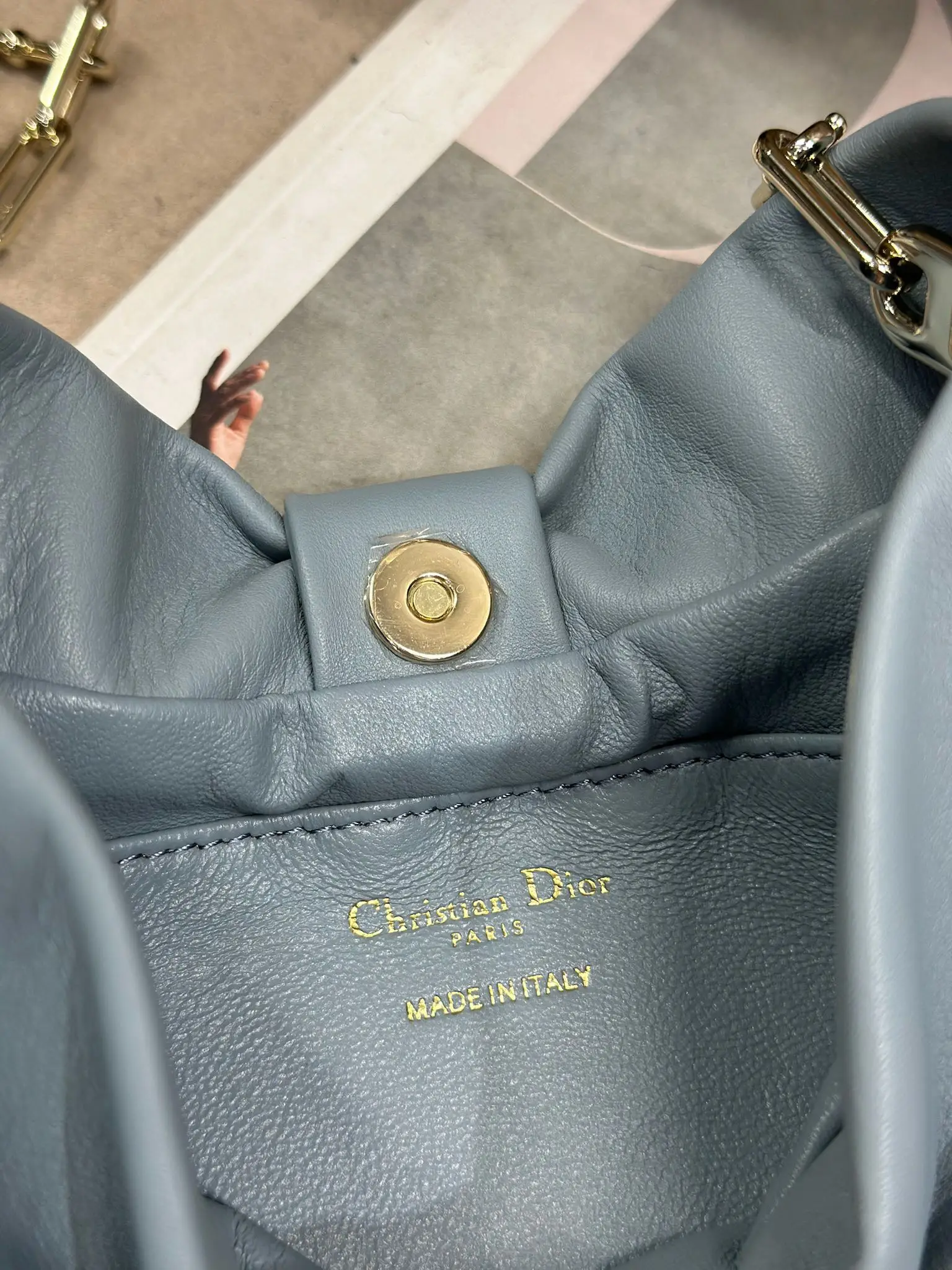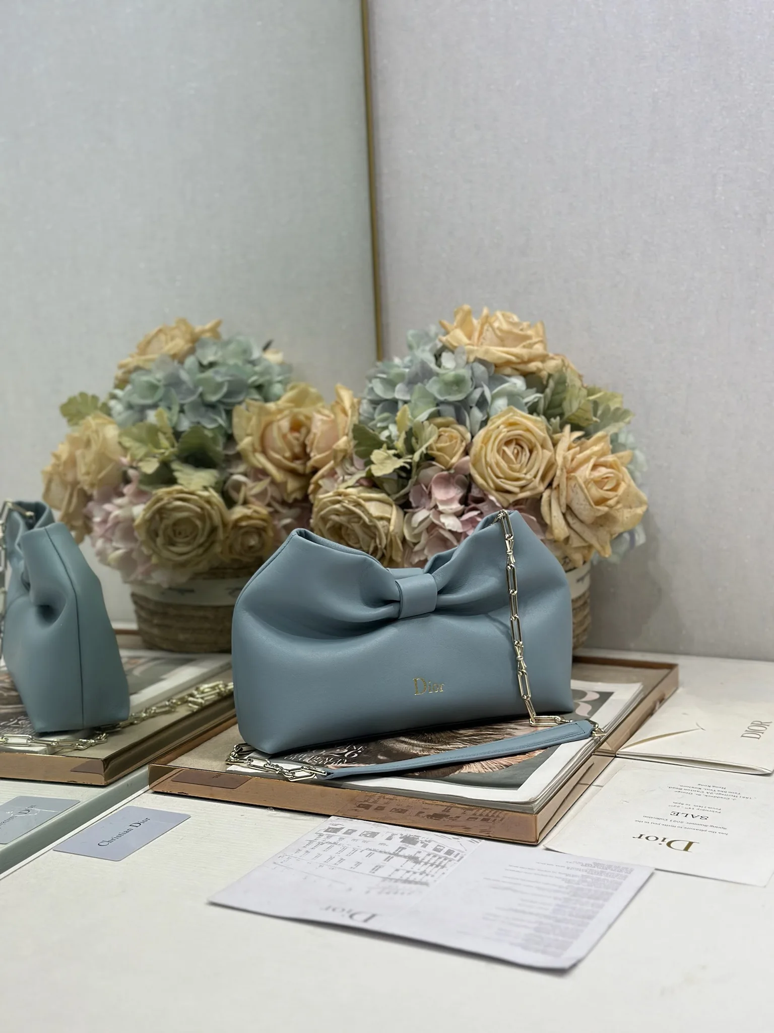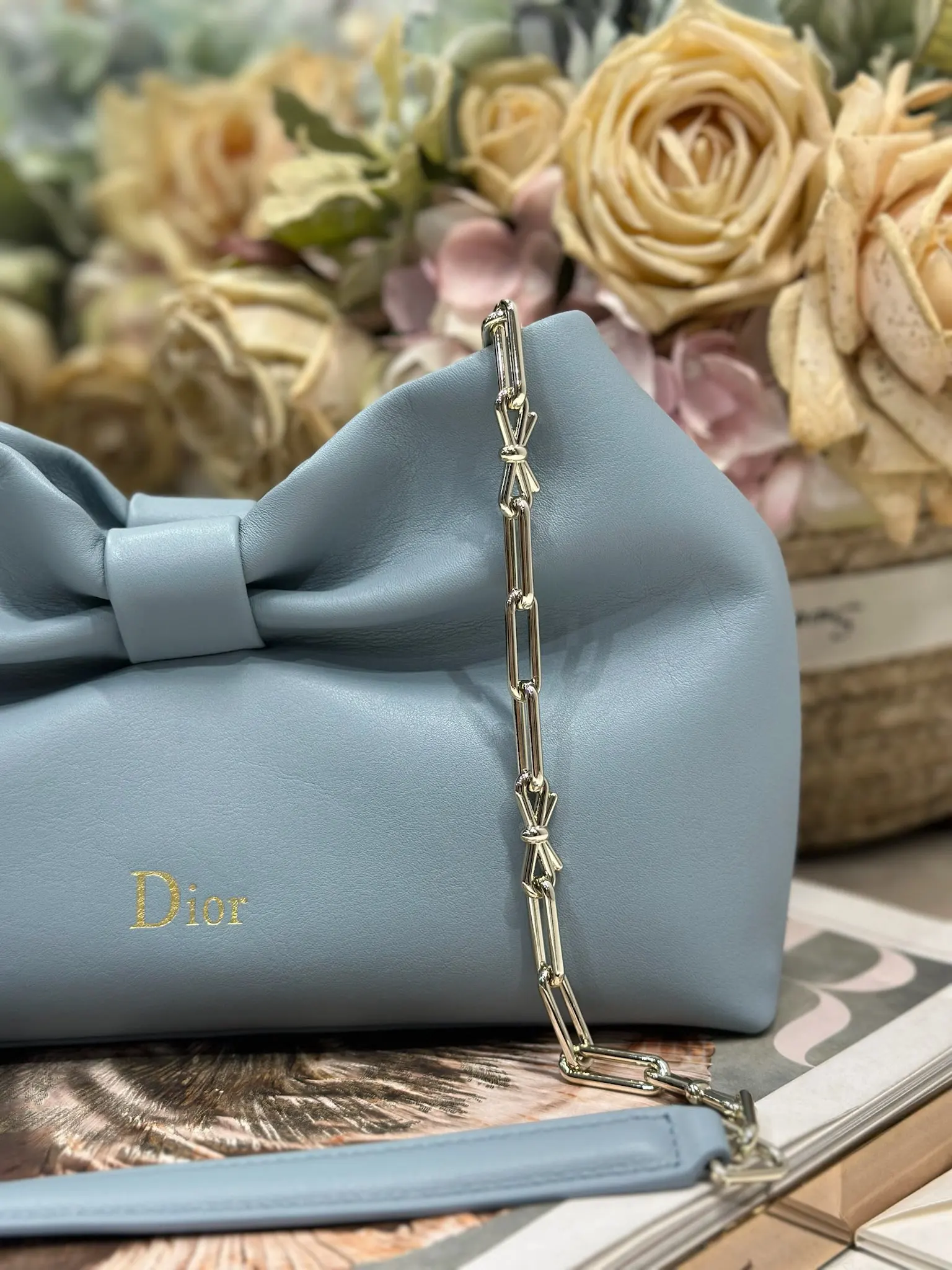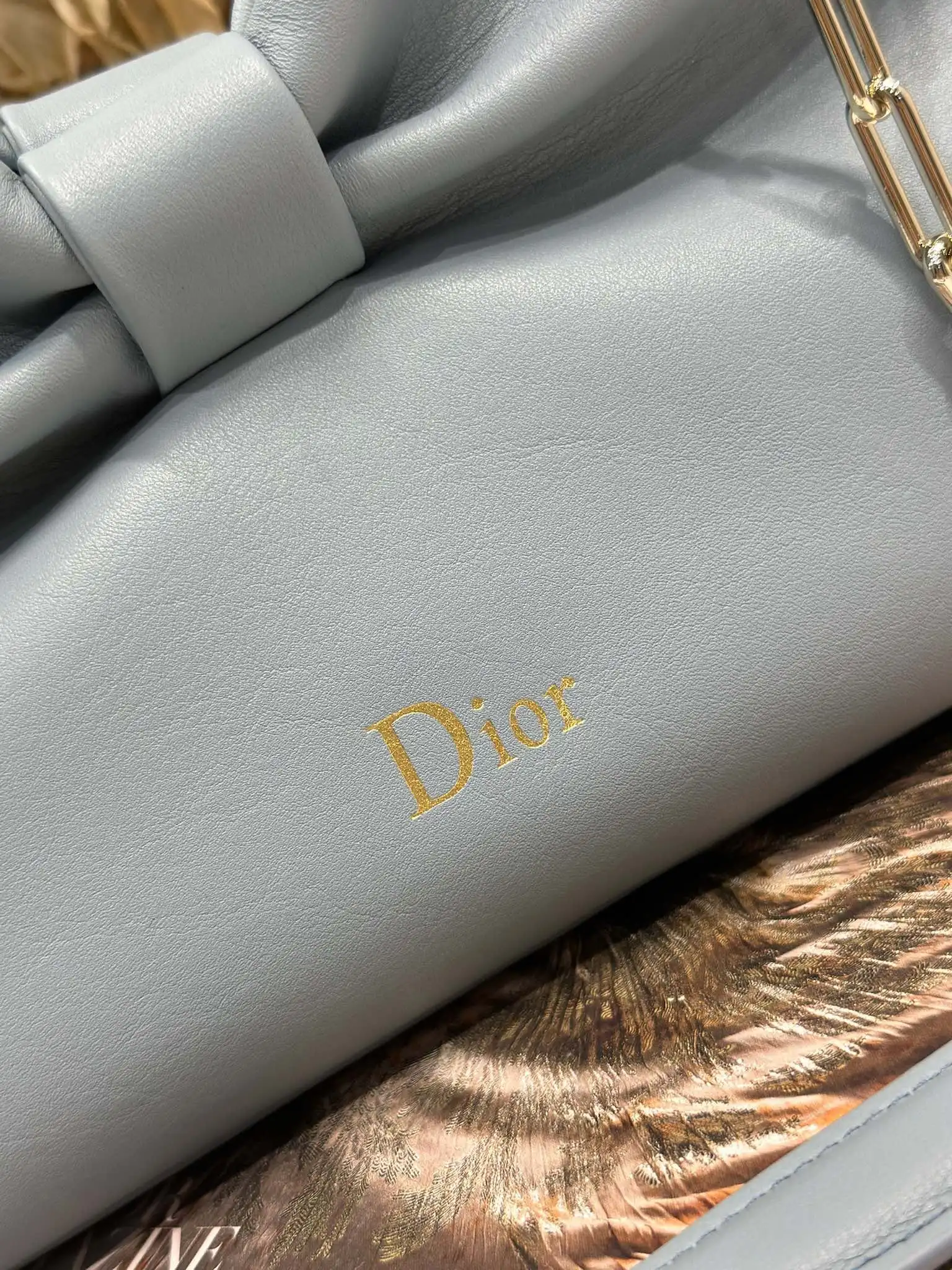 Dior-LAMBSKIN 2026春夏 新款手袋 云雾蓝 浅金链 LAMBSKIN链条包 全新的包形 小牛皮革的质感 优雅大气 款式实用 可收纳各种日常用品 是日装和晚装的理想良伴 可拆卸链条以蝴蝶结点缀更显精致 可手提或斜挎