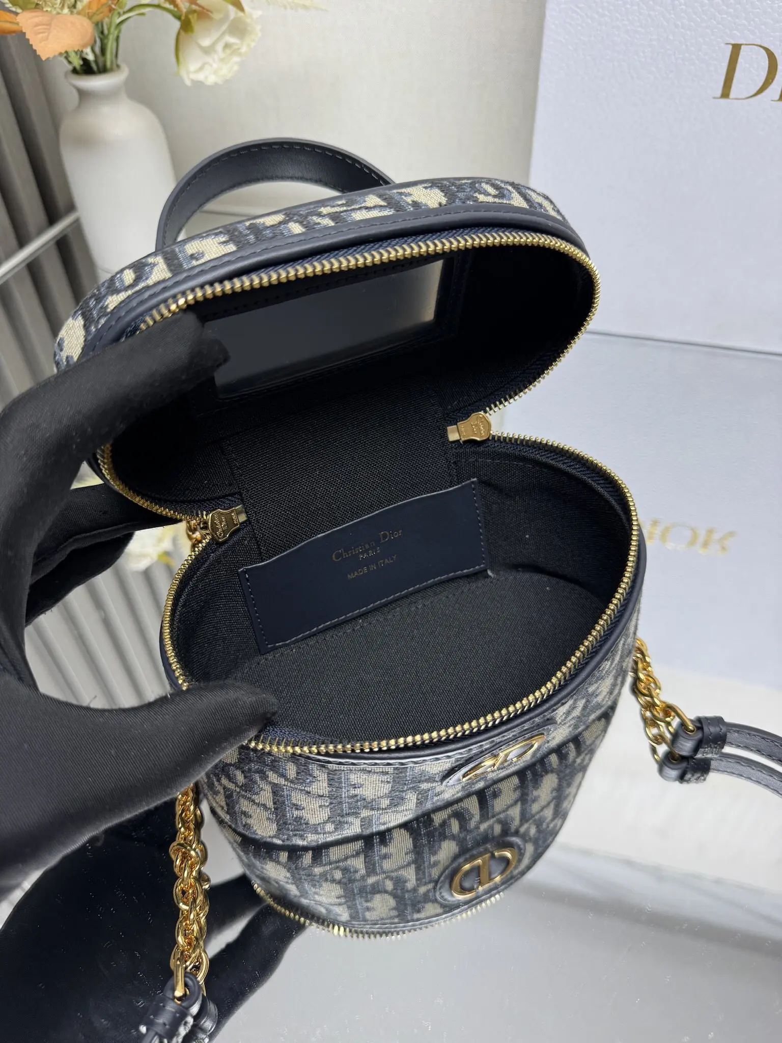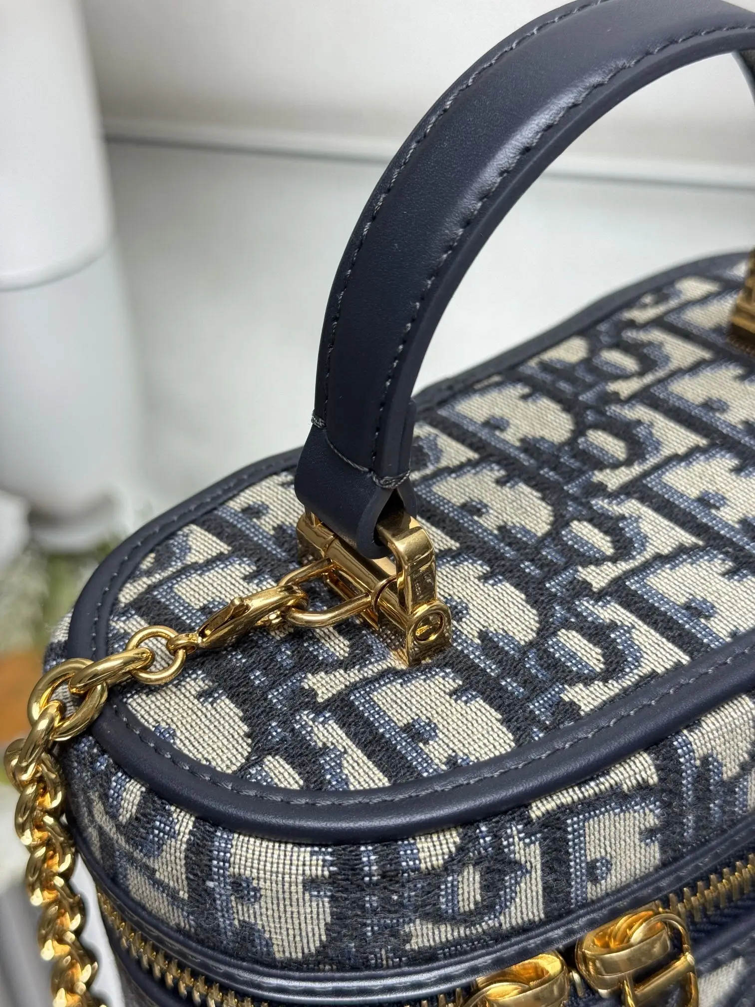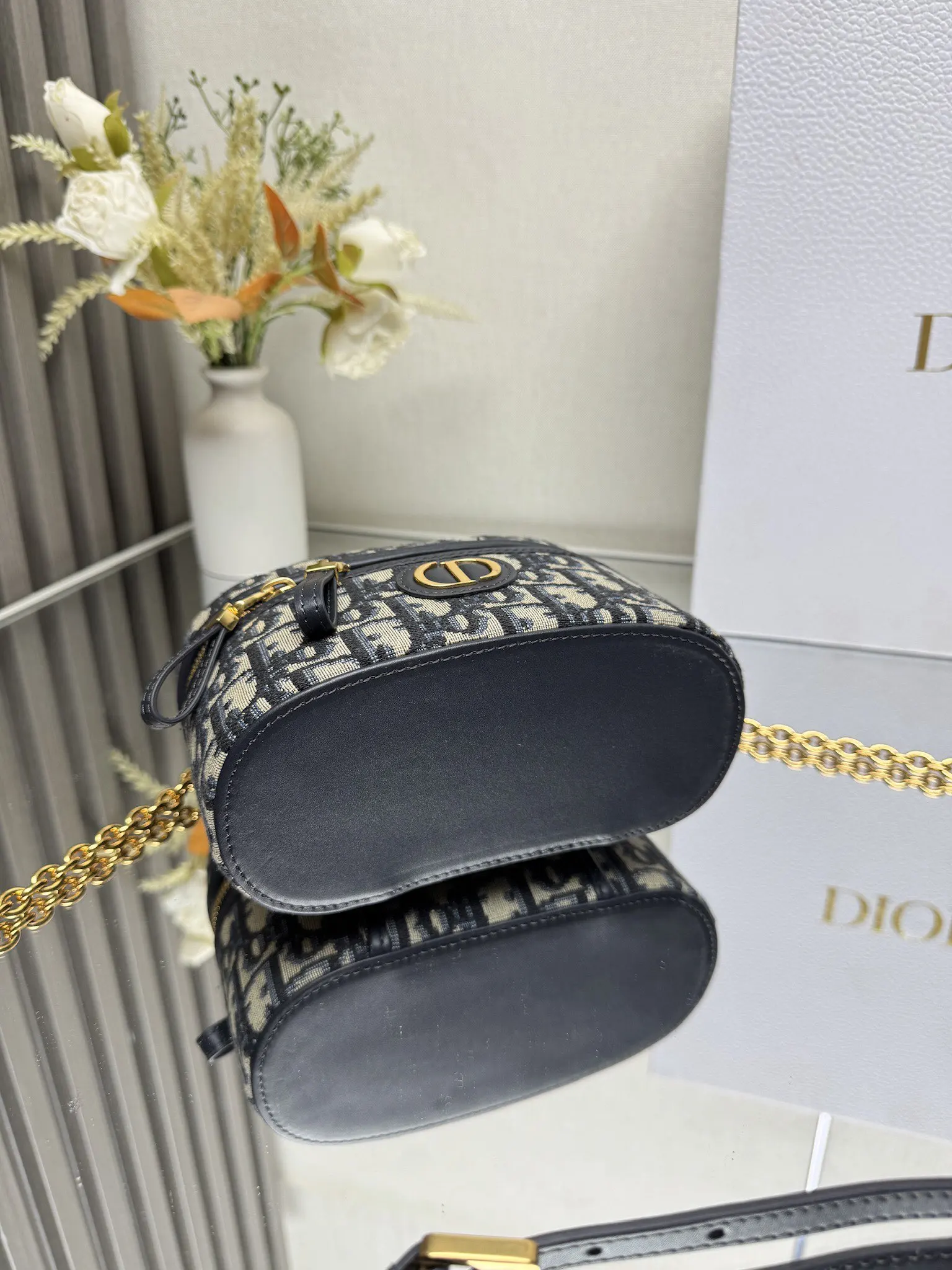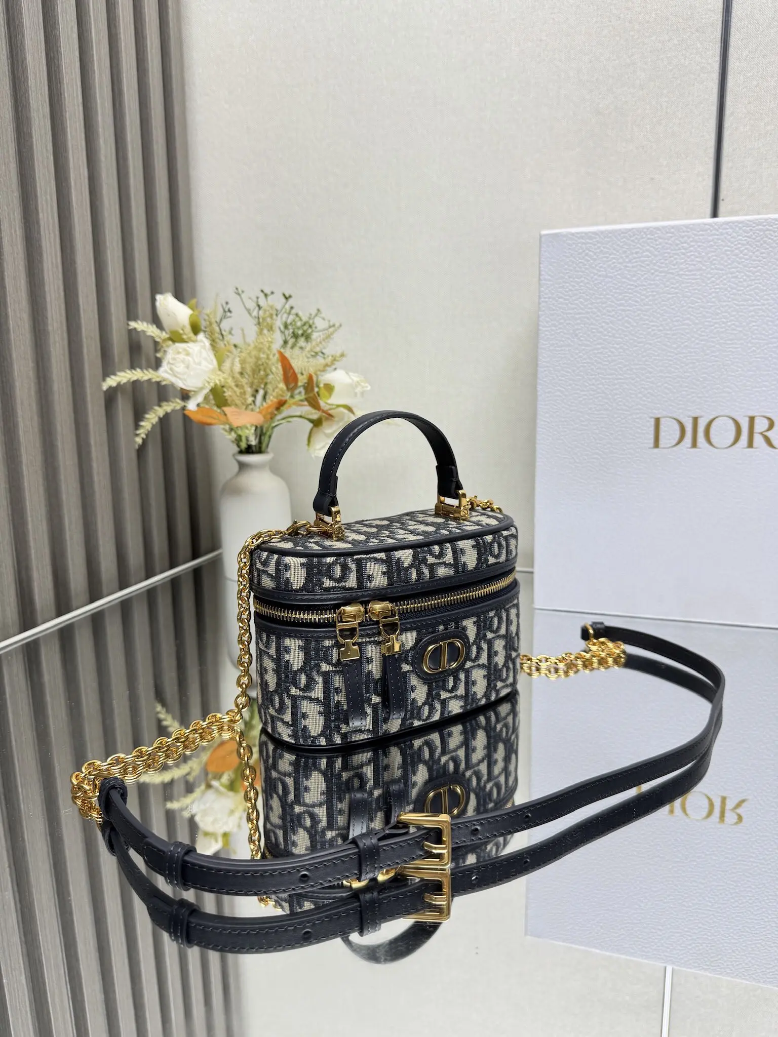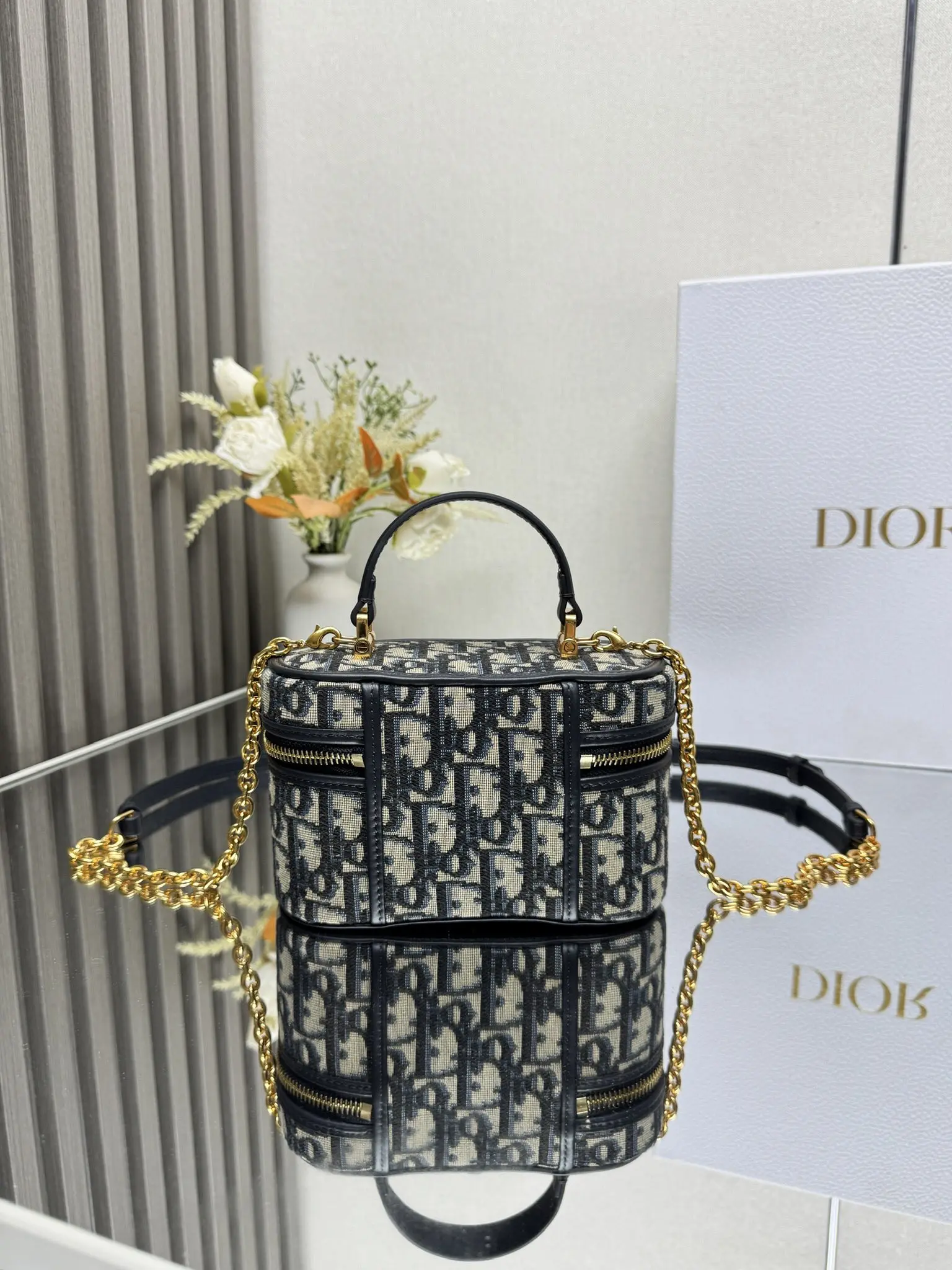 顶级原厂 Dior新款 30 Montaigne 迷你 Vanity 手袋 蓝布 采用蓝色 Oblique 印花面料精心制作 正面饰以 CD 标志提升格调 可通过手柄手提 搭配可调节肩带 以金色饰面金属和蓝色珐琅链环相间交错打造 饰以皮革镶片 可肩背或斜挎 型号 0820
