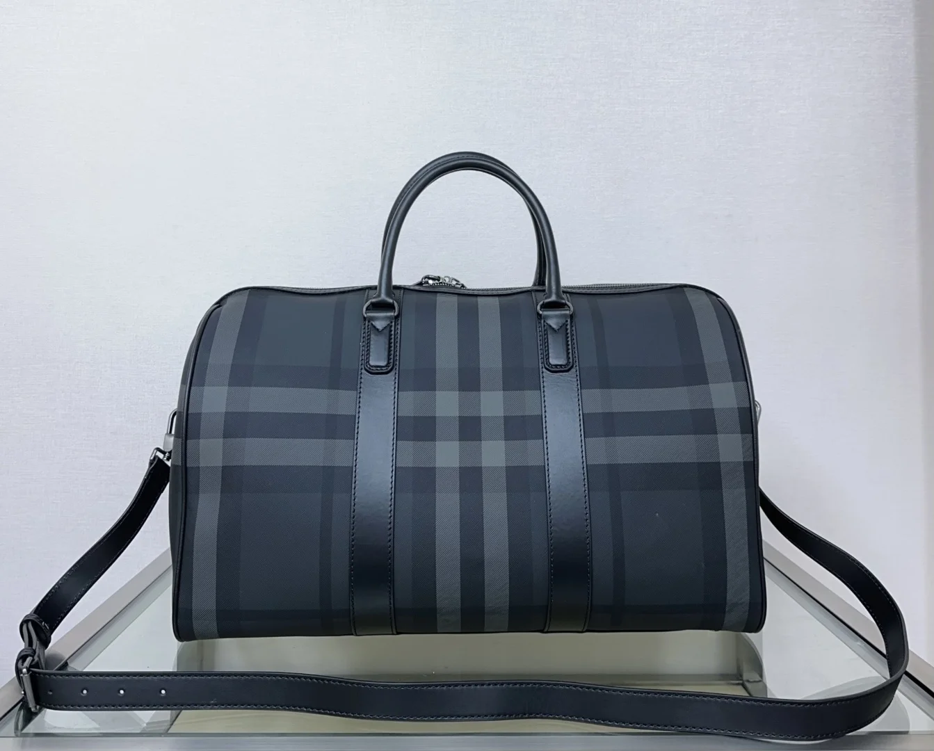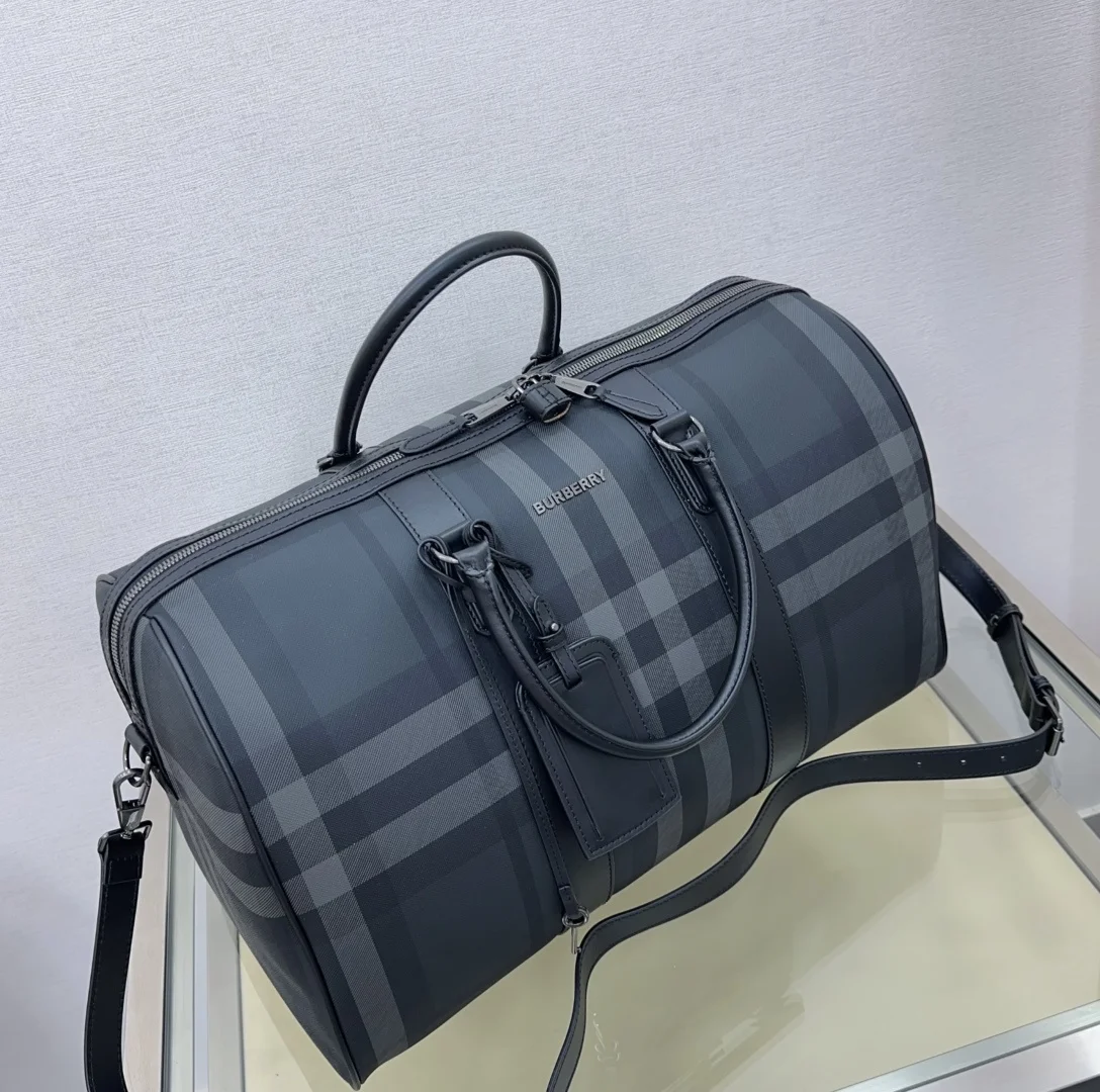 特级 空间充裕的旅行袋 B家最新灰色格纹 搭配行李吊牌和品牌徽标压花品牌Logo拉链开合可拆卸肩带 单肩斜挎手提包 木炭灰 低调奢华 尺寸50 x 25 x 27cm 型号0921