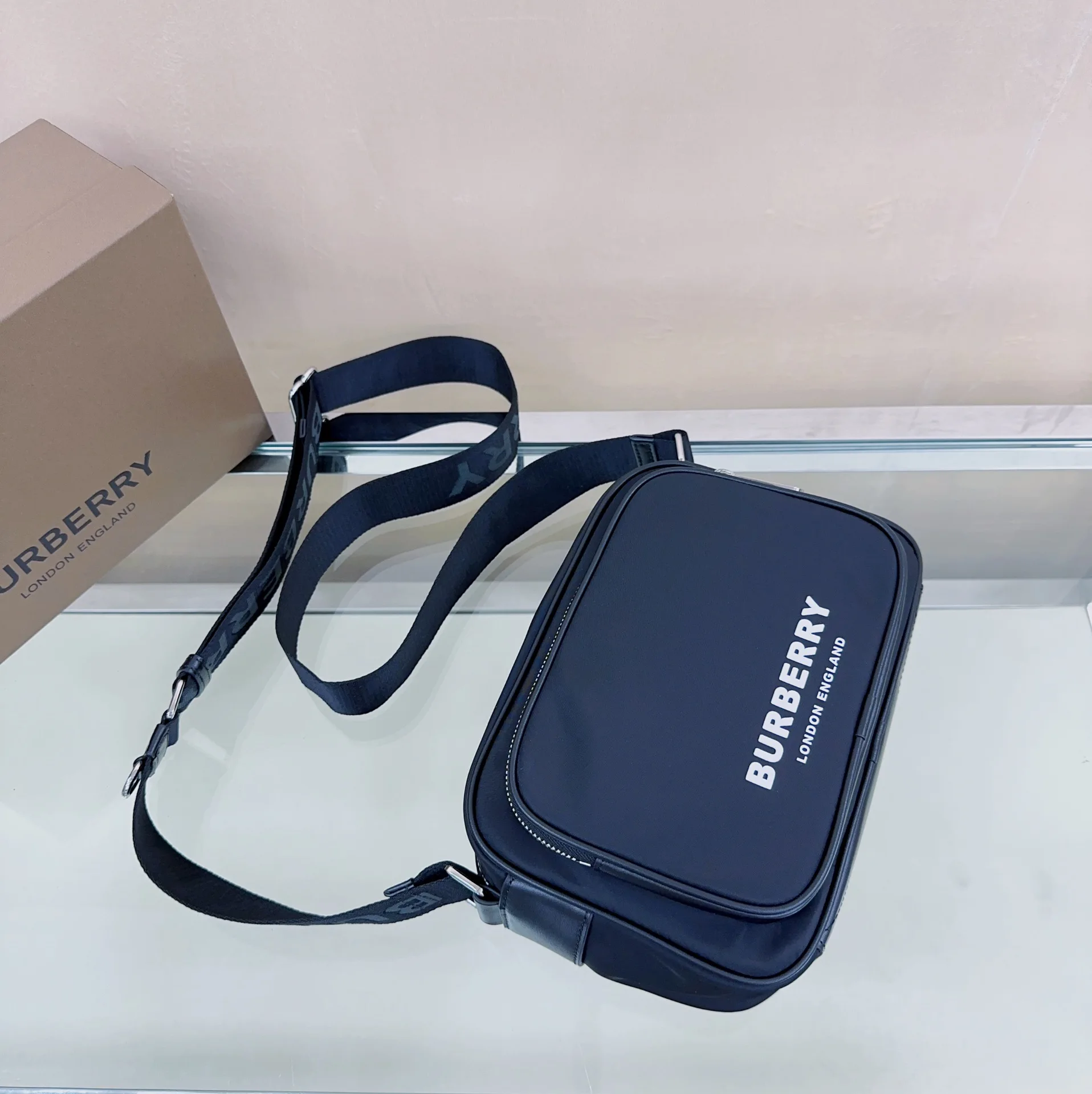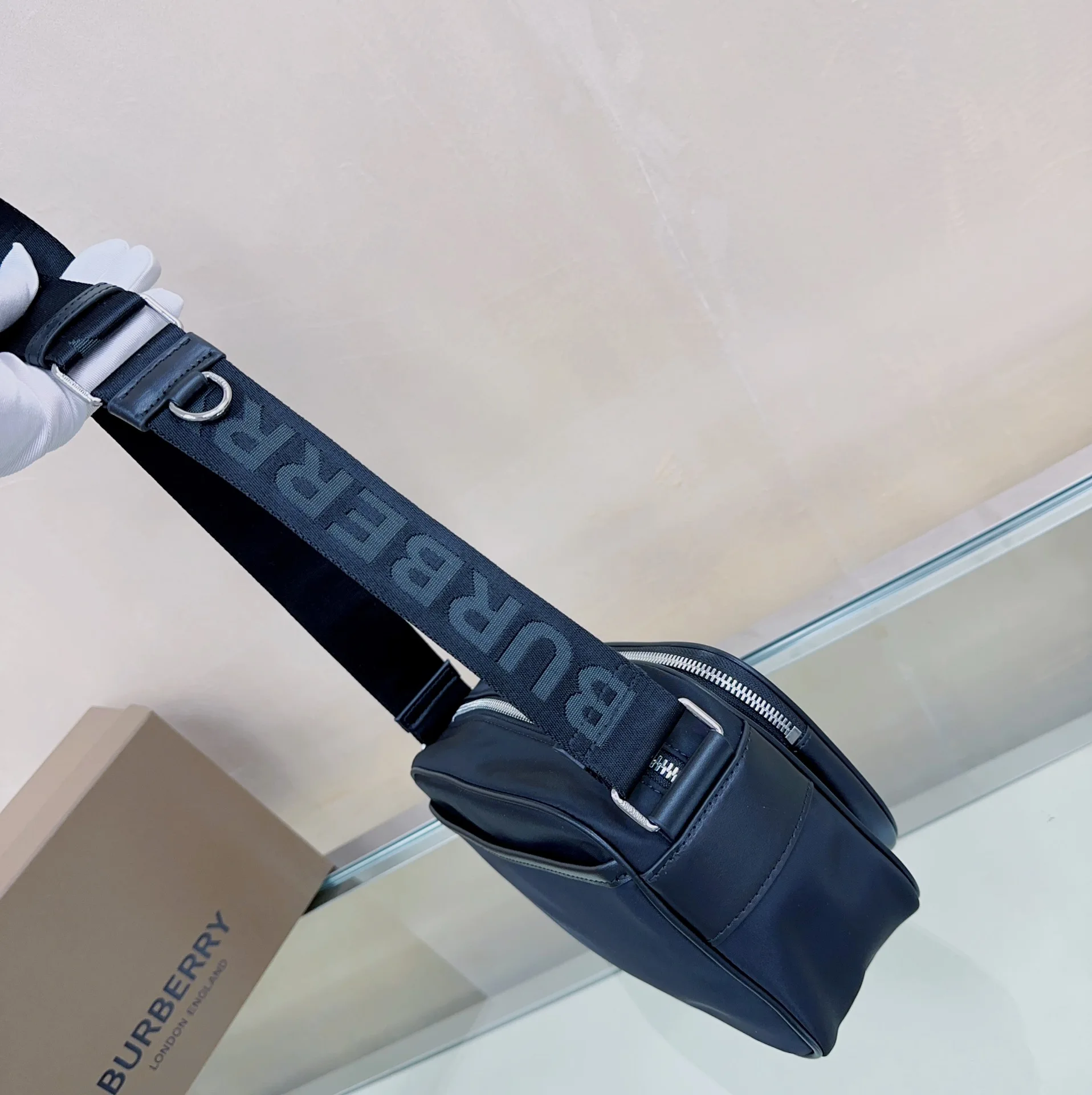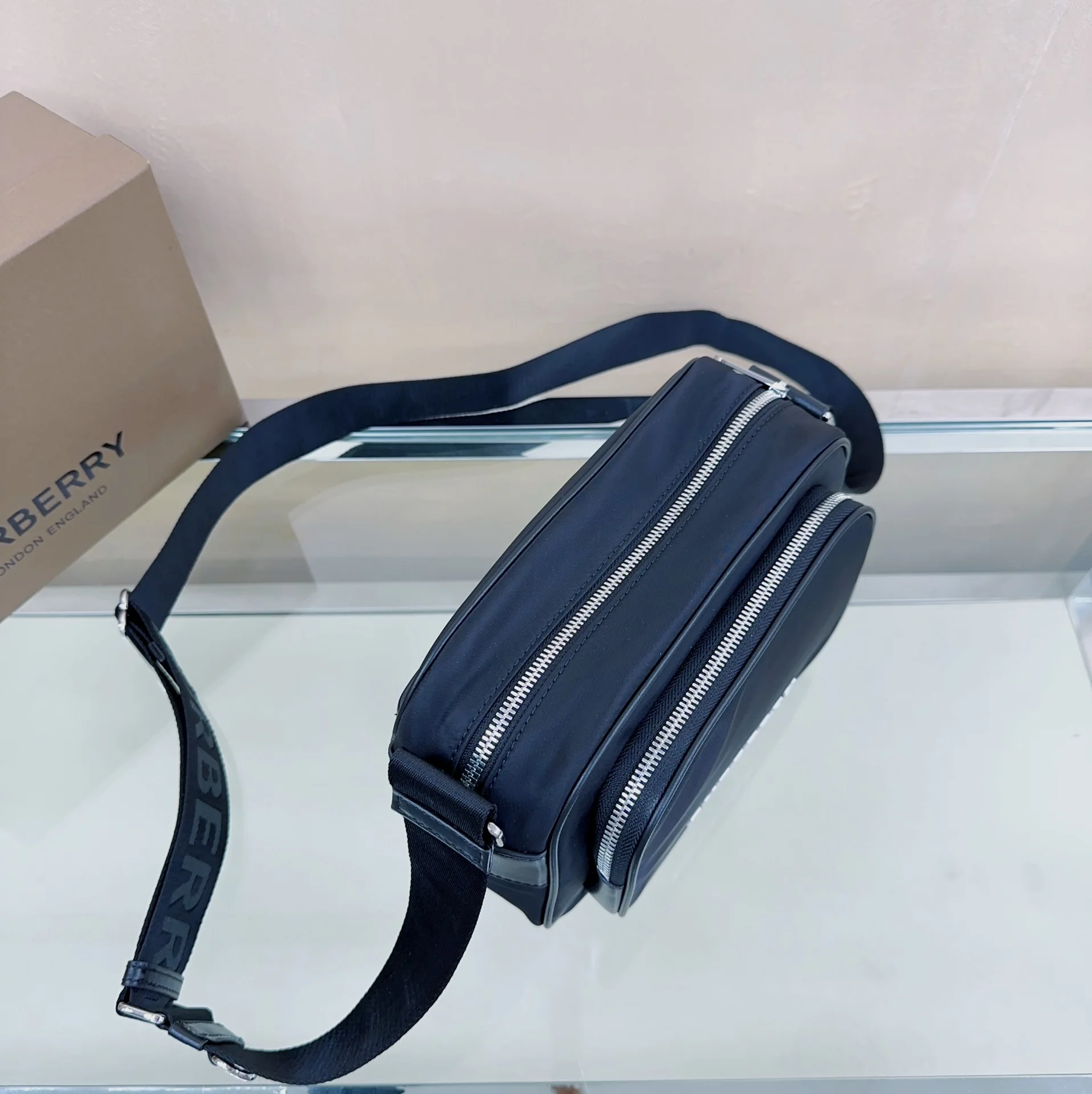 B家最新款斜背包 选用 ECONYL 材质裁片打造 装饰品牌徽标印花 可调式网纹尼龙背带处搭配提花精纺的 Burberry 字母徽标 ECONYL 是由再生的渔网 织物废料和工业塑料制成的可持续尼龙面料 22.5 x 6.5 x 16cm型号 0941