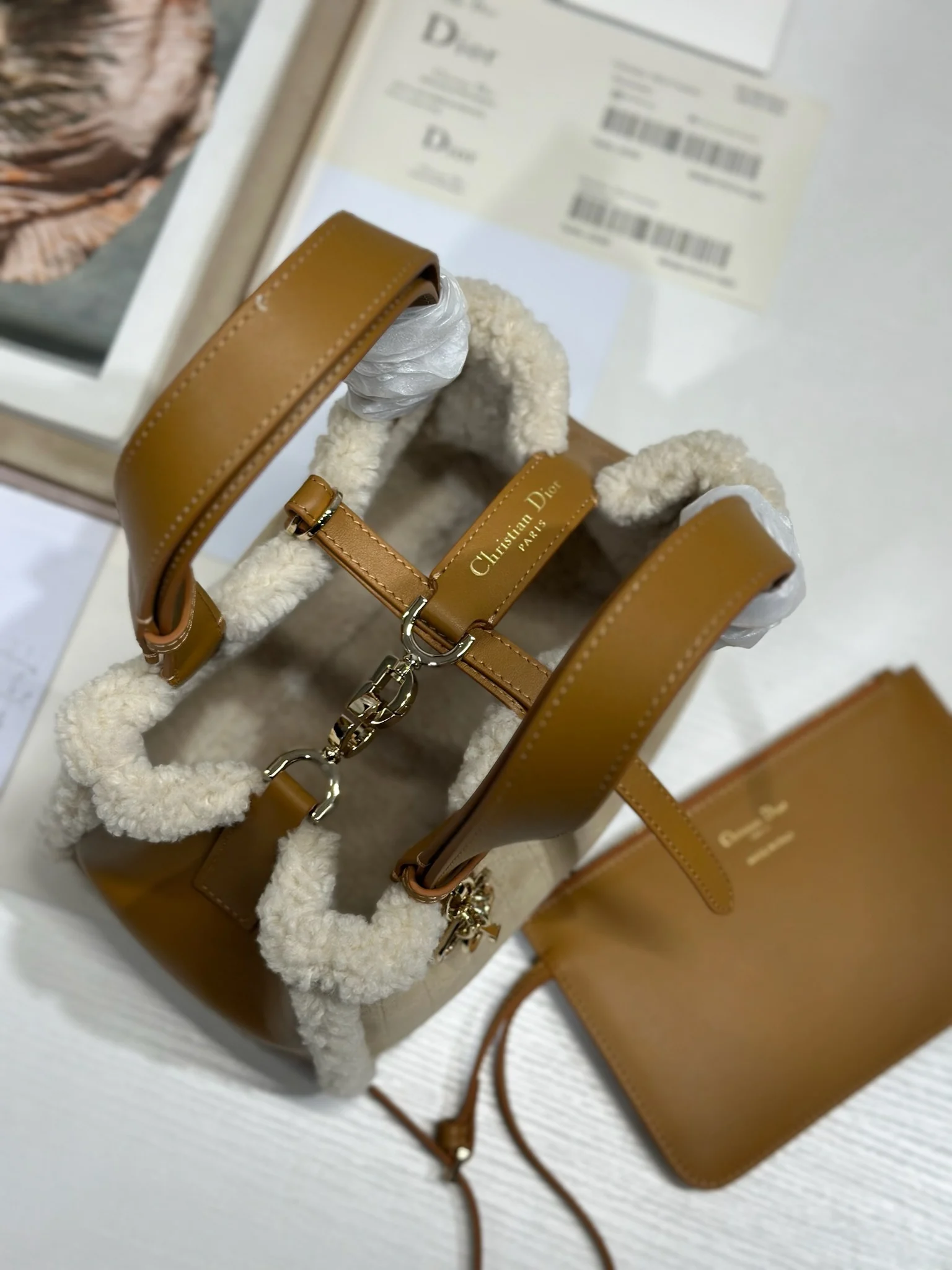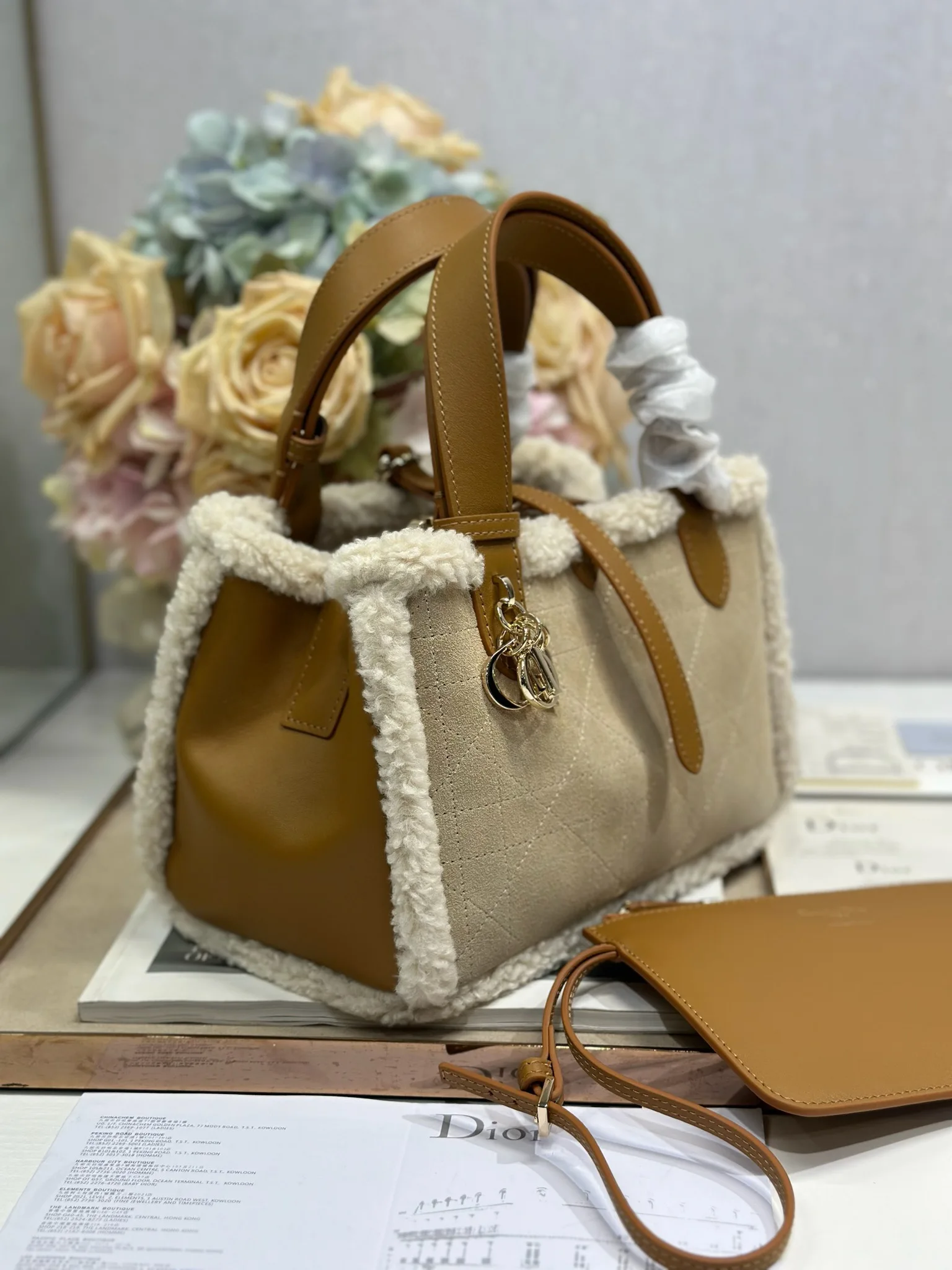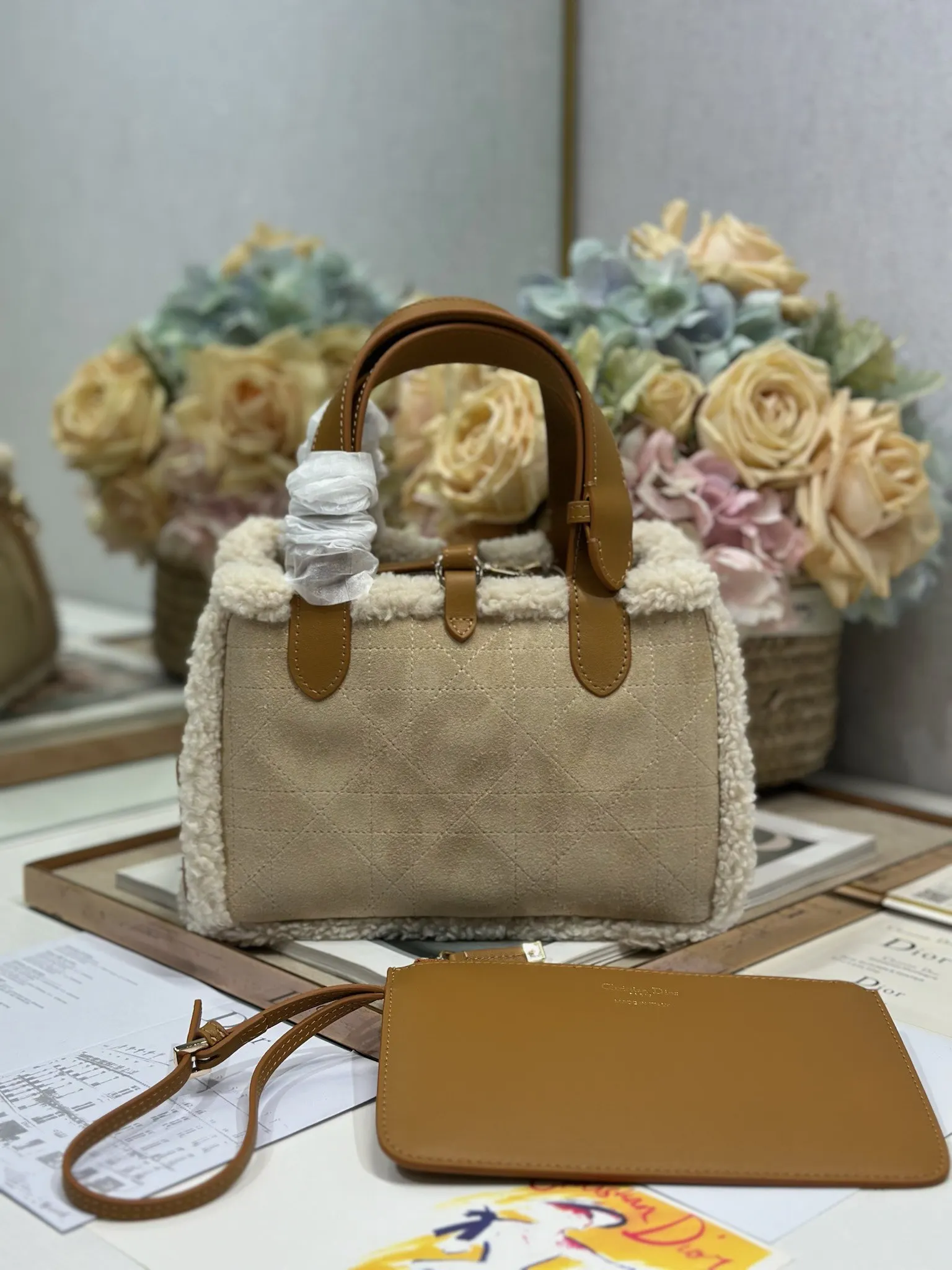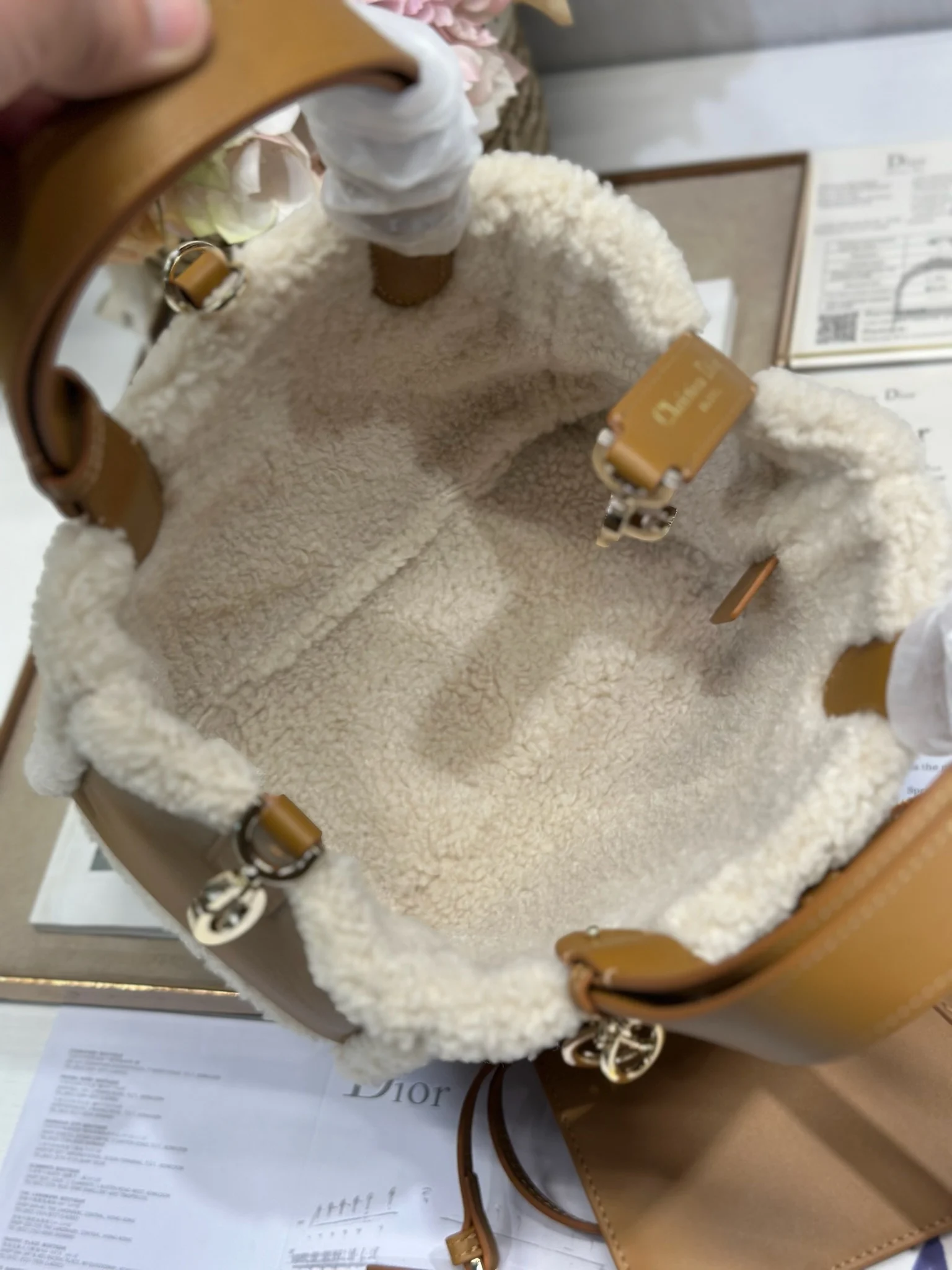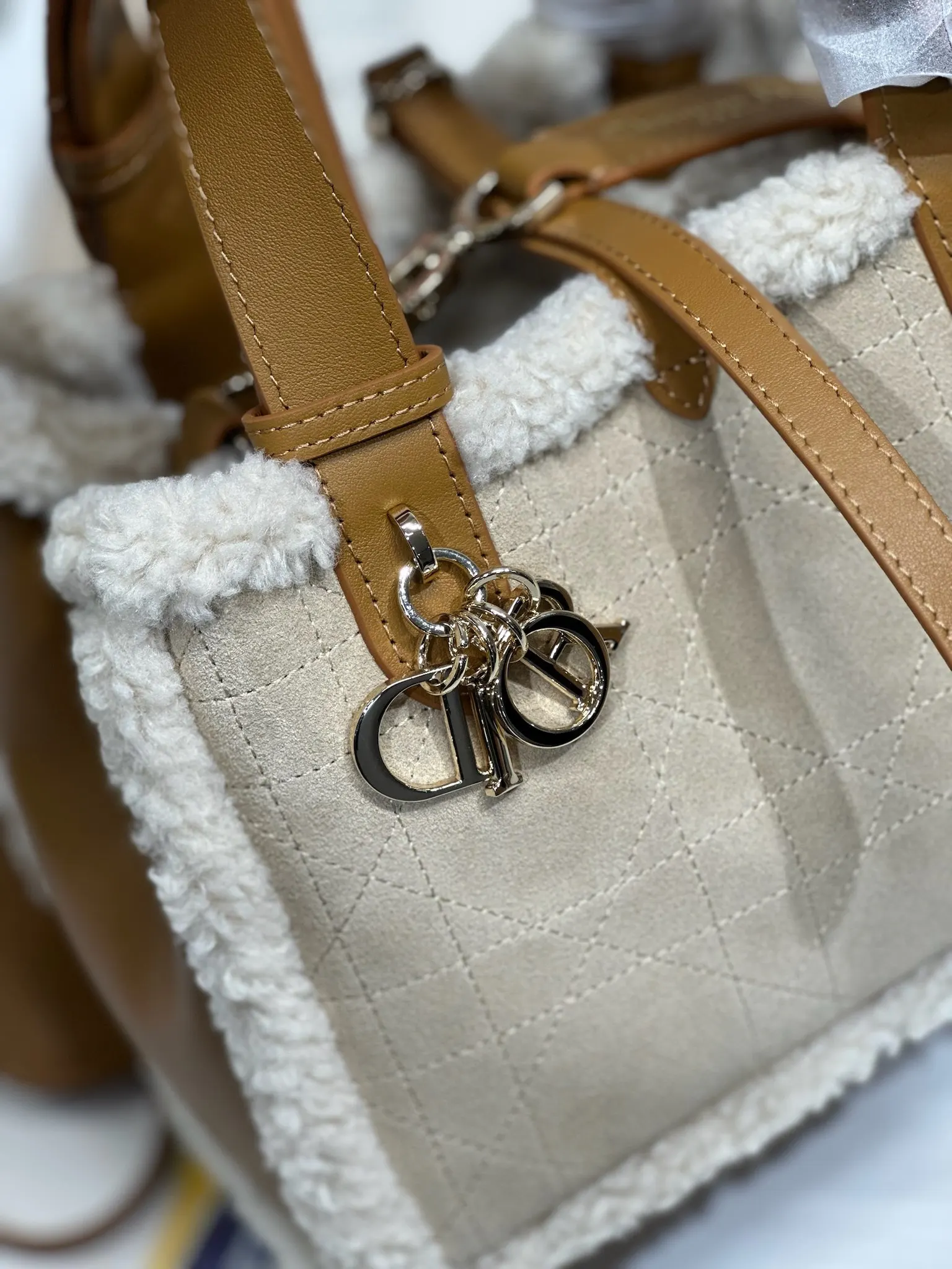 小号 D ior Toujours 手袋 牛绒拼皮 米色绒面革和棕色牛皮革皮毛一体 采用米色绒面革精心制作 饰以超大藤格纹缉面线 宽敞的内部隔层搭配小袋 可整齐收纳各种日常用品 设有皮革系带开合 可安全收纳各种物品 可轻松手提 型号 1188