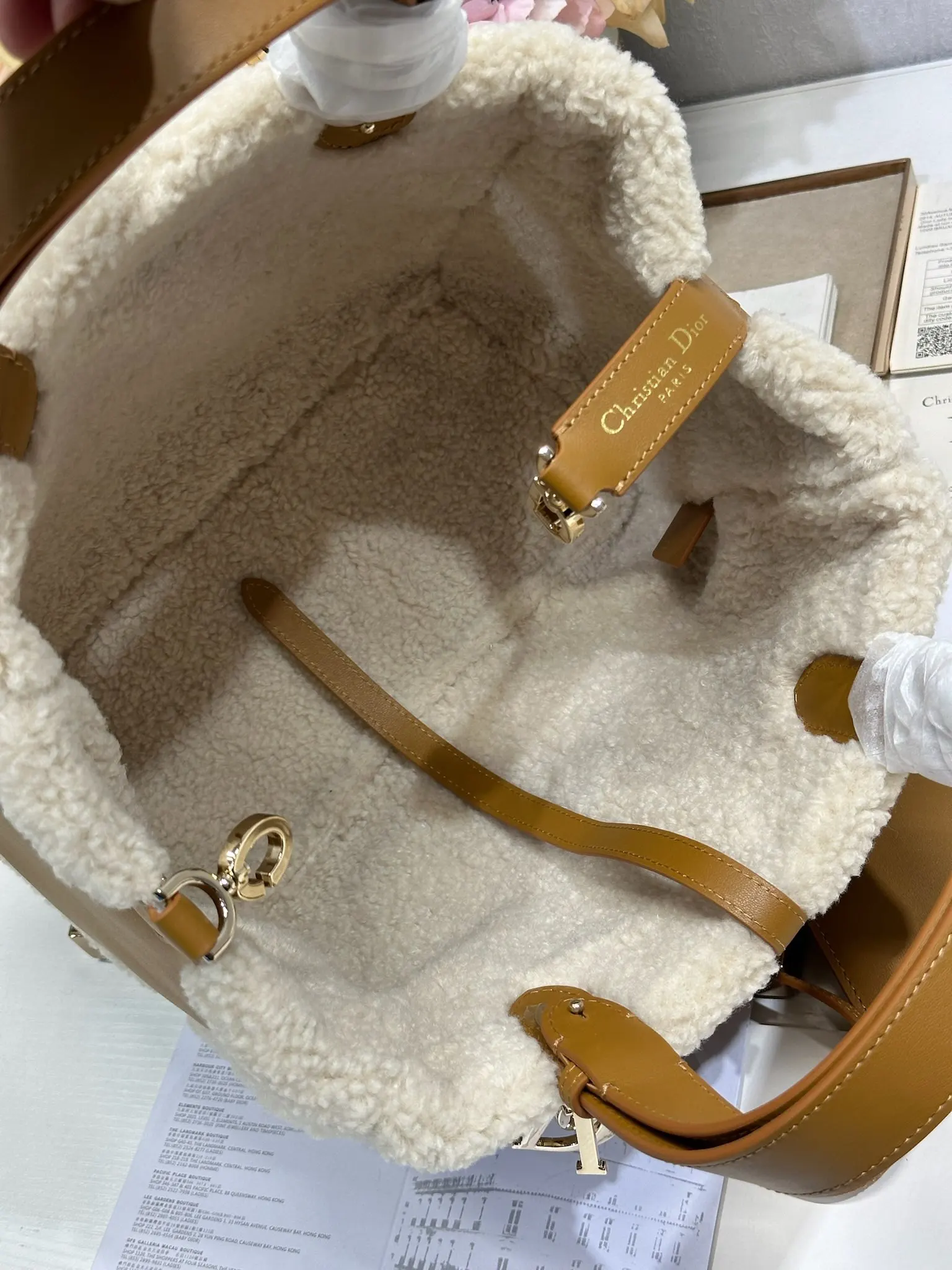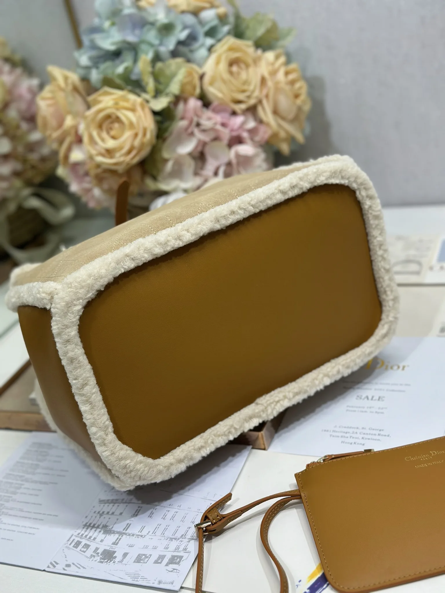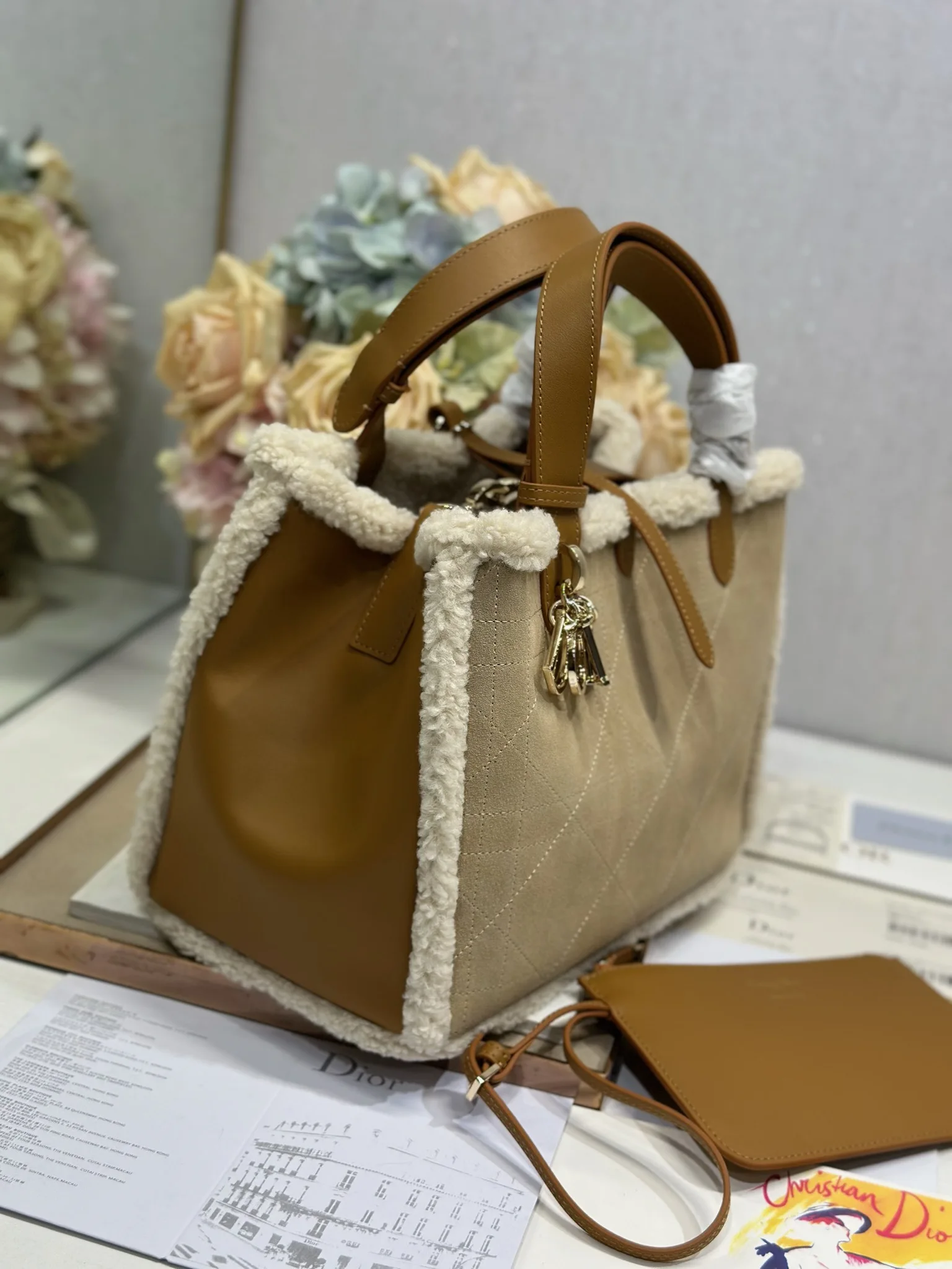 中号 D ior Toujours 手袋 牛绒拼皮 米色绒面革和棕色牛皮革皮毛一体 采用米色绒面革精心制作 饰以超大藤格纹缉面线 宽敞的内部隔层搭配小袋 可整齐收纳各种日常用品 中号款式 皮革手柄带有可调节细节 可轻松手提 型号 1188
