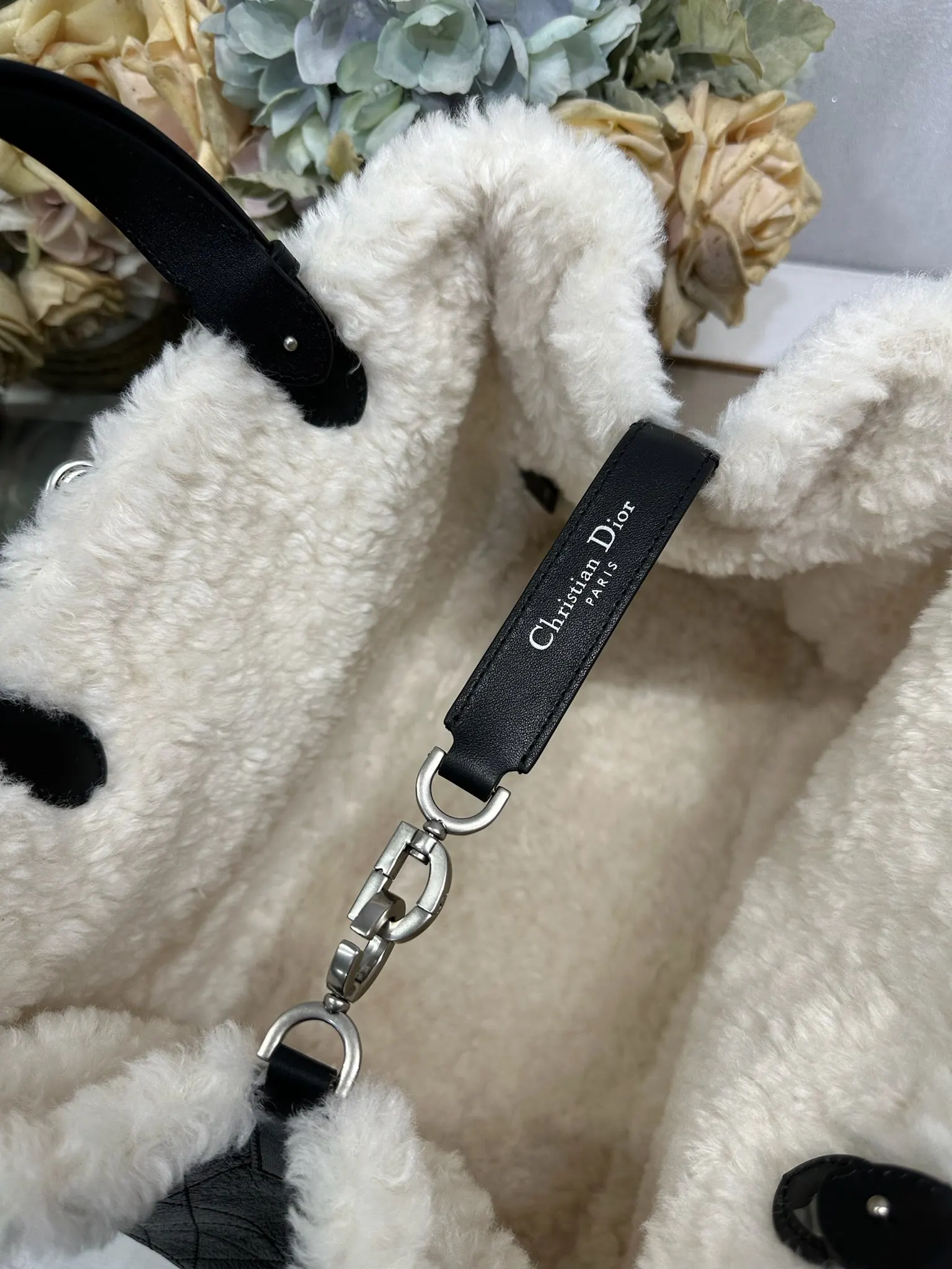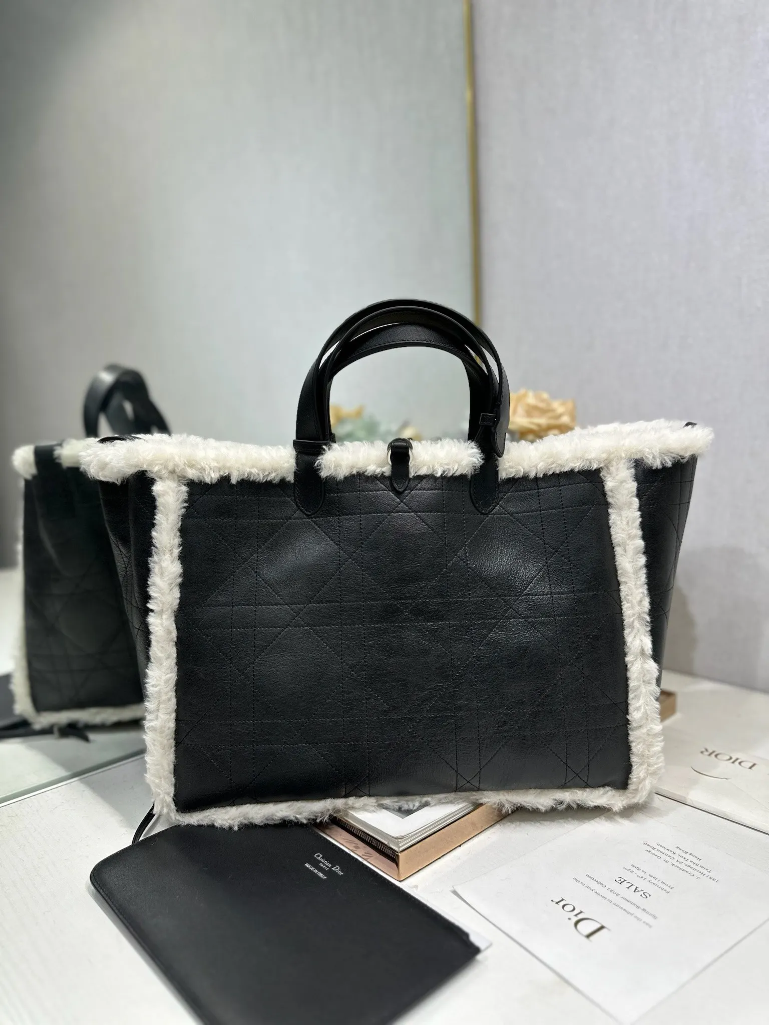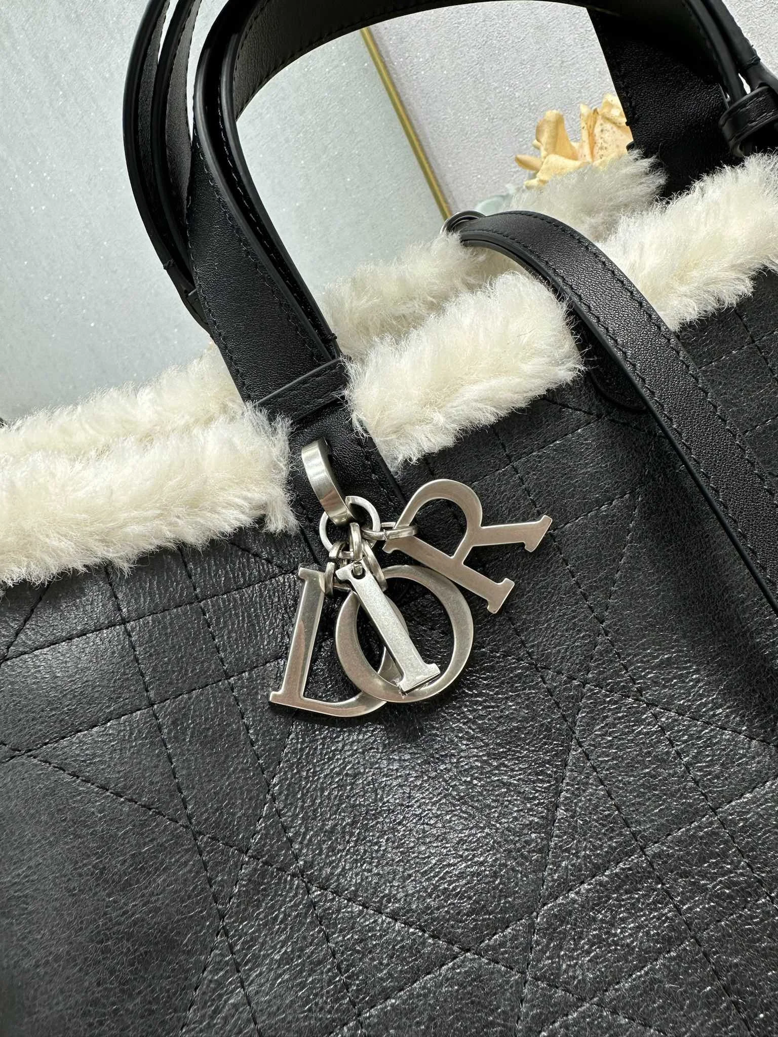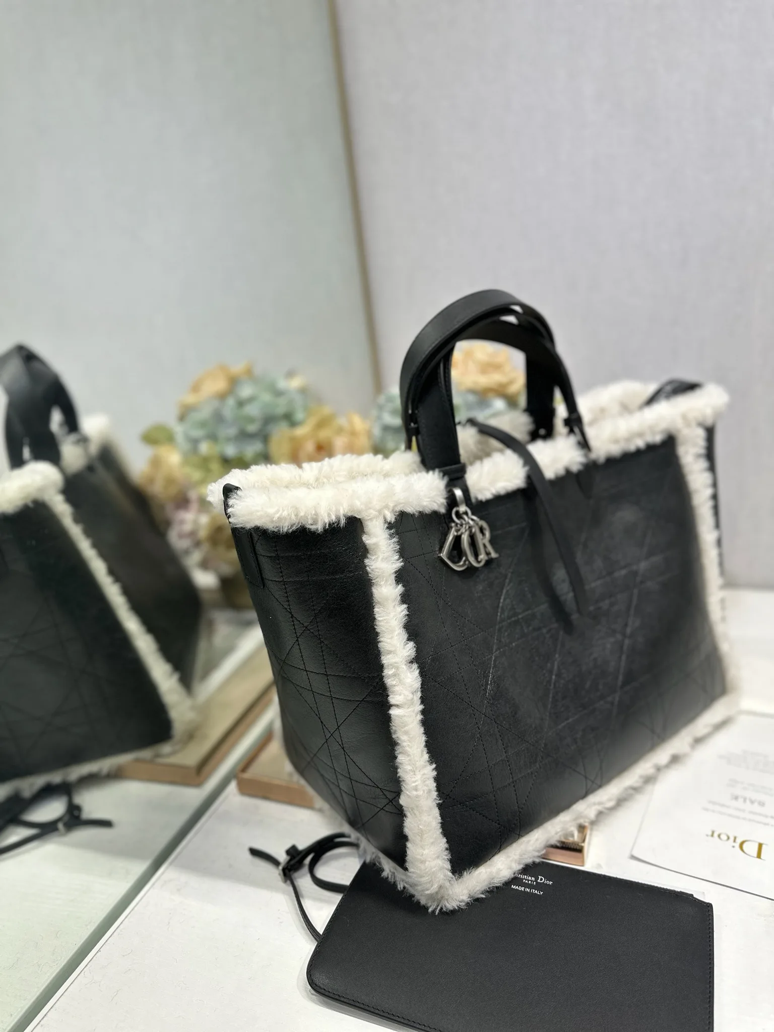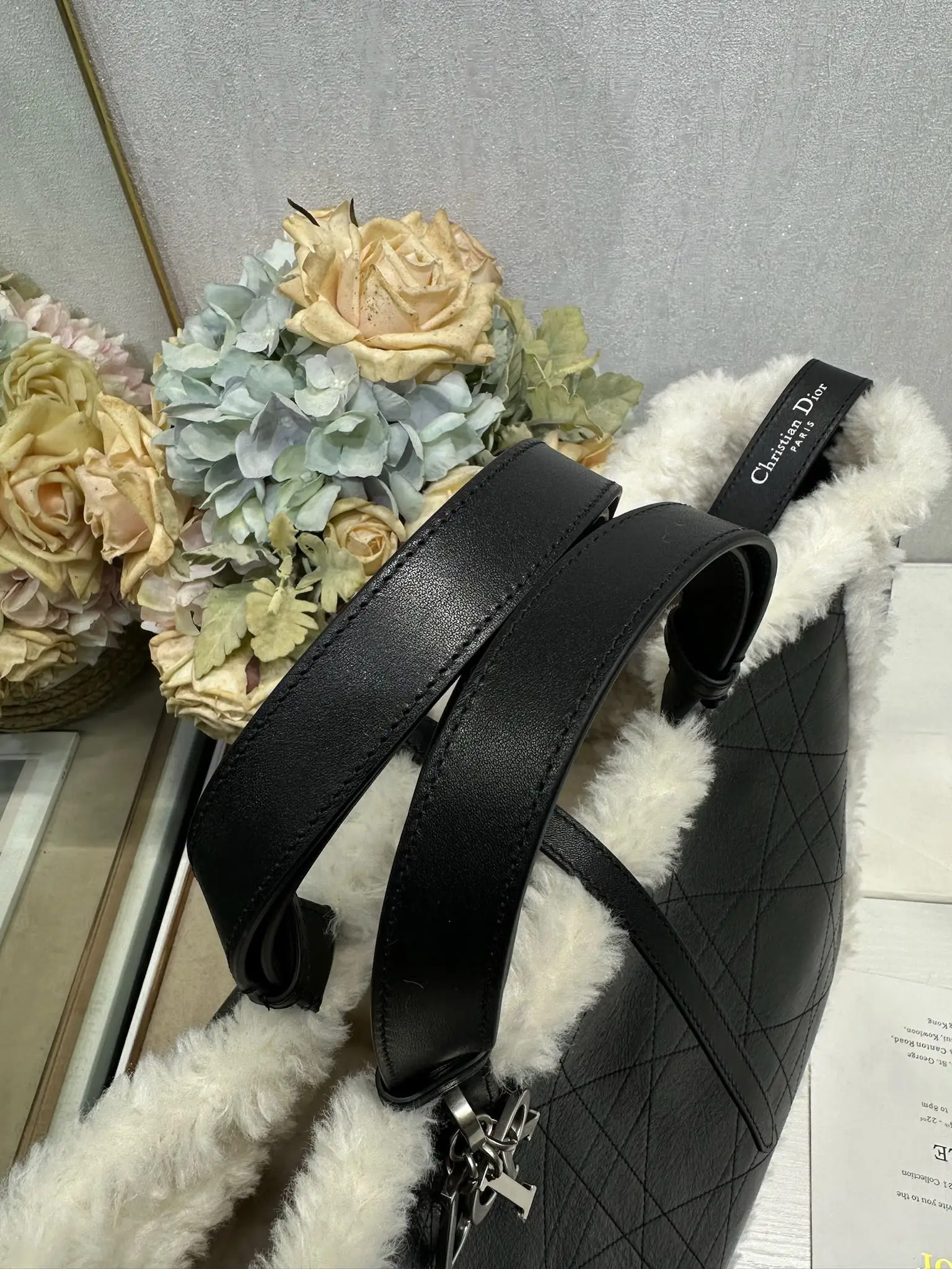 大号 D ior Toujours 手袋 灰黑裂纹拼白 黑色裂纹牛皮和白色山羊毛一体 采用裂纹黑色牛皮精心制作 饰以超大藤格纹缉面线 宽敞的内部隔层搭配小袋 可整齐收纳各种日常用品 大号款式 皮革手柄带有可调节细节 可轻松手提 型号 1188