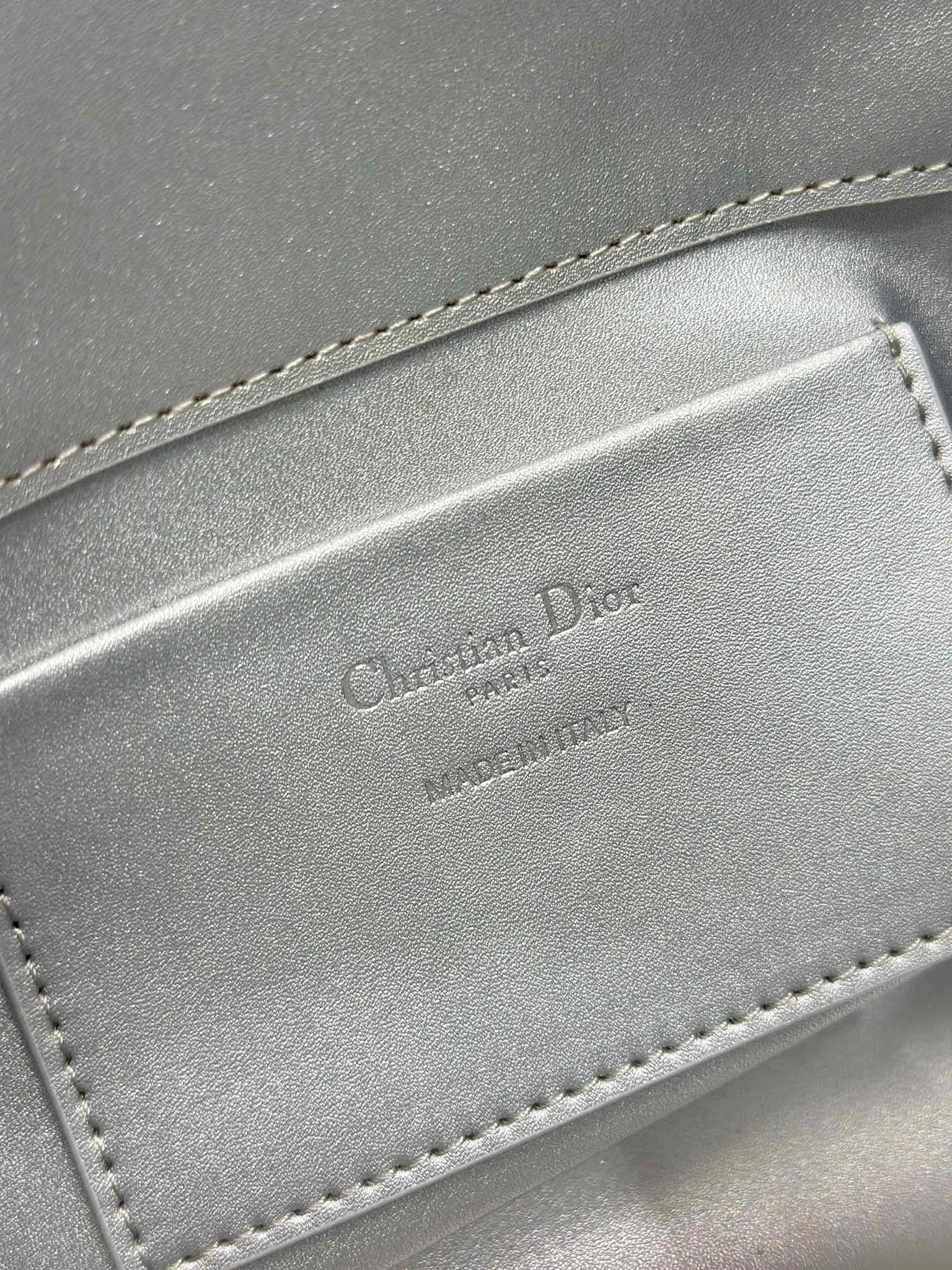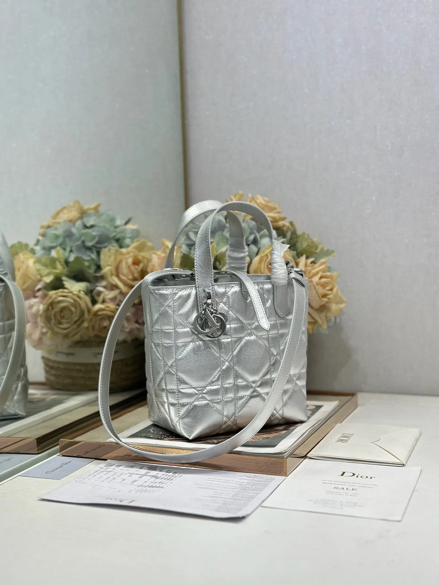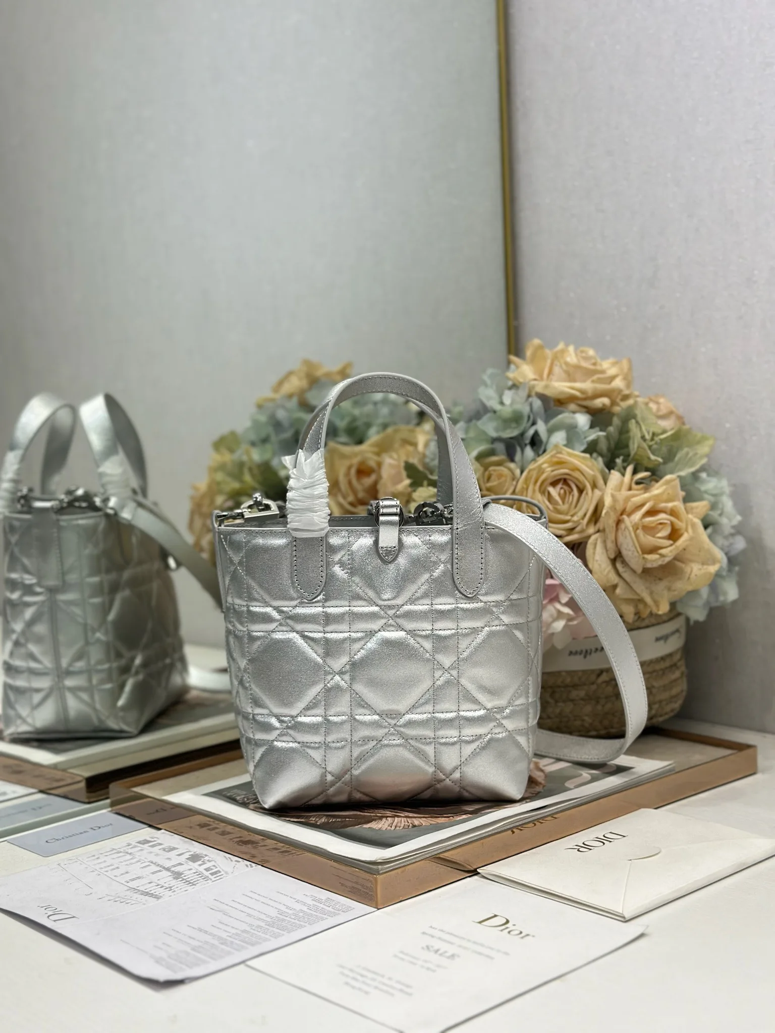 Dior Toujours 竖版手袋 银色 这款 Dior Toujours 竖版手袋时尚实用 别具一格 采用银色牛皮革精心制作 饰以超大藤格纹缉面线 宽敞的内部隔层可收纳各种日常用品 设有纤细皮革系带开合 可安全收纳各种物品 另有 CD Lock 字母 D 旋钮式扣环 可调节两侧 提升格调 小号款式 顶部皮革手柄搭配可拆卸的皮革肩带 可手提 肩背或斜挎 型号 2836