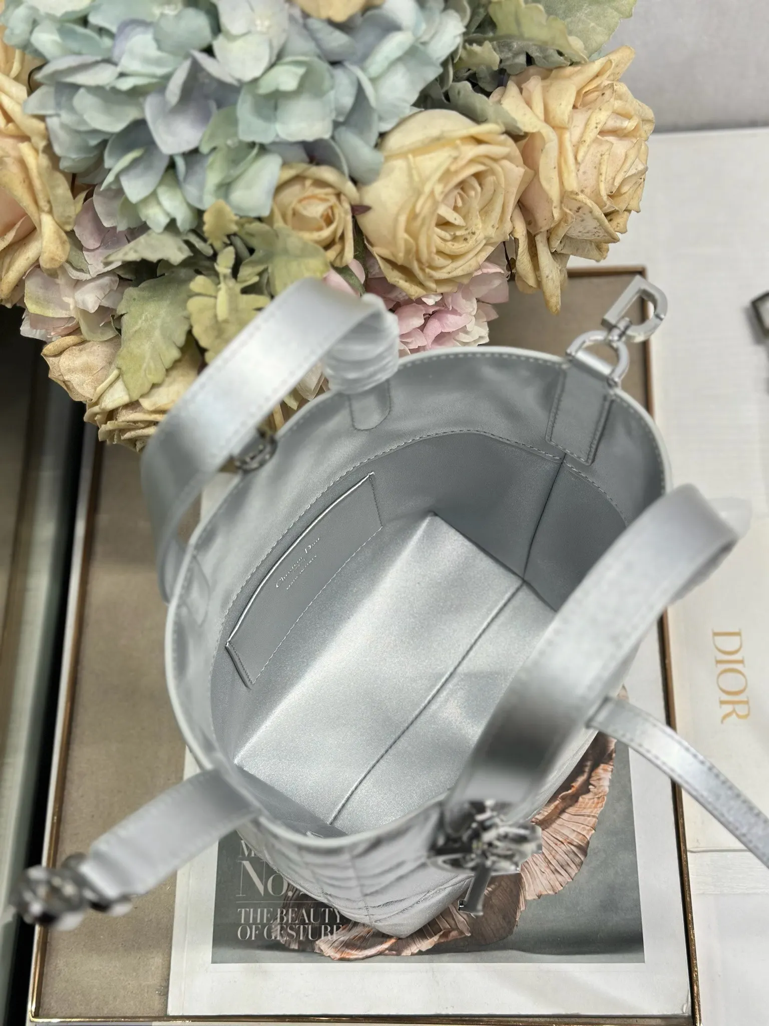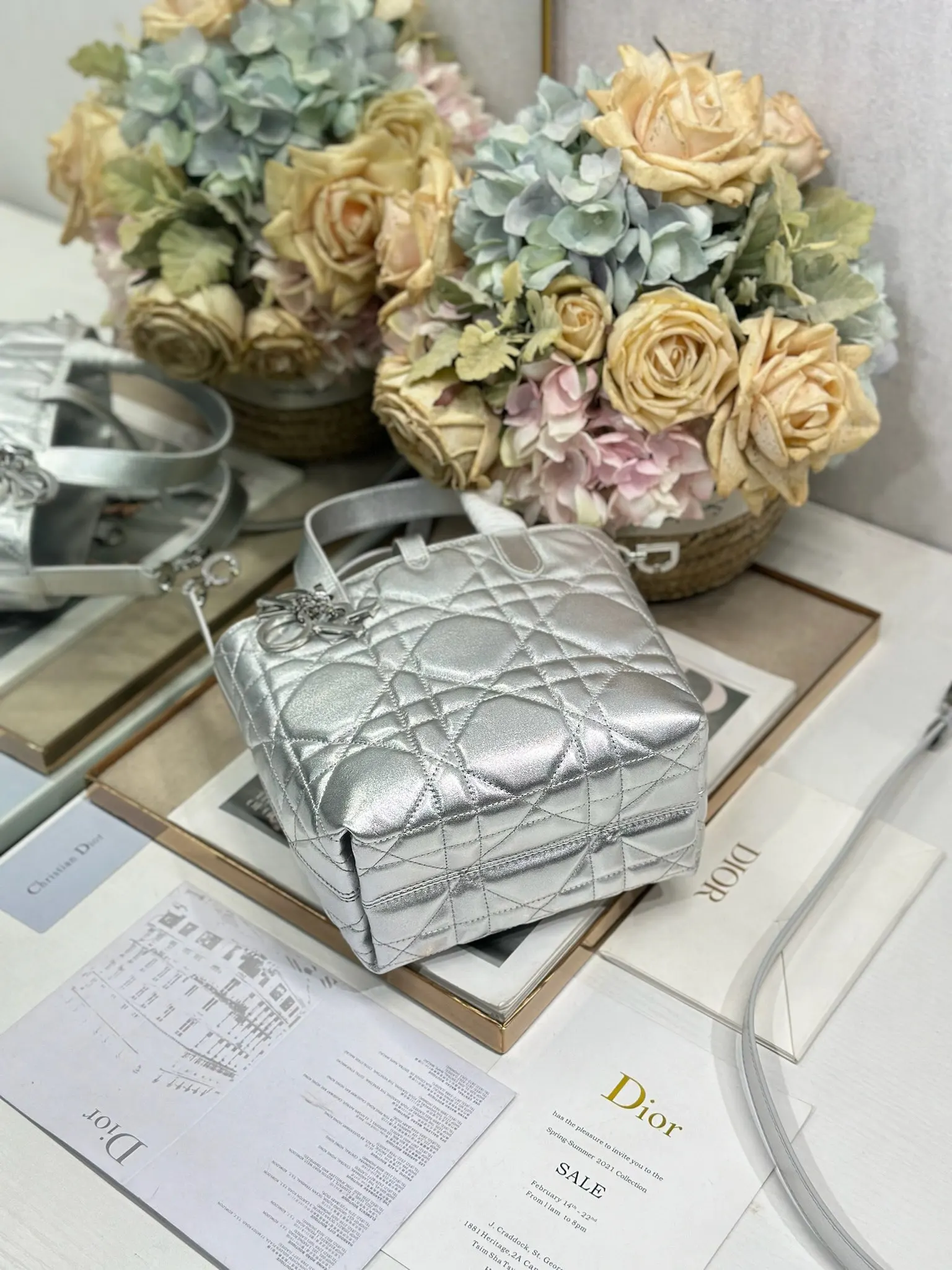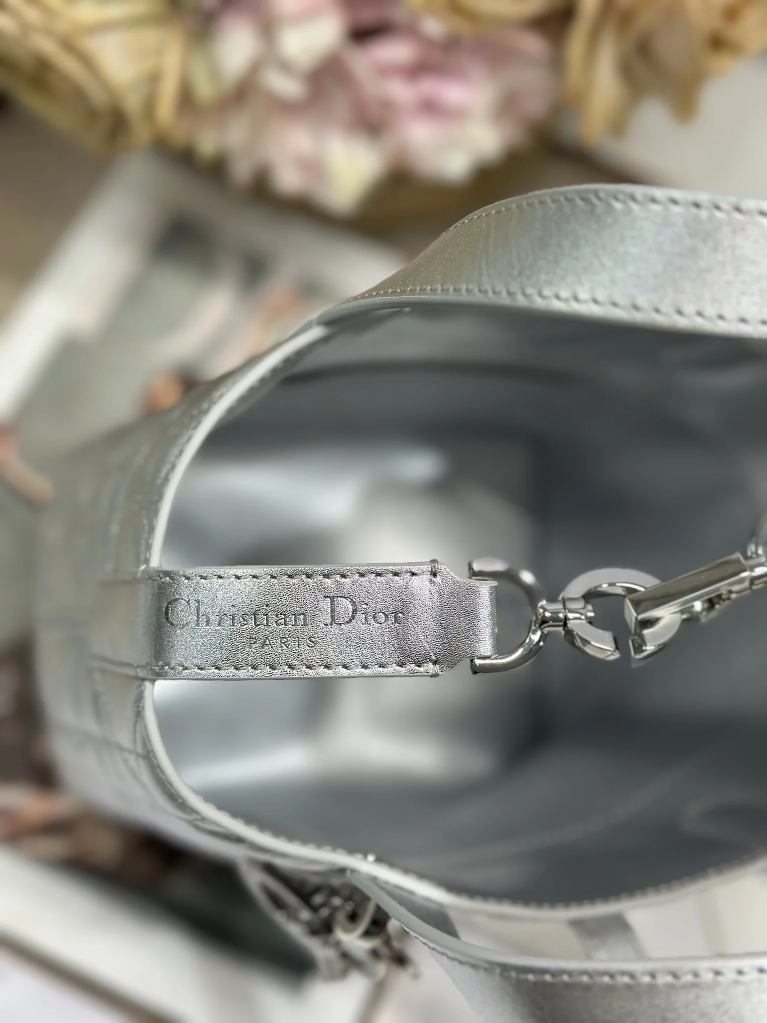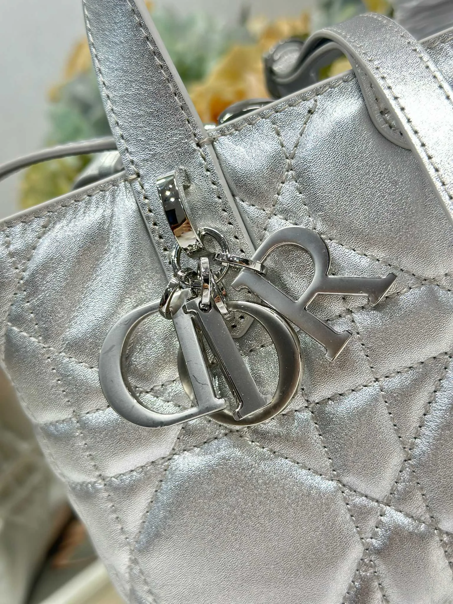 Dior Toujours 竖版手袋 银色 这款 Dior Toujours 竖版手袋时尚实用 别具一格 采用银色牛皮革精心制作 饰以超大藤格纹缉面线 宽敞的内部隔层可收纳各种日常用品 设有纤细皮革系带开合 可安全收纳各种物品 另有 CD Lock 字母 D 旋钮式扣环 可调节两侧 提升格调 小号款式 顶部皮革手柄搭配可拆卸的皮革肩带 可手提 肩背或斜挎 型号 2836