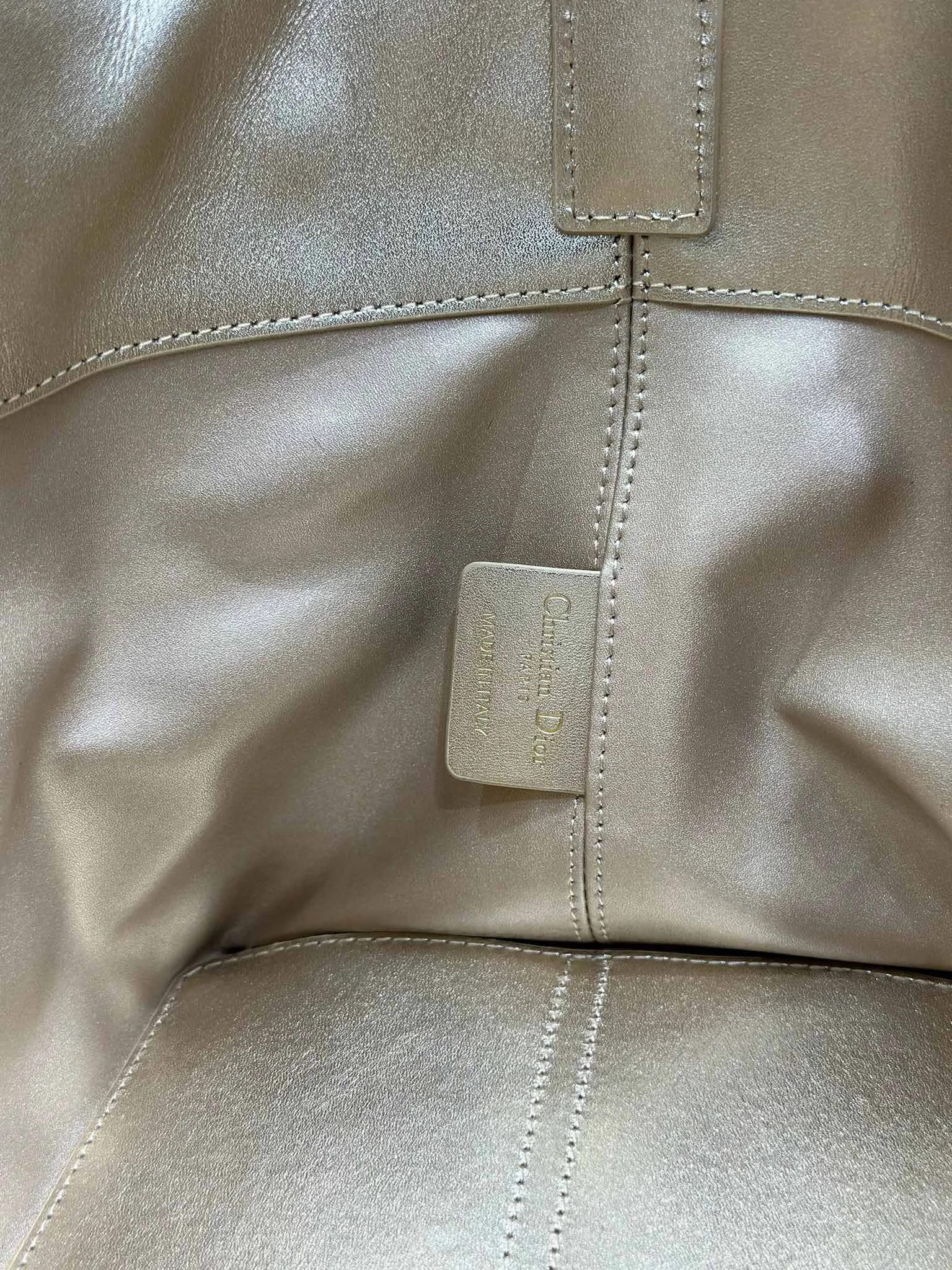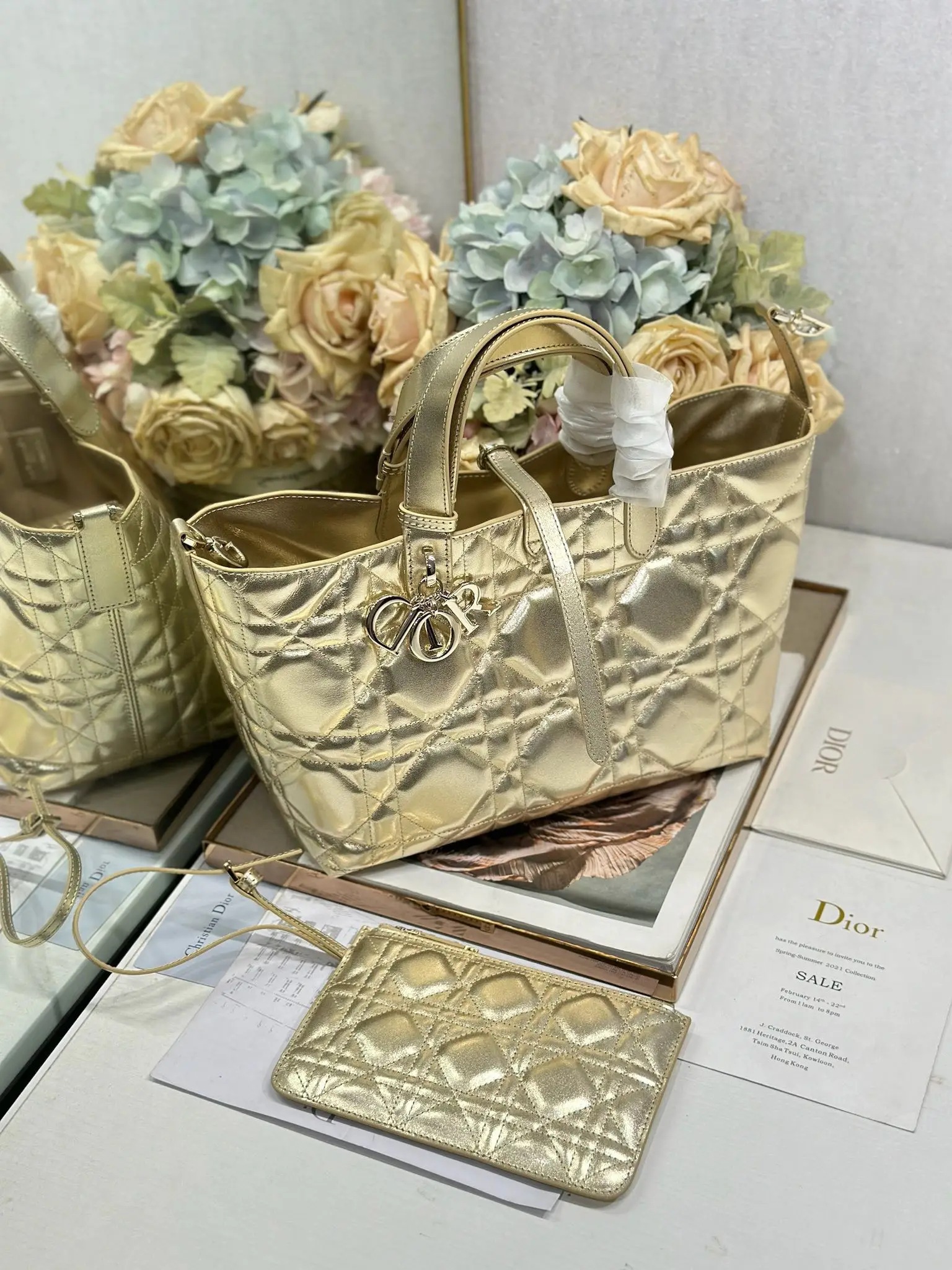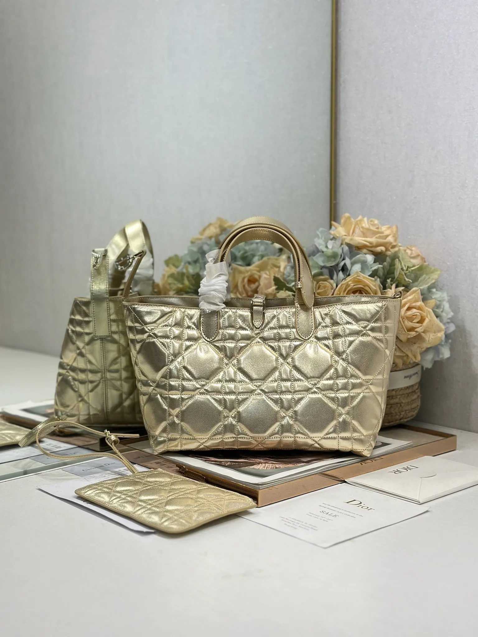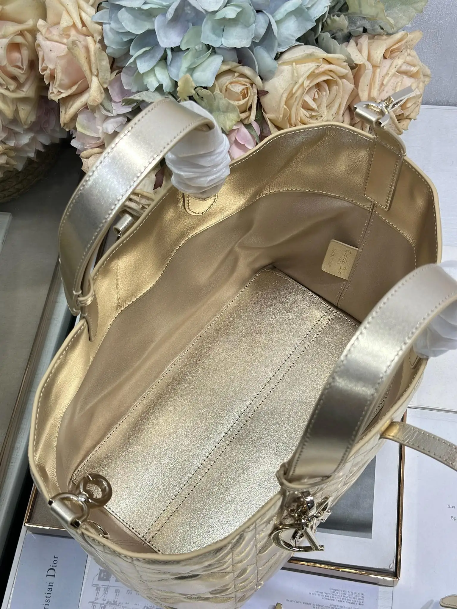 DiorToujours 手袋 金色中号 这款Dior Toujours 手袋采用金色牛皮革精心制作,饰以超大藤格纹缉面线,宽敞的内部隔层搭配小袋,可整齐收纳各种日常用品,另有CD Lock 字母D旋钮式开合,可调节两侧,提升格调.皮革手柄带有可调节细节细节,可轻松手提. CD Lock和系带开合 DIOR吊饰 可拆卸内部小袋 可调节皮革手柄 内含防尘袋