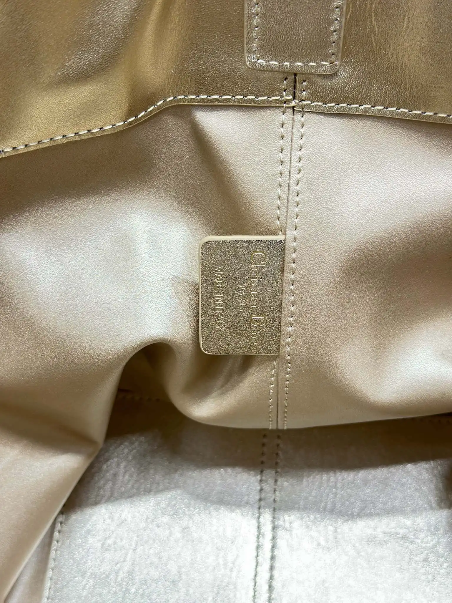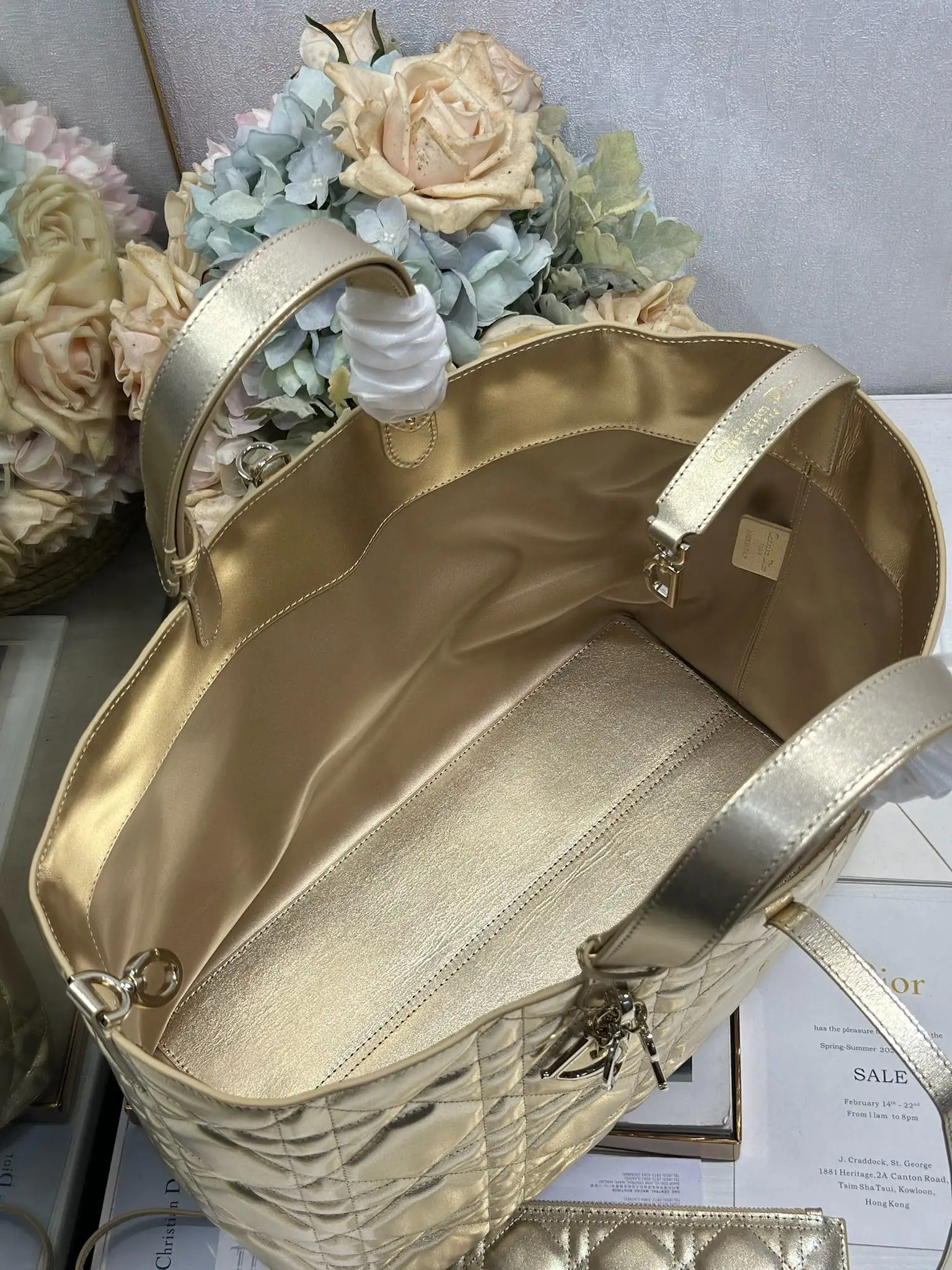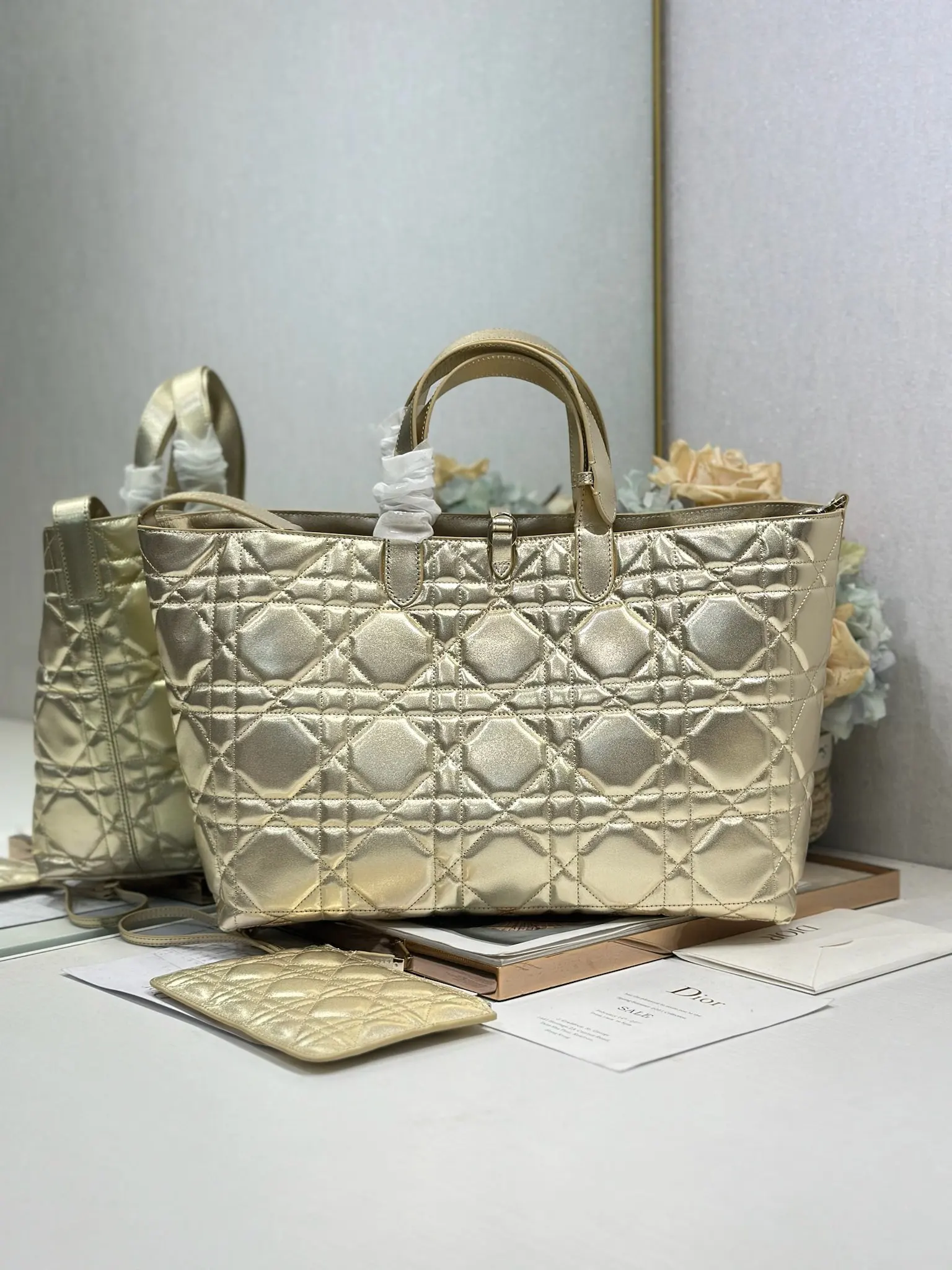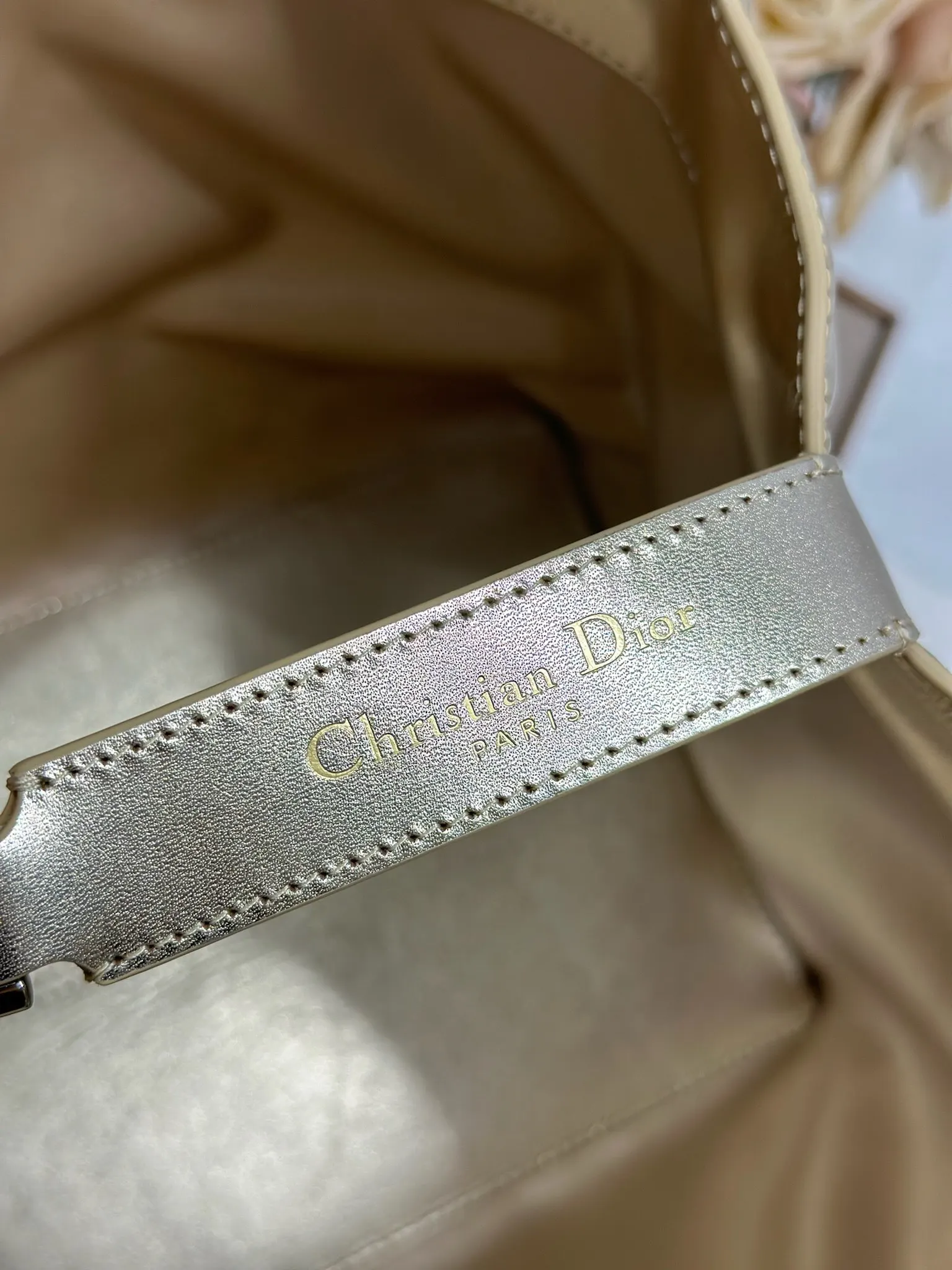 DIORTOUJOURS 手袋 金色大号 这款 Dior Toujours 休闲实用的设计别具一格 采用金色牛皮革精心制作 饰以超大藤格纹缉面线 宽敞的内部隔层搭配小袋 可整齐收纳各种日常用品 大号款式 皮革手柄带有可调节细节 可手提或肩背