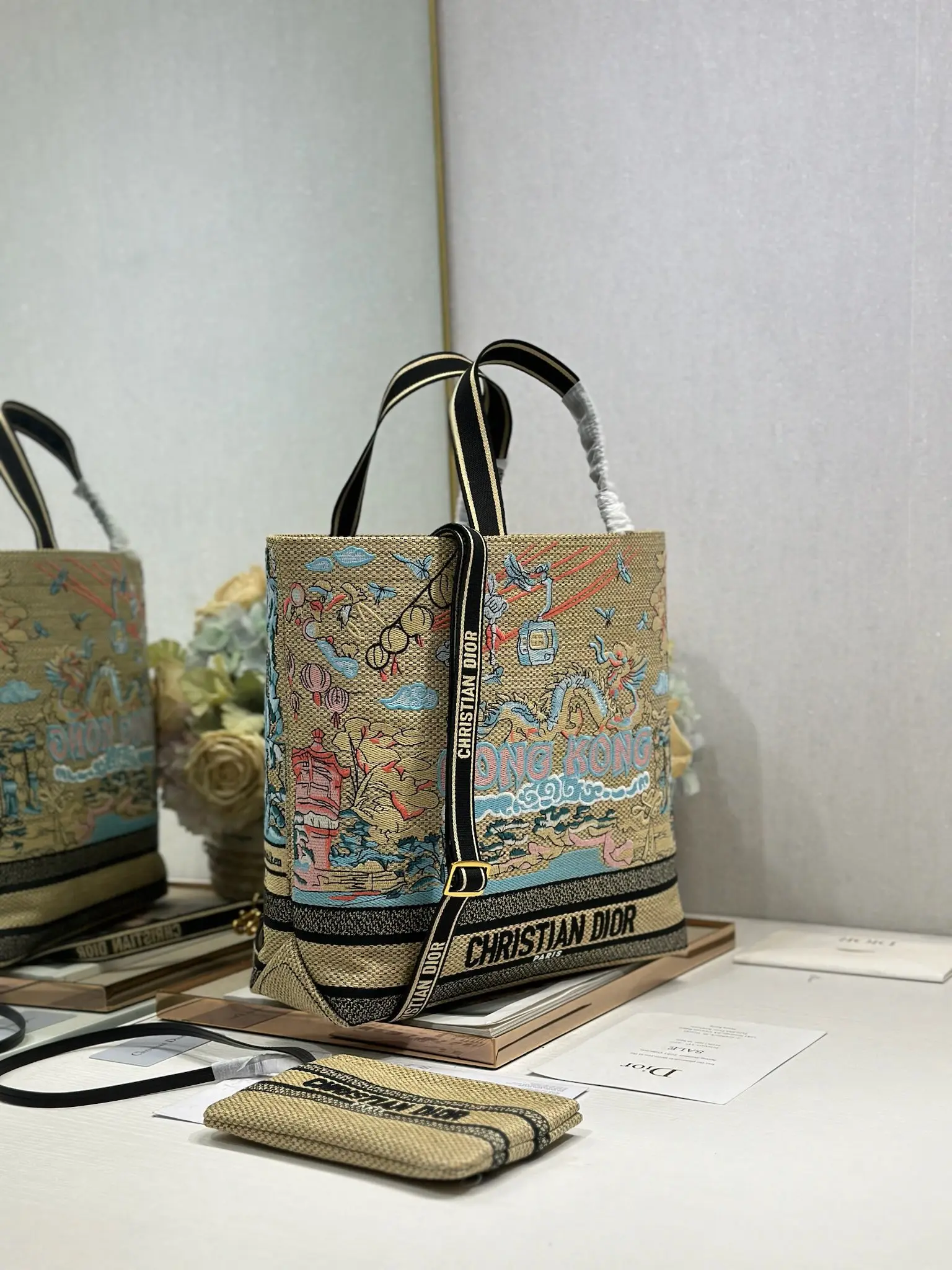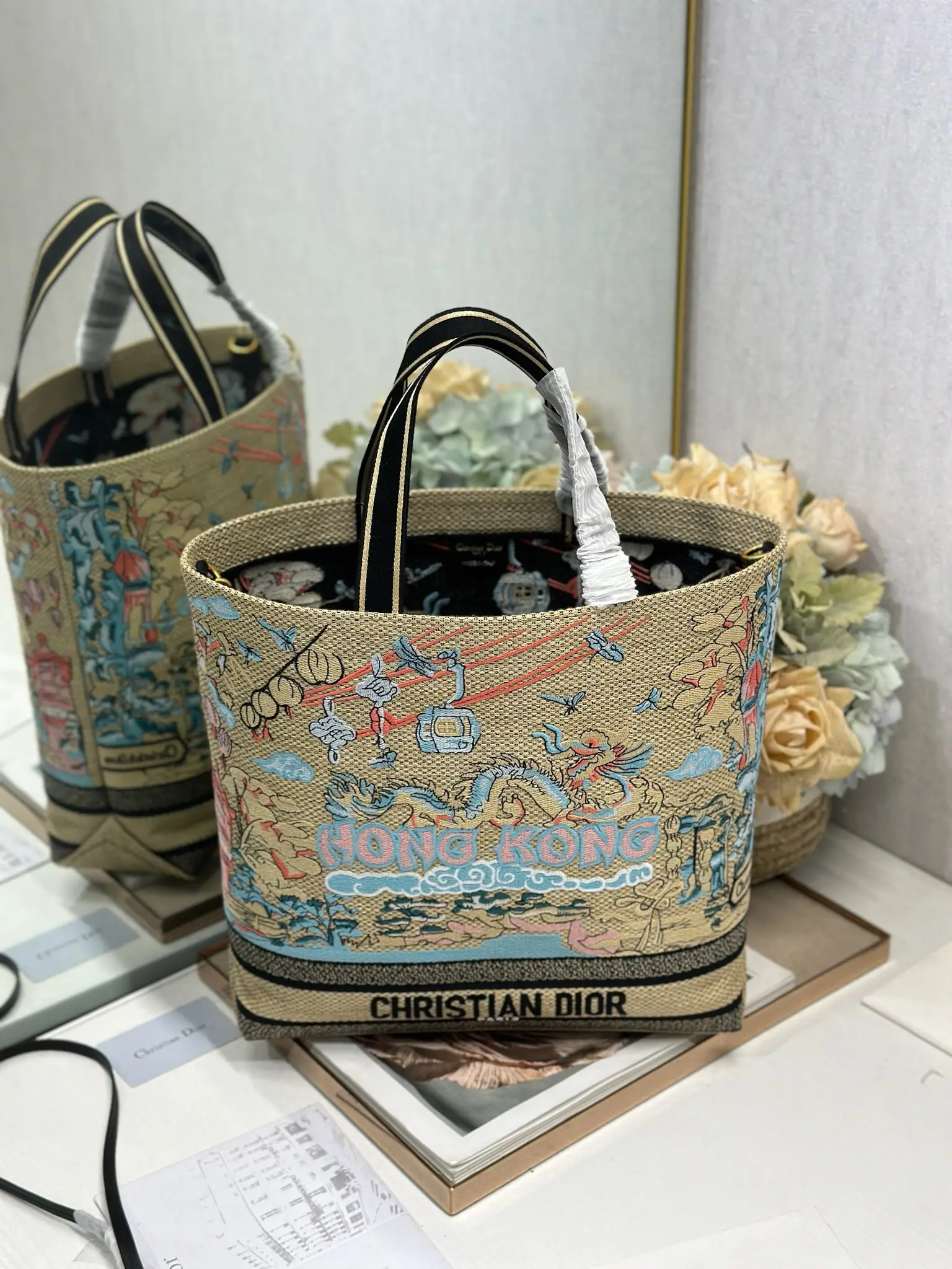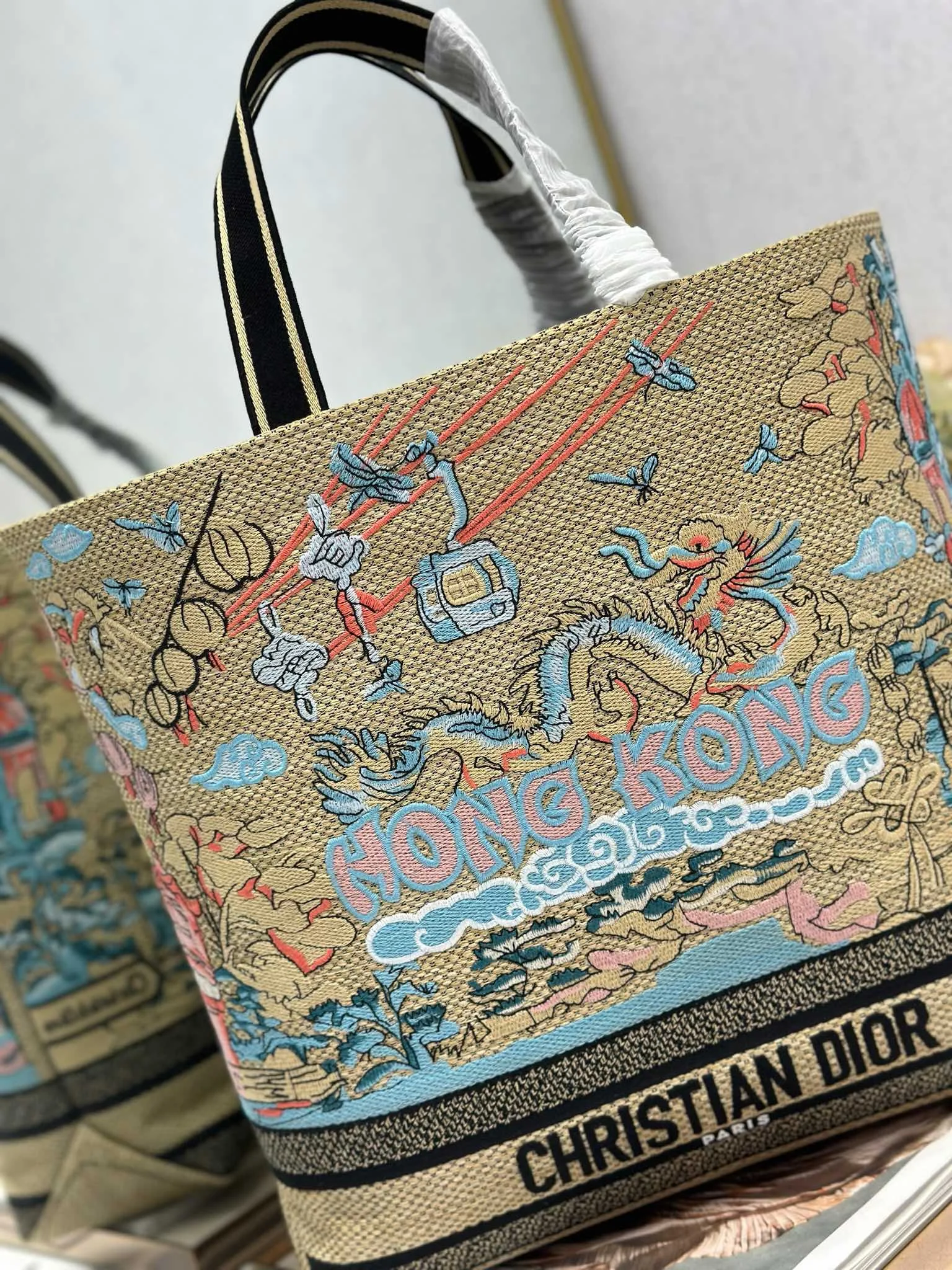 这款城市明信片手袋时尚实用 别具一格 采用各种色彩的刺绣精心制作 饰以香港当地人文与Dior高级刺绣相结合 宽敞的内部隔层可收纳各种日常用品 搭配一个小手提袋 大号款式 顶部刺绣手柄搭配可拆卸的刺绣肩带 可手提 肩背或斜挎