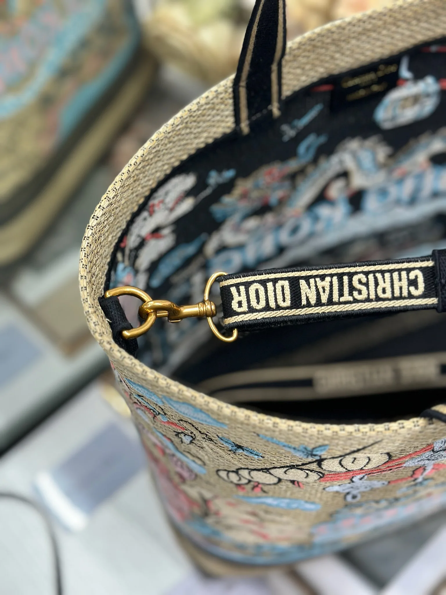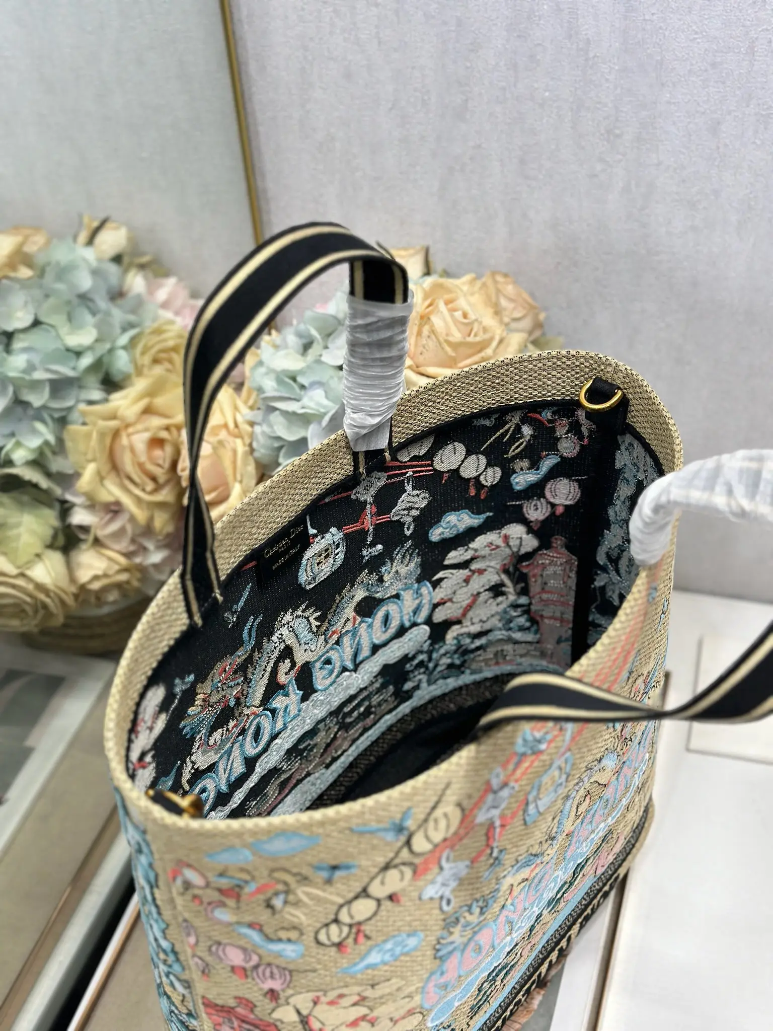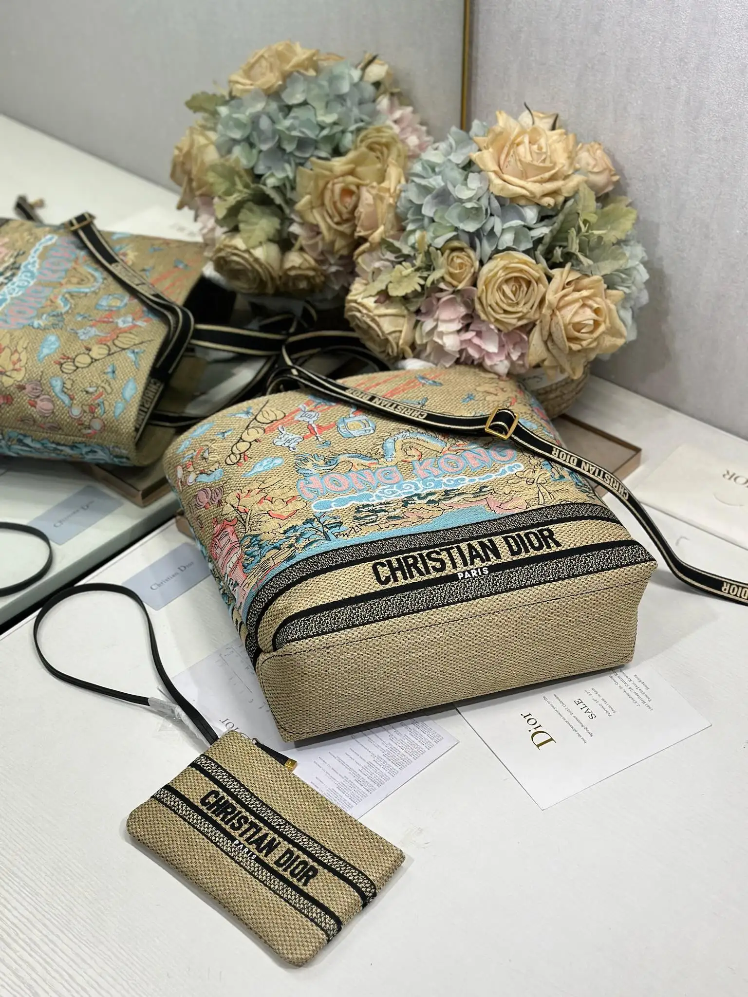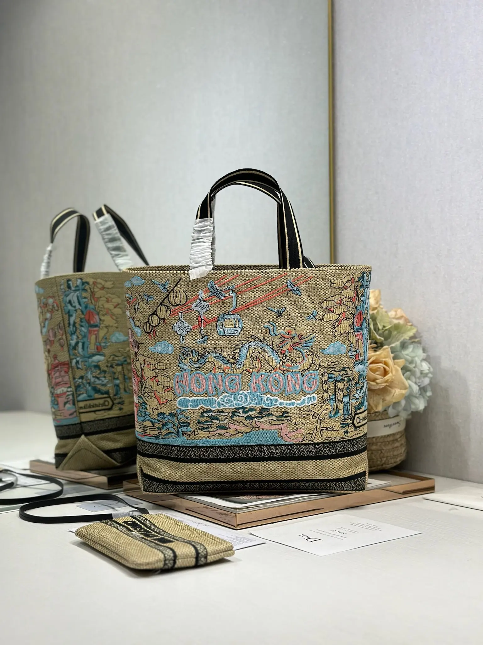 这款城市明信片手袋时尚实用 别具一格 采用各种色彩的刺绣精心制作 饰以香港当地人文与Dior高级刺绣相结合 宽敞的内部隔层可收纳各种日常用品 搭配一个小手提袋 大号款式 顶部刺绣手柄搭配可拆卸的刺绣肩带 可手提 肩背或斜挎
