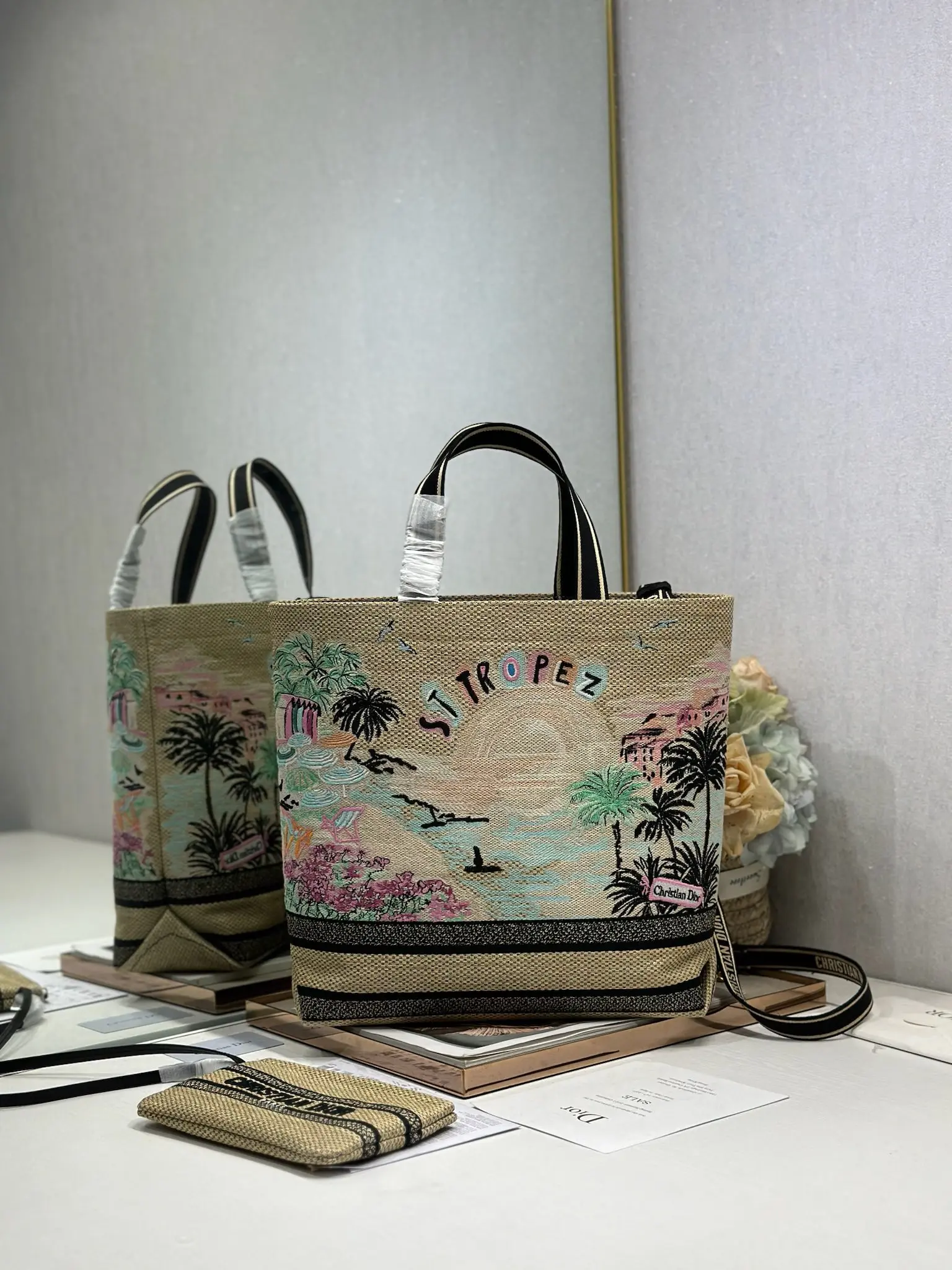 这款城市明信片手袋时尚实用 别具一格 采用各种色彩的刺绣精心制作 饰以圣特罗佩当地人文与Dior高级刺绣相结合 宽敞的内部隔层可收纳各种日常用品 搭配一个小手提袋 大号款式 顶部刺绣手柄搭配可拆卸的刺绣肩带 可手提 肩背或斜挎