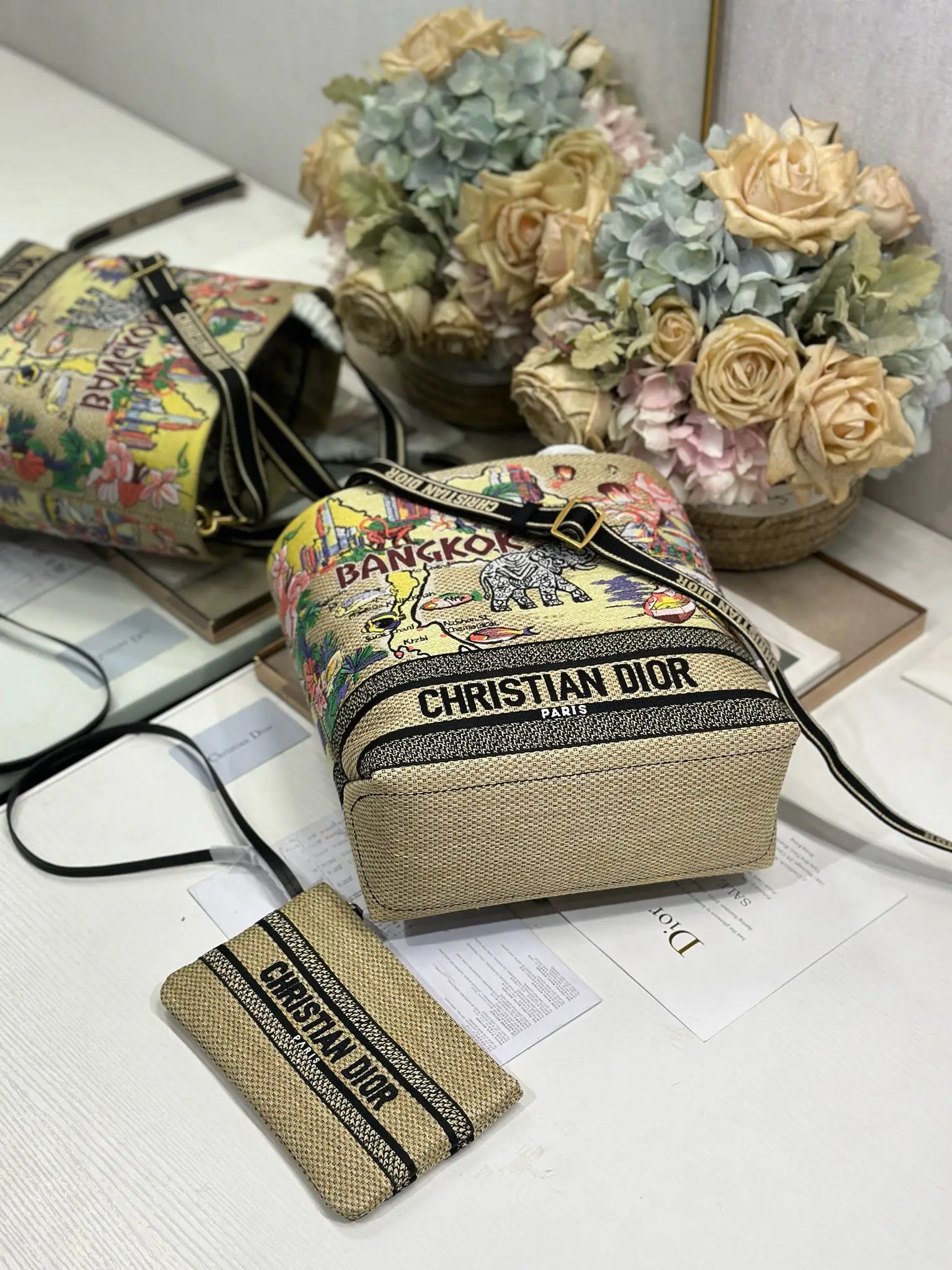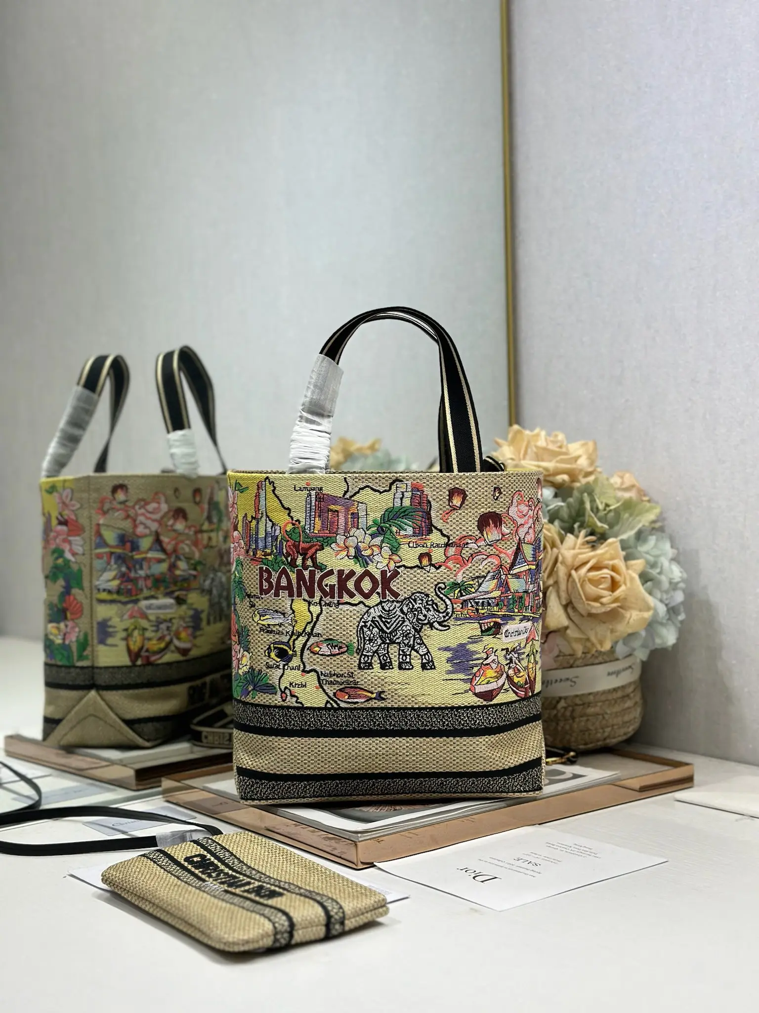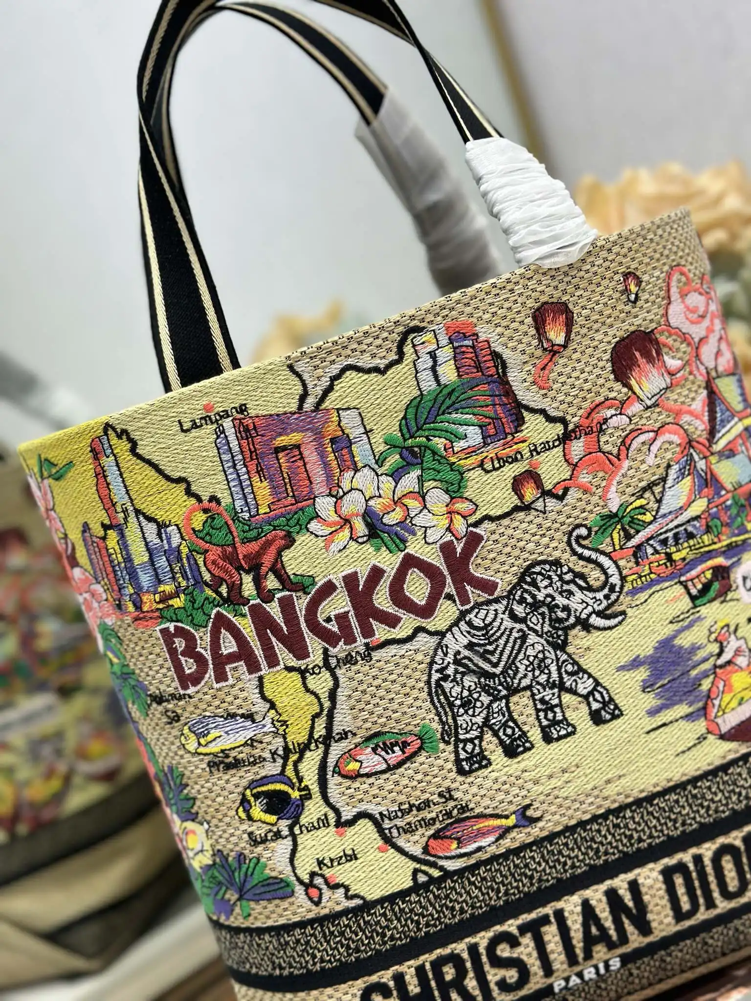 小号 Dior城市明信片 度假风款手袋 曼谷 限定 这款城市明信片手袋时尚实用 别具一格 采用各种色彩的刺绣精心制作 饰以曼谷当地人文与Dior高级刺绣相结合 宽敞的内部隔层可收纳各种日常用品 搭配一个小手提袋 小号款式 顶部刺绣手柄搭配可拆卸的刺绣肩带 可手提 肩背或斜挎