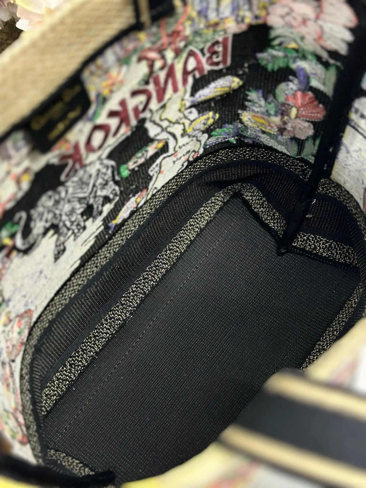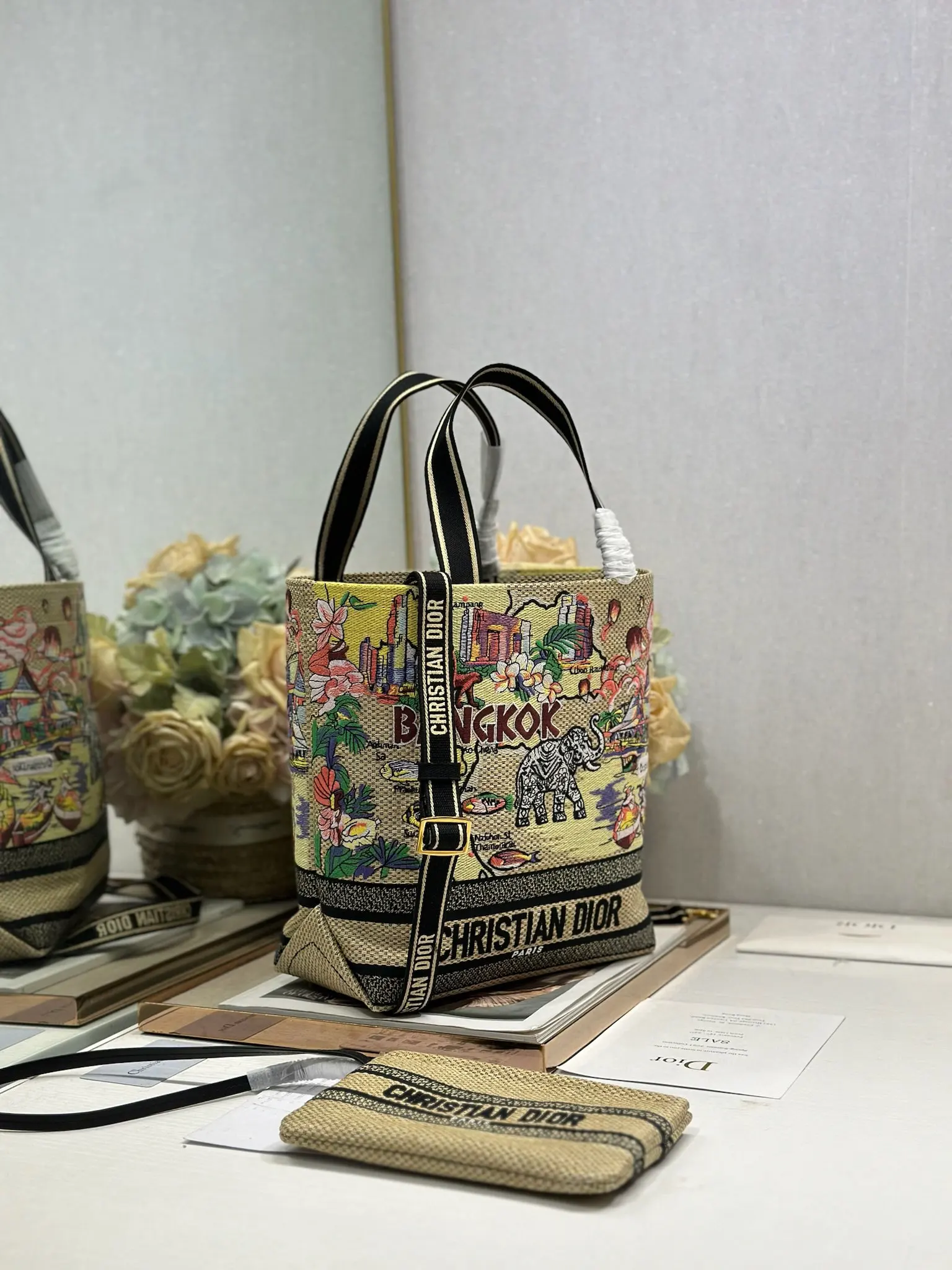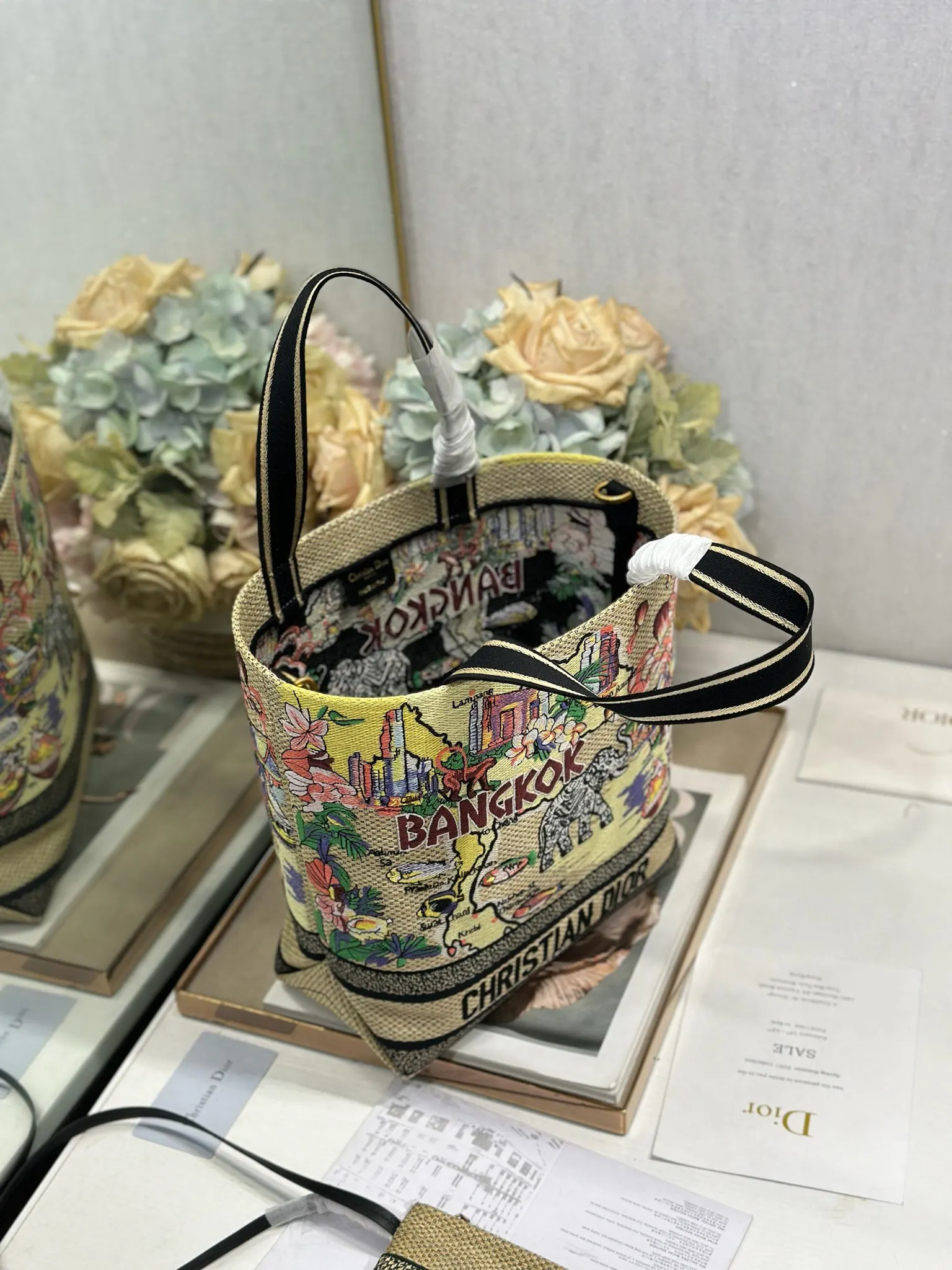 小号 Dior城市明信片 度假风款手袋 曼谷 限定 这款城市明信片手袋时尚实用 别具一格 采用各种色彩的刺绣精心制作 饰以曼谷当地人文与Dior高级刺绣相结合 宽敞的内部隔层可收纳各种日常用品 搭配一个小手提袋 小号款式 顶部刺绣手柄搭配可拆卸的刺绣肩带 可手提 肩背或斜挎