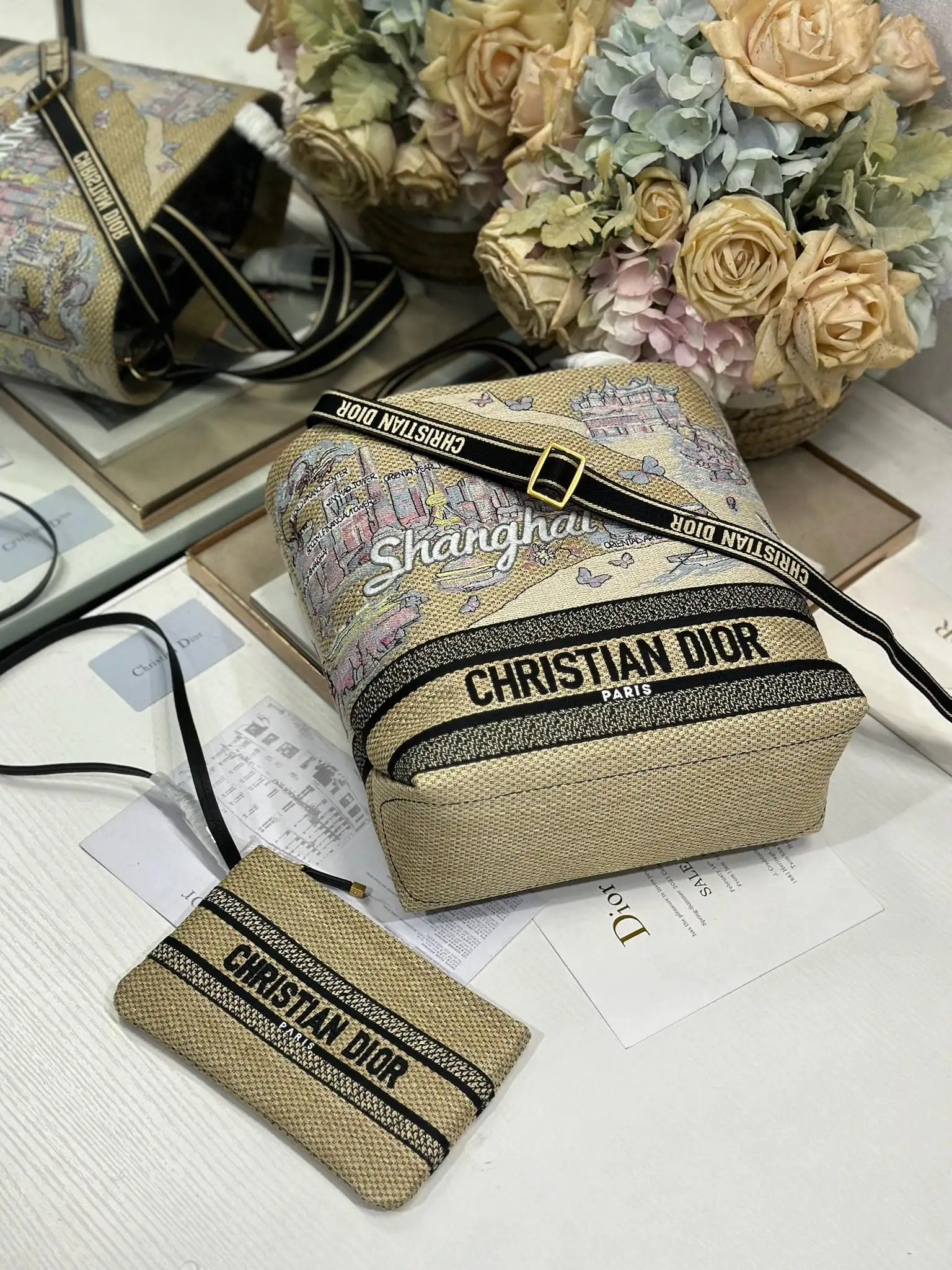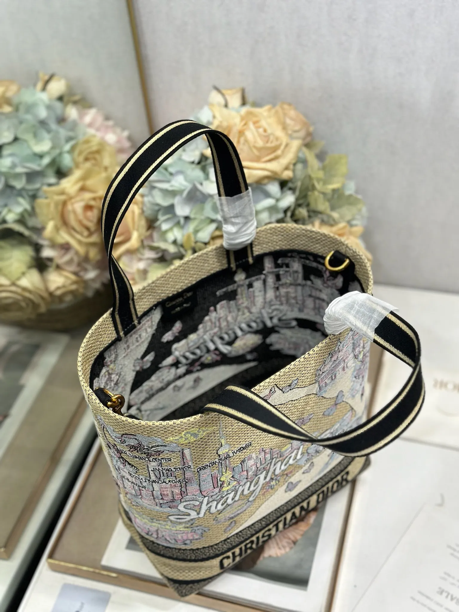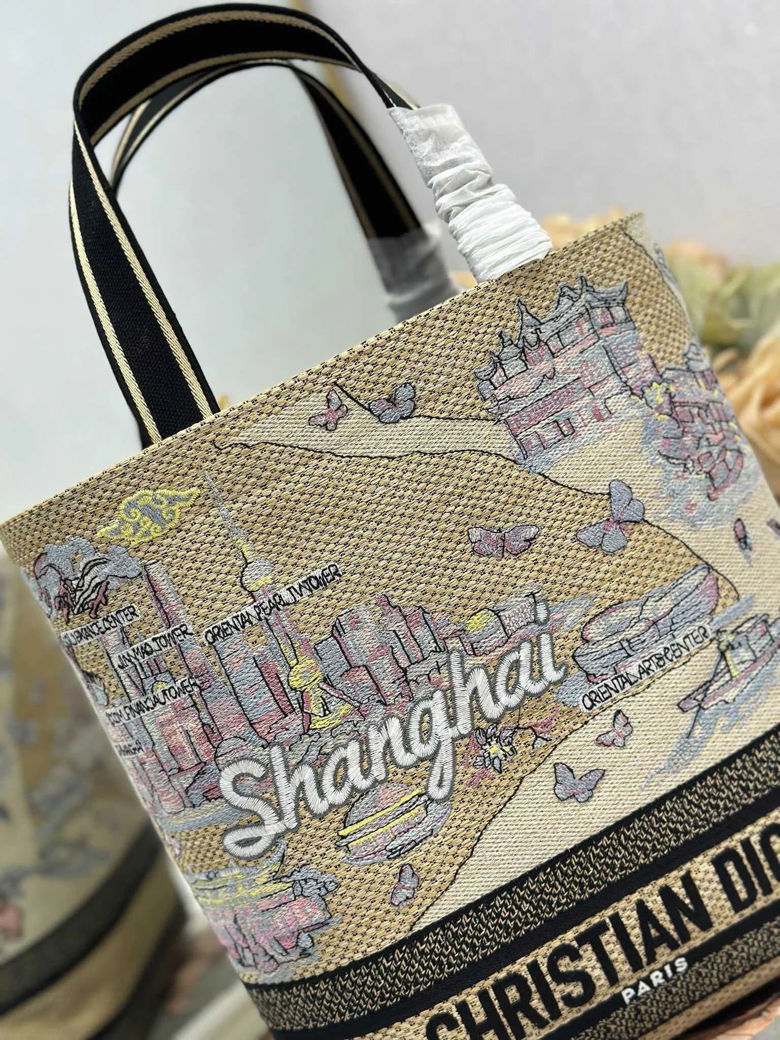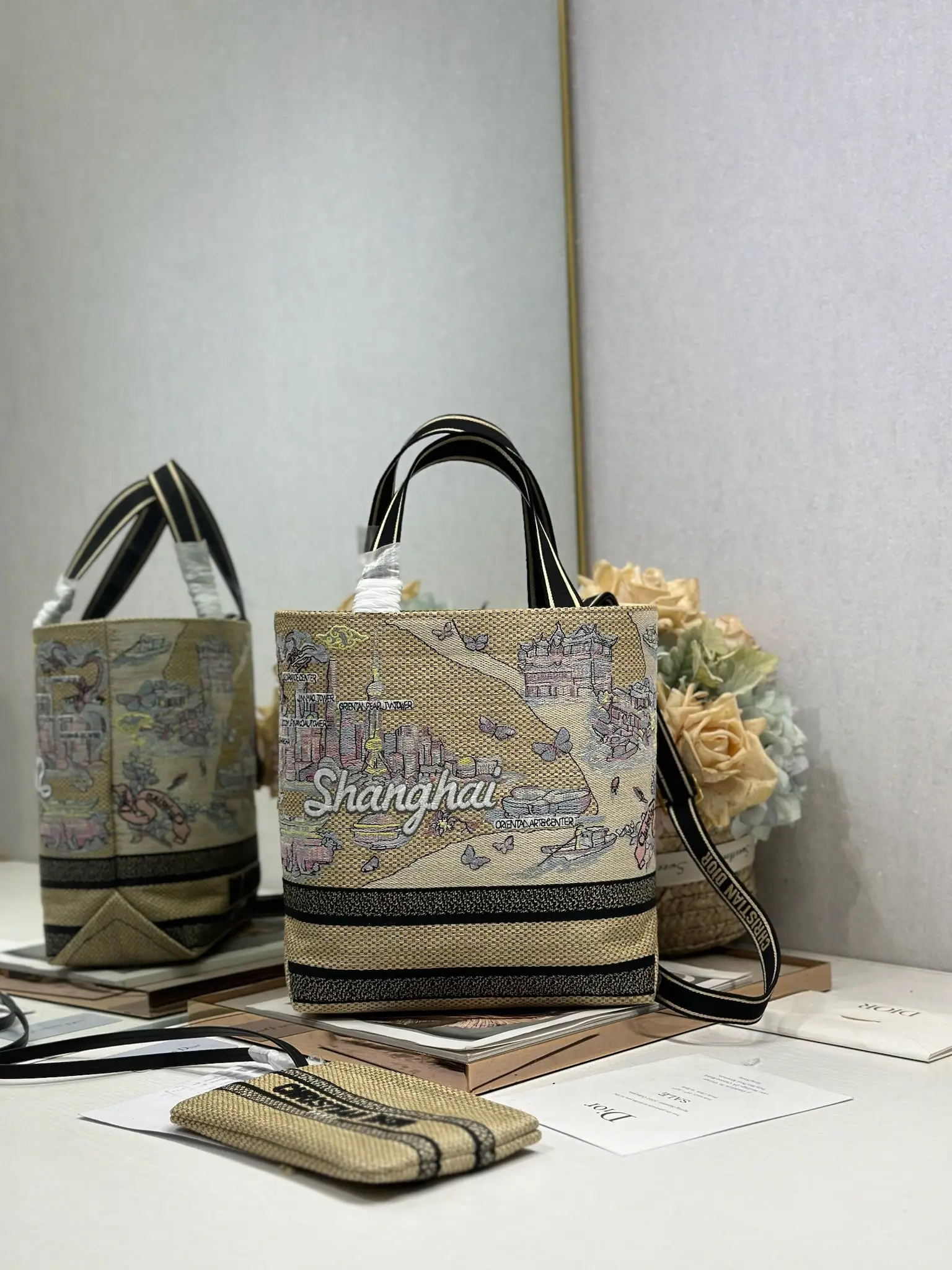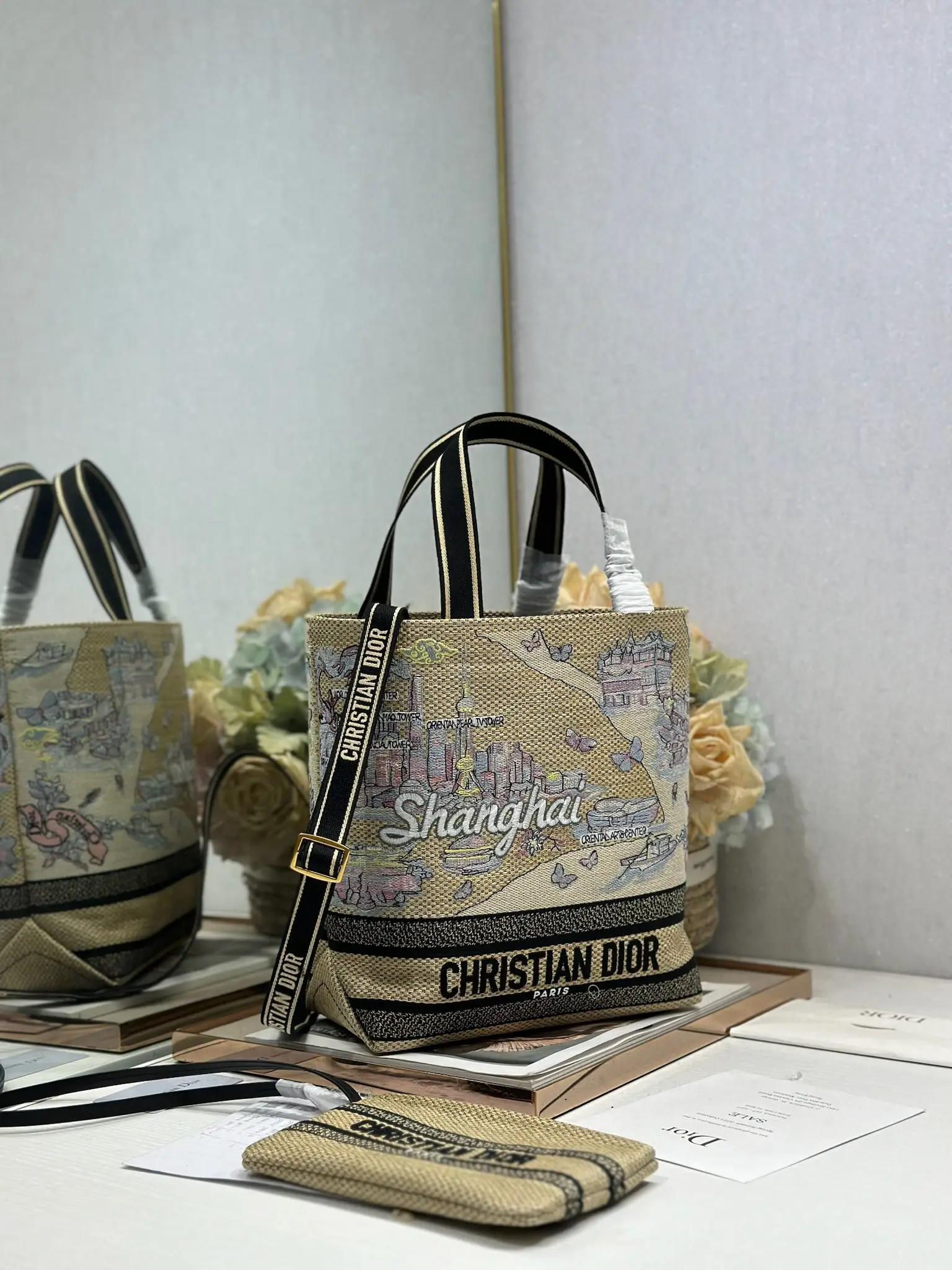 小号 Dior城市明信片 度假风款手袋 上海 限定 这款城市明信片手袋时尚实用 别具一格 采用各种色彩的刺绣精心制作 饰以上海当地人文与Dior高级刺绣相结合 宽敞的内部隔层可收纳各种日常用品 搭配一个小手提袋 小号款式 顶部刺绣手柄搭配可拆卸的刺绣肩带 可手提 肩背或斜挎