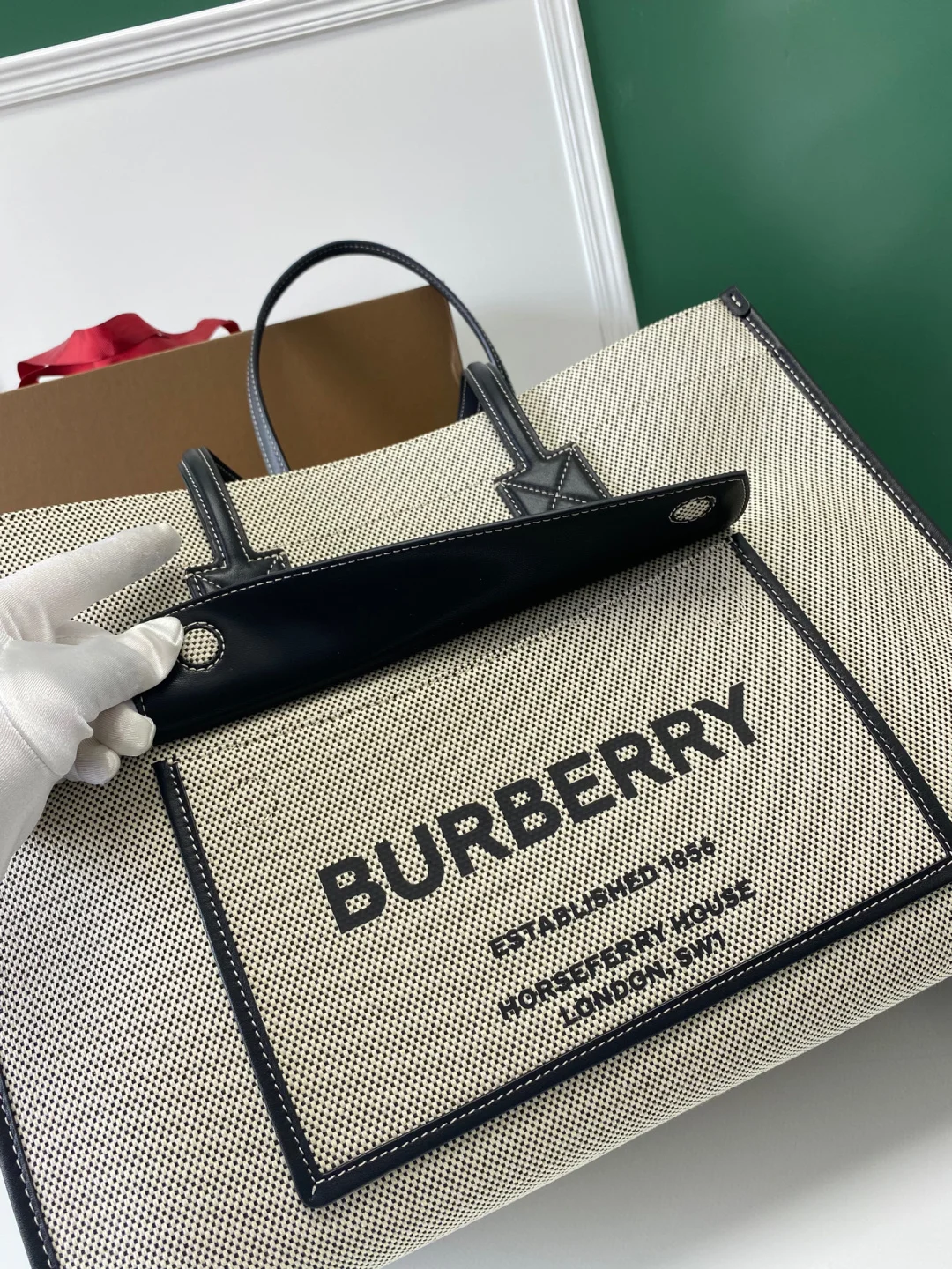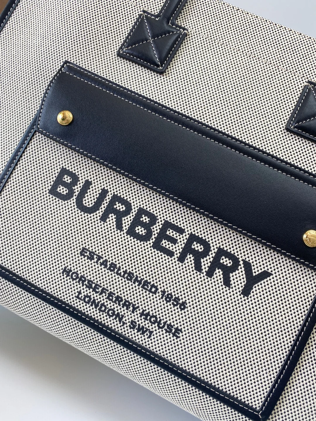 顶级 B家双色帆布拼皮皮革Freya意大利精制托特包 选用缉明线皮革及棉质帆布制成 装饰品牌 Horseferry 印花 可使用顶部提柄手拎 或肩背携带 尺寸:33 x 12.5 x26cm型号129157