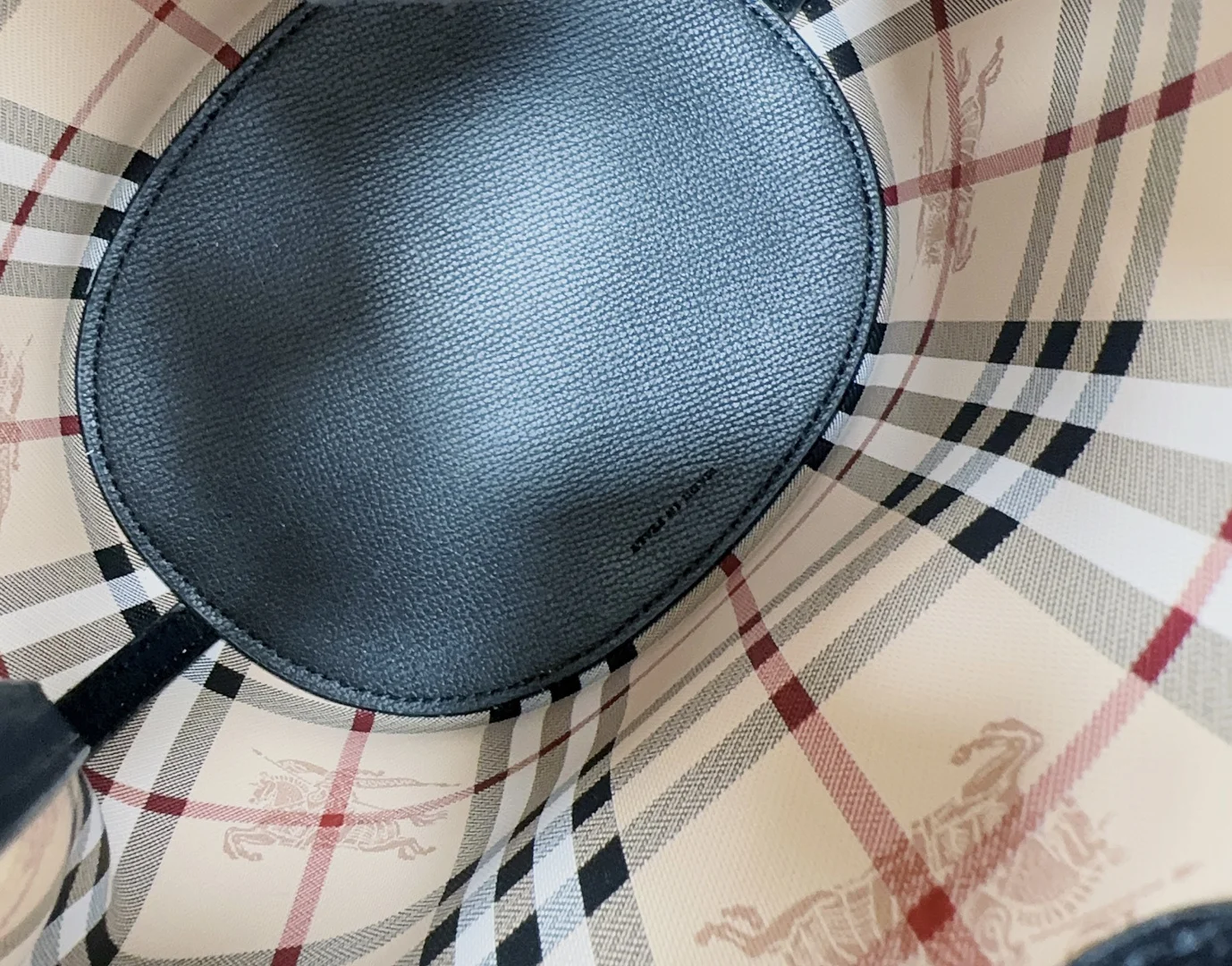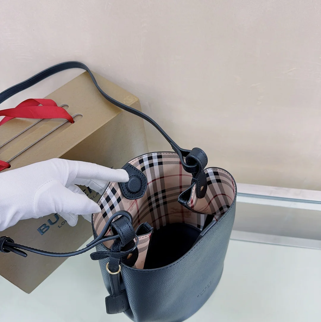 原厂 B家简约风格的斜背水桶包 采用轻盈对版手掌纹皮革于意大利高级工匠制成并配有经典 Haymarket 格纹 精巧包身设计 适合放置随身物品可轻松斜挎或肩背 风格时髦而实用 是日夜造型皆宜的理想之选尺寸18.5 x 15 x 23.5cm型号1581