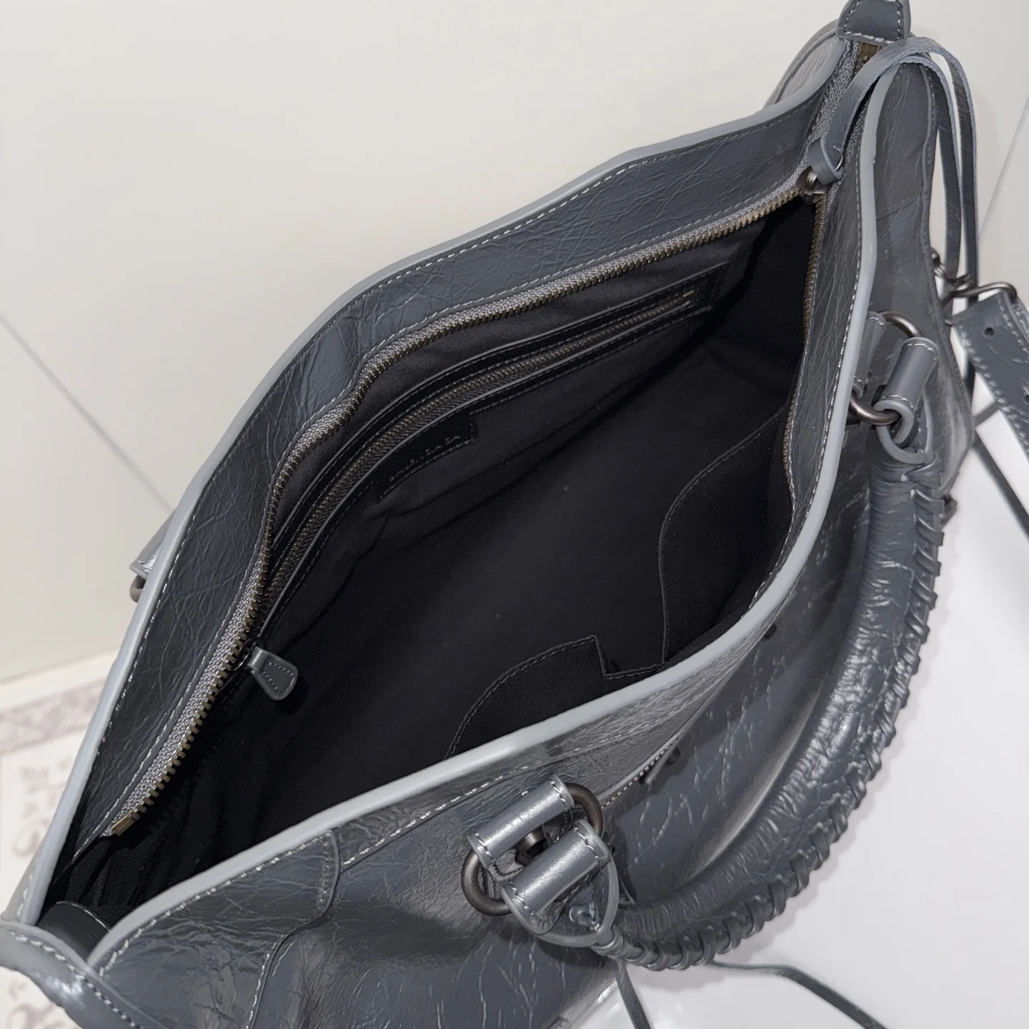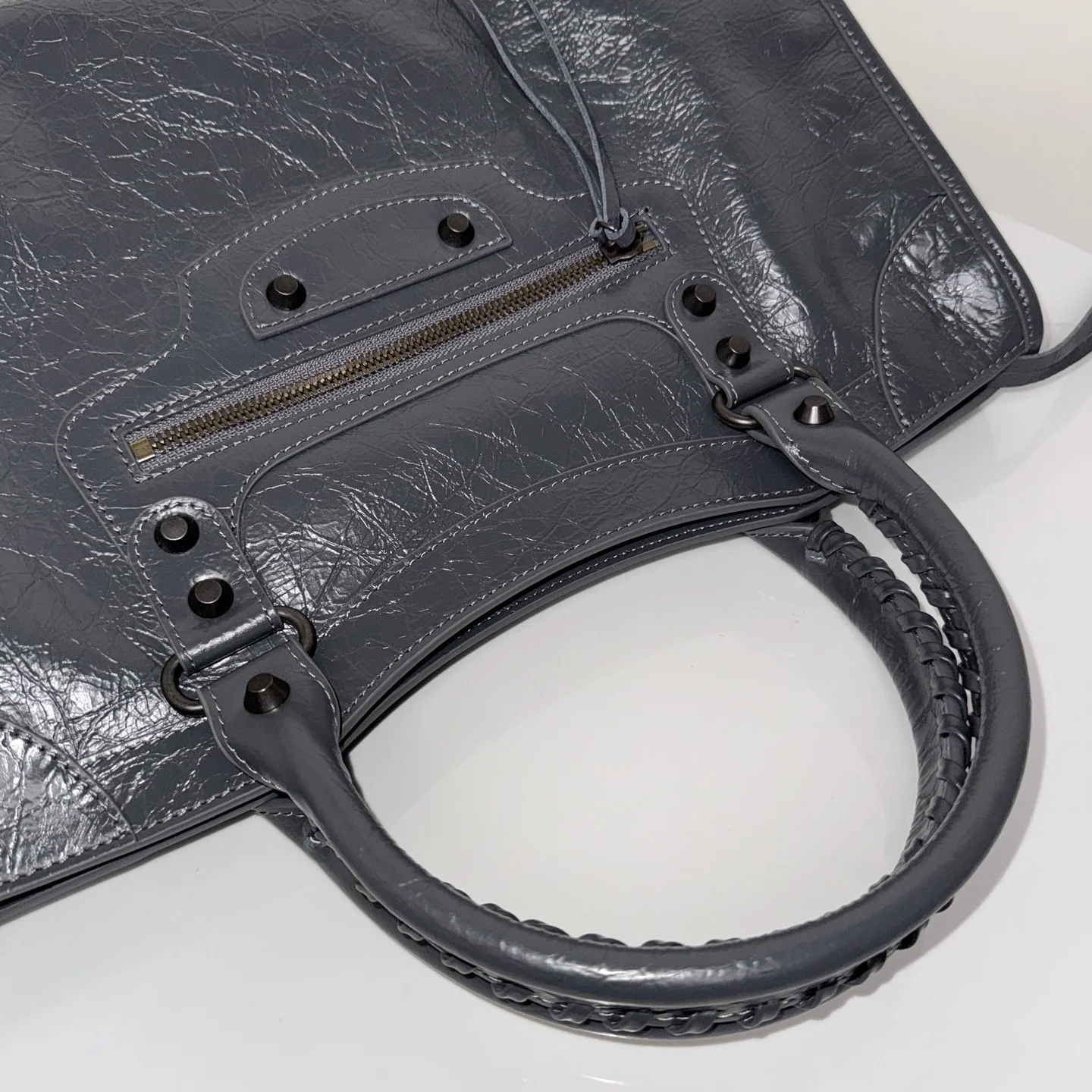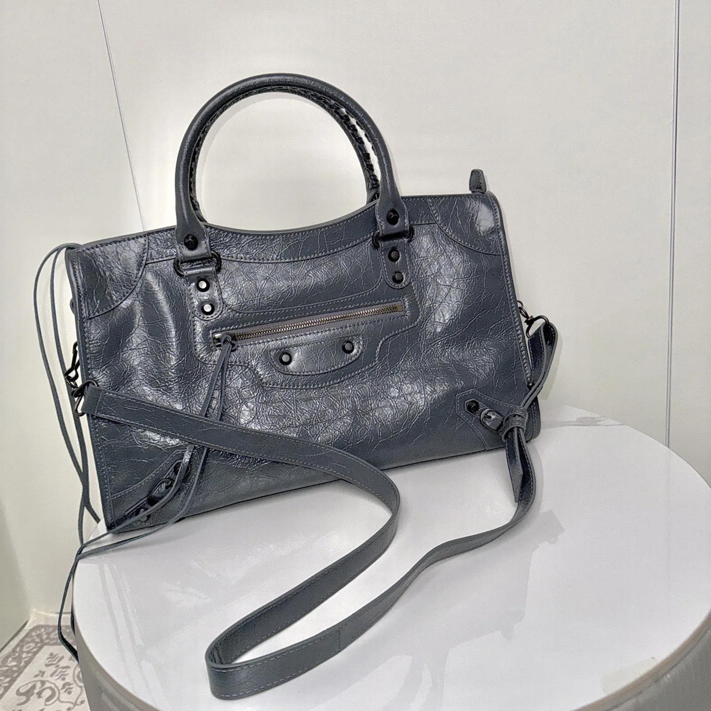 𝗕𝗔𝗟𝗘𝗡𝗖𝗜𝗔𝗚*𝗟𝗘 𝗖𝗜𝗧Y.巴黎世家 20迭代新版机车包 city 深灰色大号 黑铜钉 . 铜色拉链)黑铜色铆钉闪着细碎光泽 自带故事感 大号尺寸满足出行实用满分 无论是通勤还是出街 一挎上就有了独属于自己的酷飒姿态.原厂品质