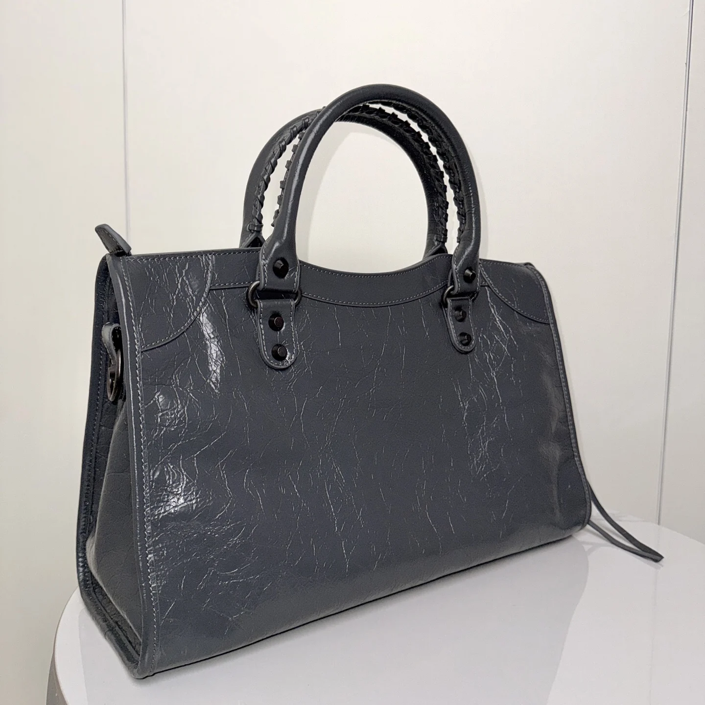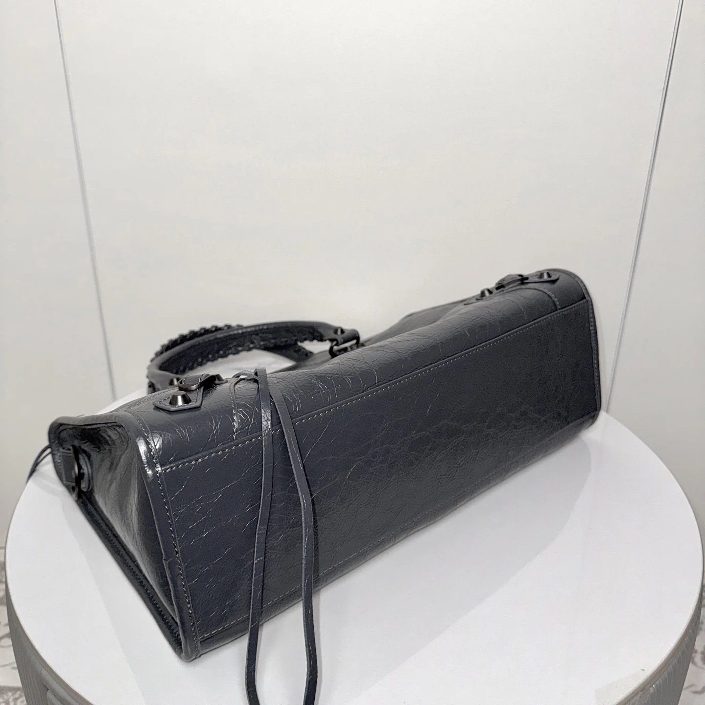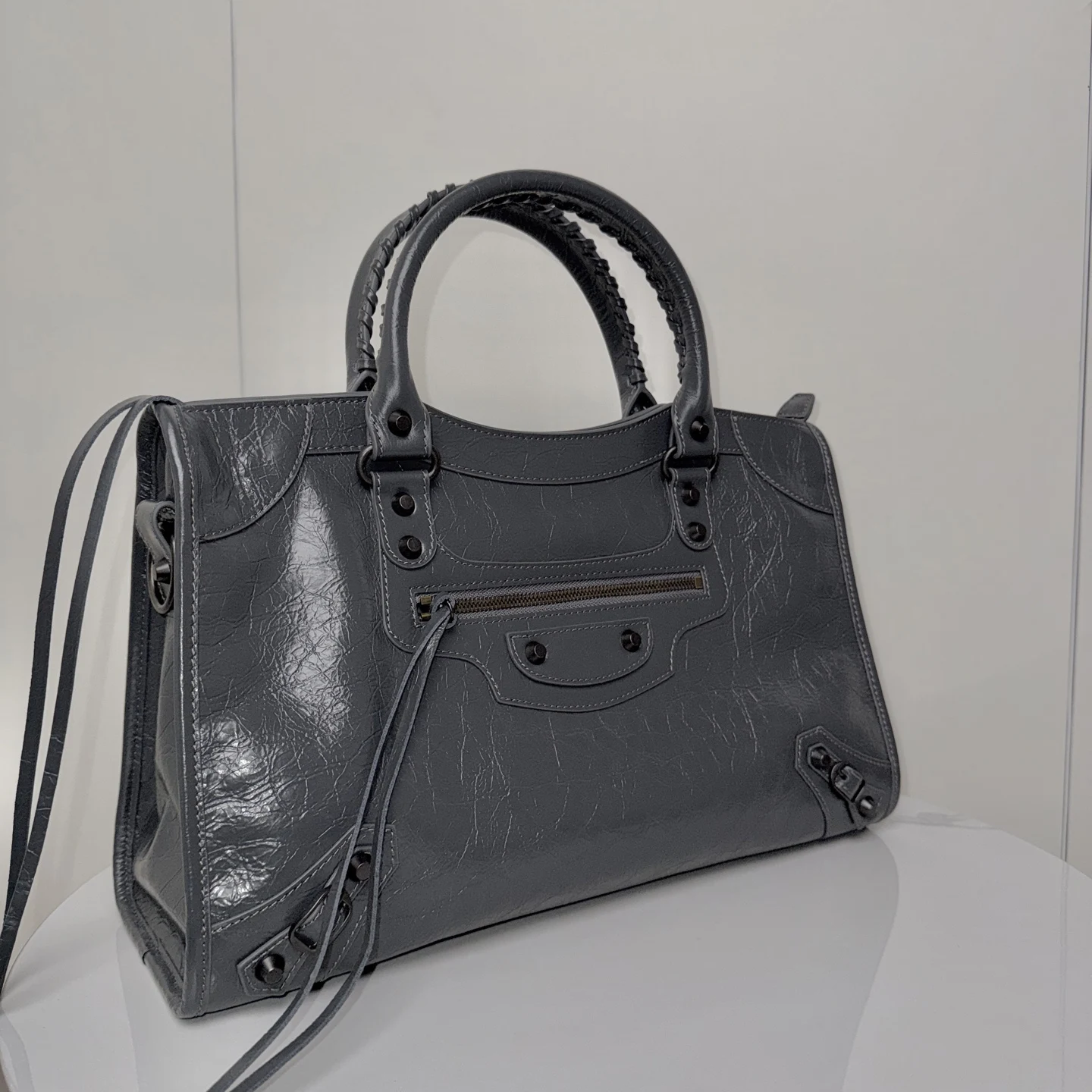 𝗕𝗔𝗟𝗘𝗡𝗖𝗜𝗔𝗚*𝗟𝗘 𝗖𝗜𝗧Y.巴黎世家 20迭代新版机车包 city 深灰色大号 黑铜钉 . 铜色拉链)黑铜色铆钉闪着细碎光泽 自带故事感 大号尺寸满足出行实用满分 无论是通勤还是出街 一挎上就有了独属于自己的酷飒姿态.原厂品质