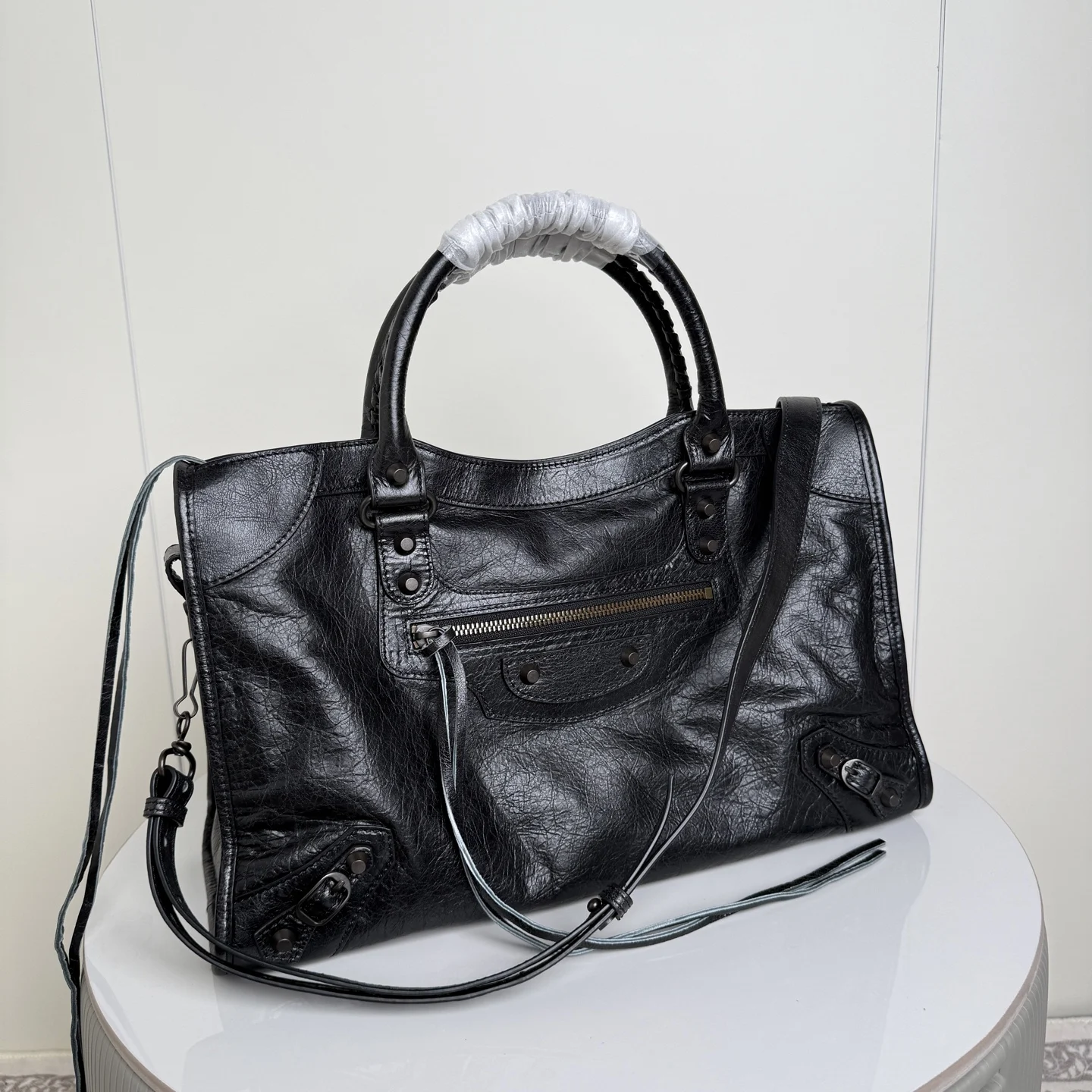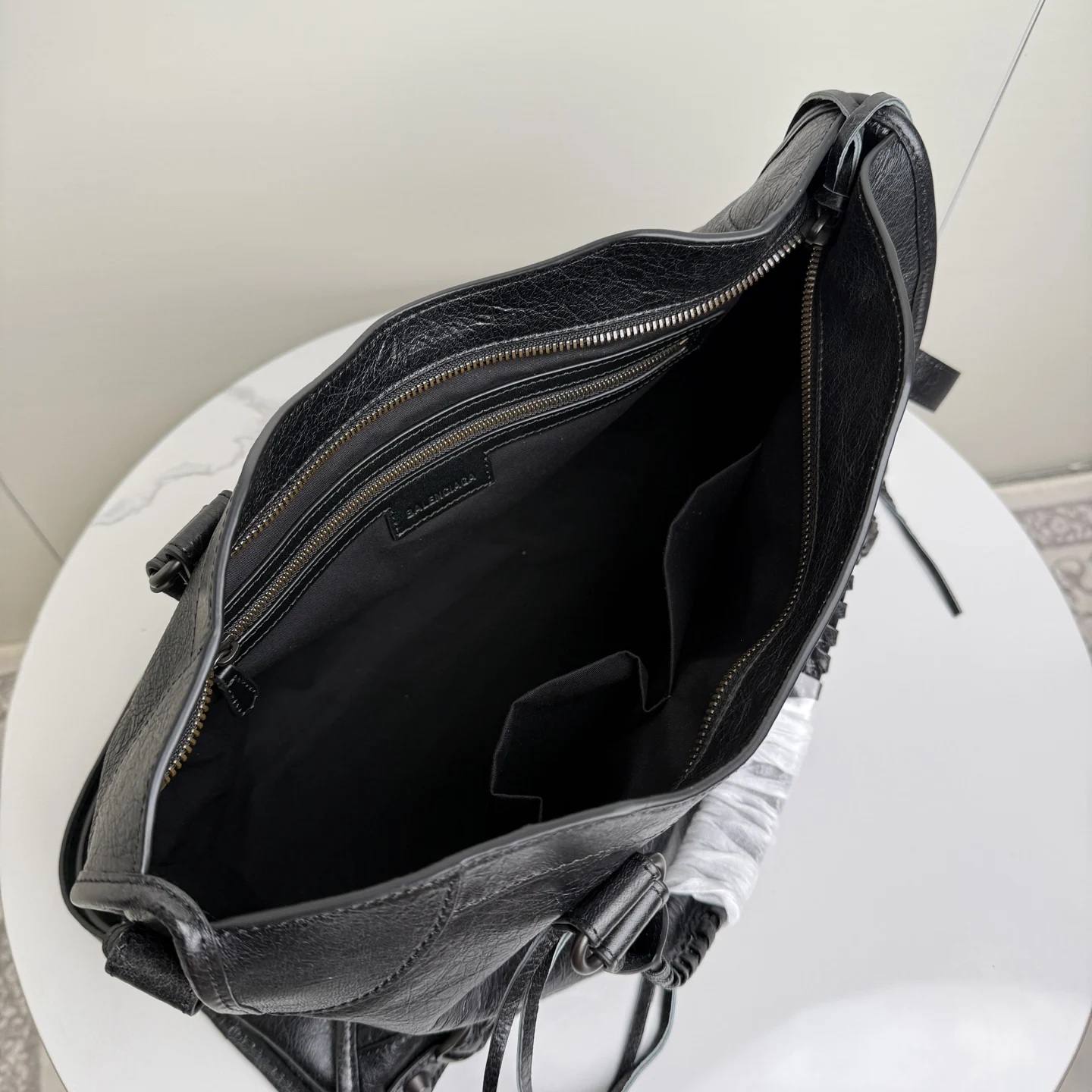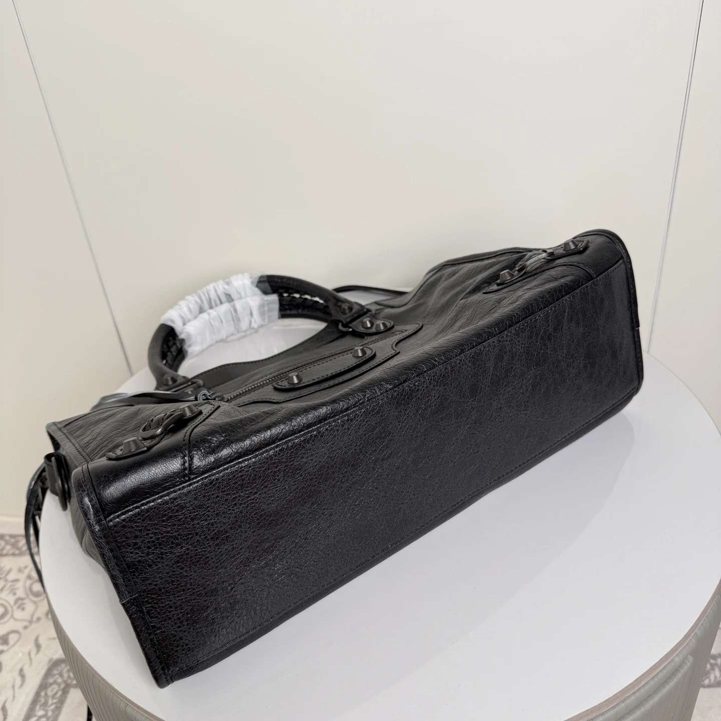 𝗕𝗔𝗟𝗘𝗡𝗖𝗜𝗔𝗚*𝗟𝗘 𝗖𝗜𝗧Y.巴黎世家 20迭代新版机车包 city 黑色大号 黑铜钉 . 铜色拉链)黑铜色铆钉闪着细碎光泽 自带故事感 大号尺寸满足出行实用满分 无论是通勤还是出街 一挎上就有了独属于自己的酷飒姿态.原厂品质 尺寸size: 底长38x高24x宽15cm