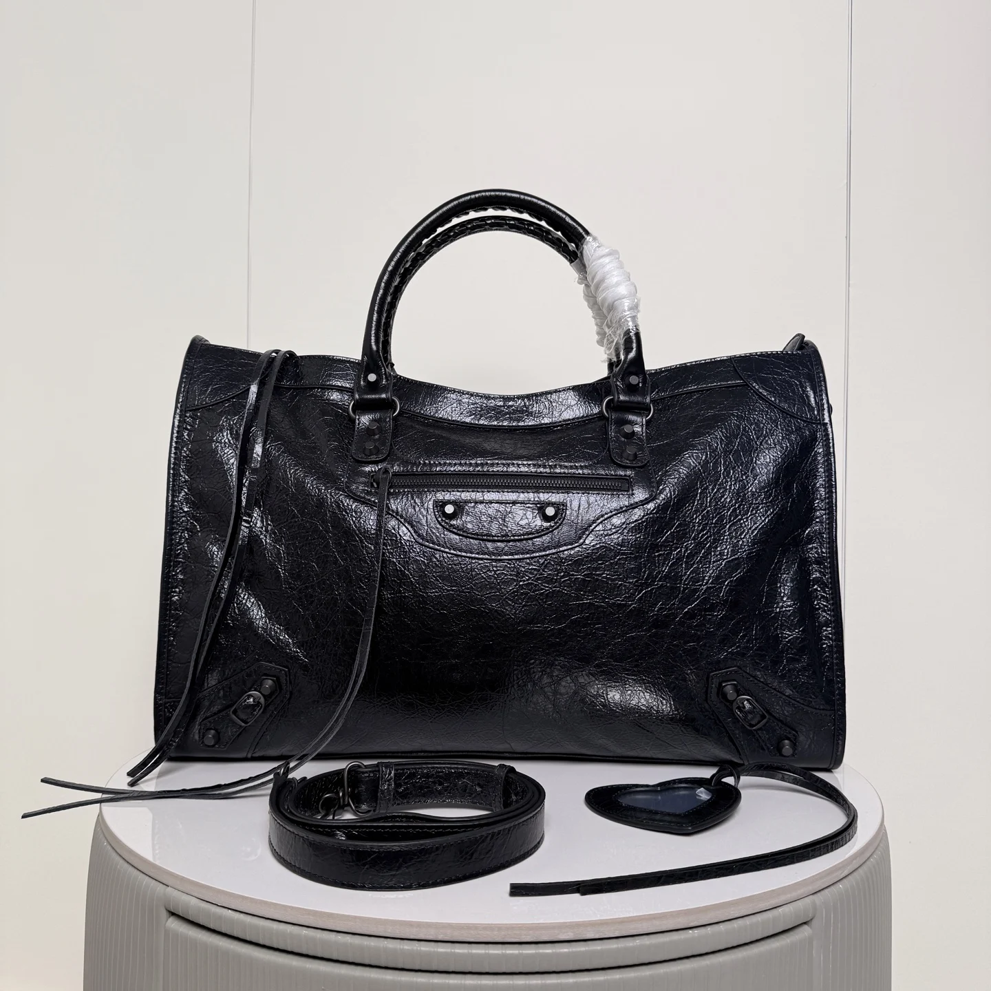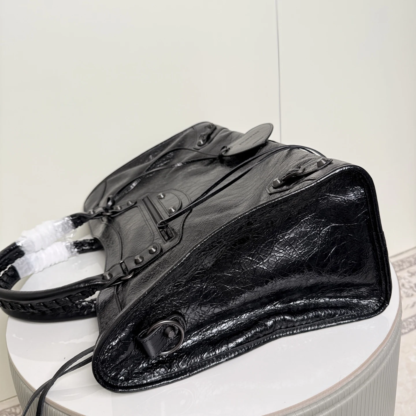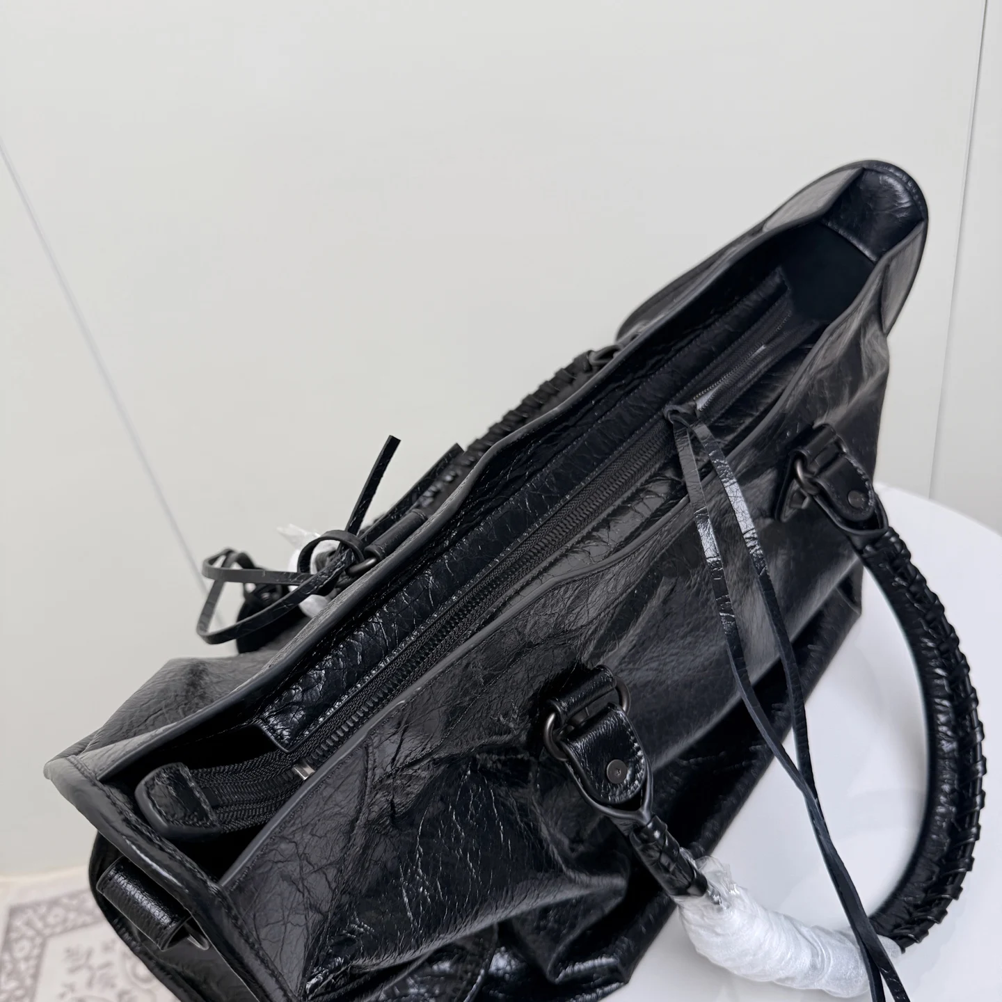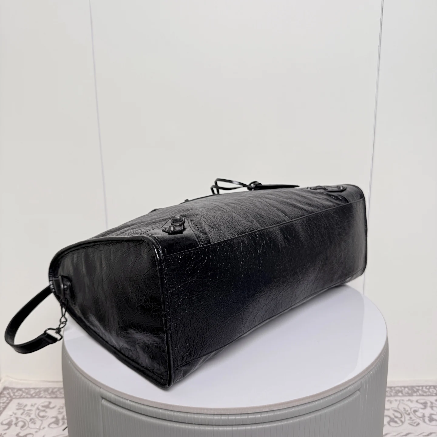 . 46cm. 𝗕𝗔𝗟𝗘𝗡𝗖𝗜𝗔𝗚*𝗟𝗘 𝗖𝗜𝗧Y.巴黎世家 新版机车包 city 黑色.大号 黑铜钉 . 黑色拉链)铆钉闪着细碎光泽 自带故事感 加大号尺寸size 底长46x高29x宽17cm