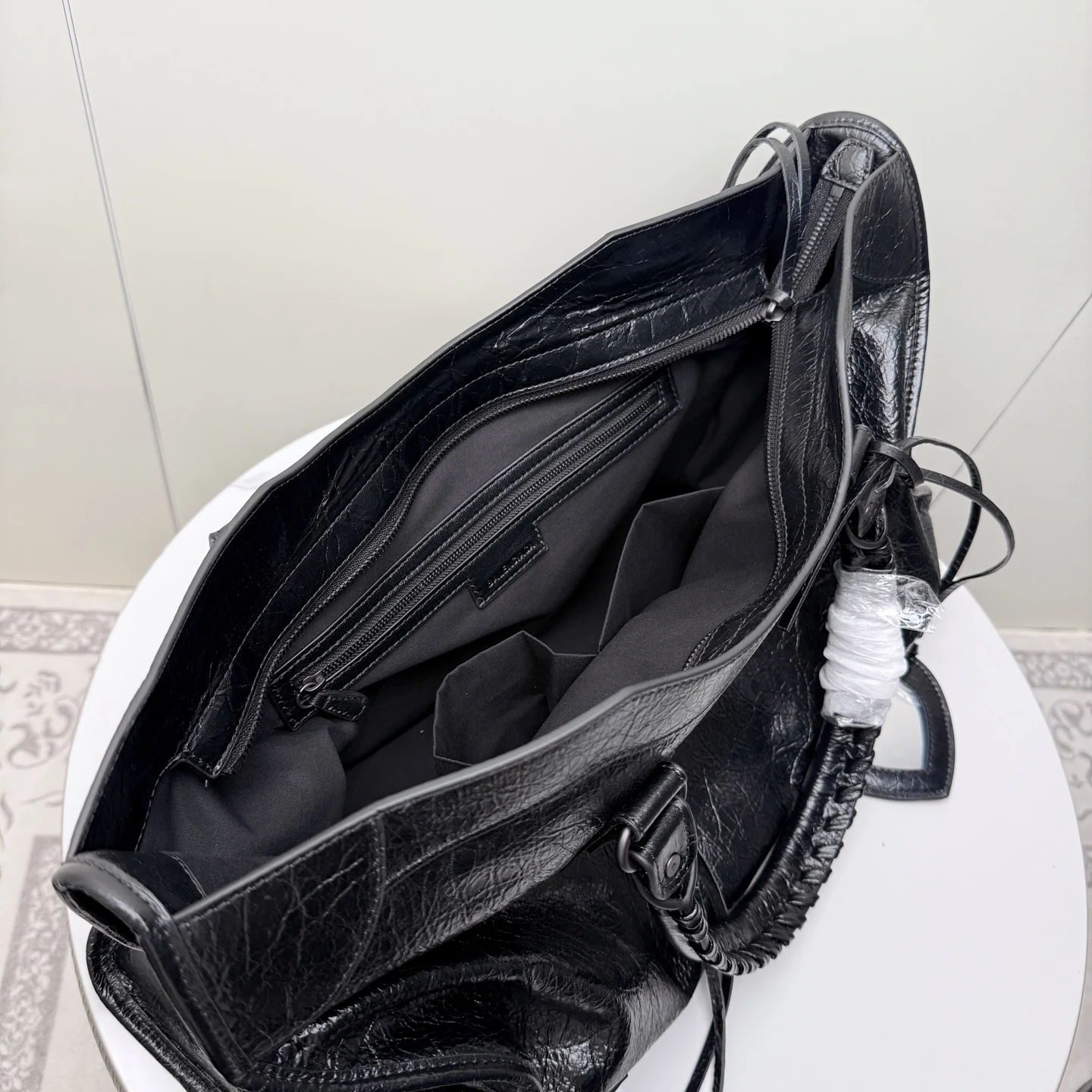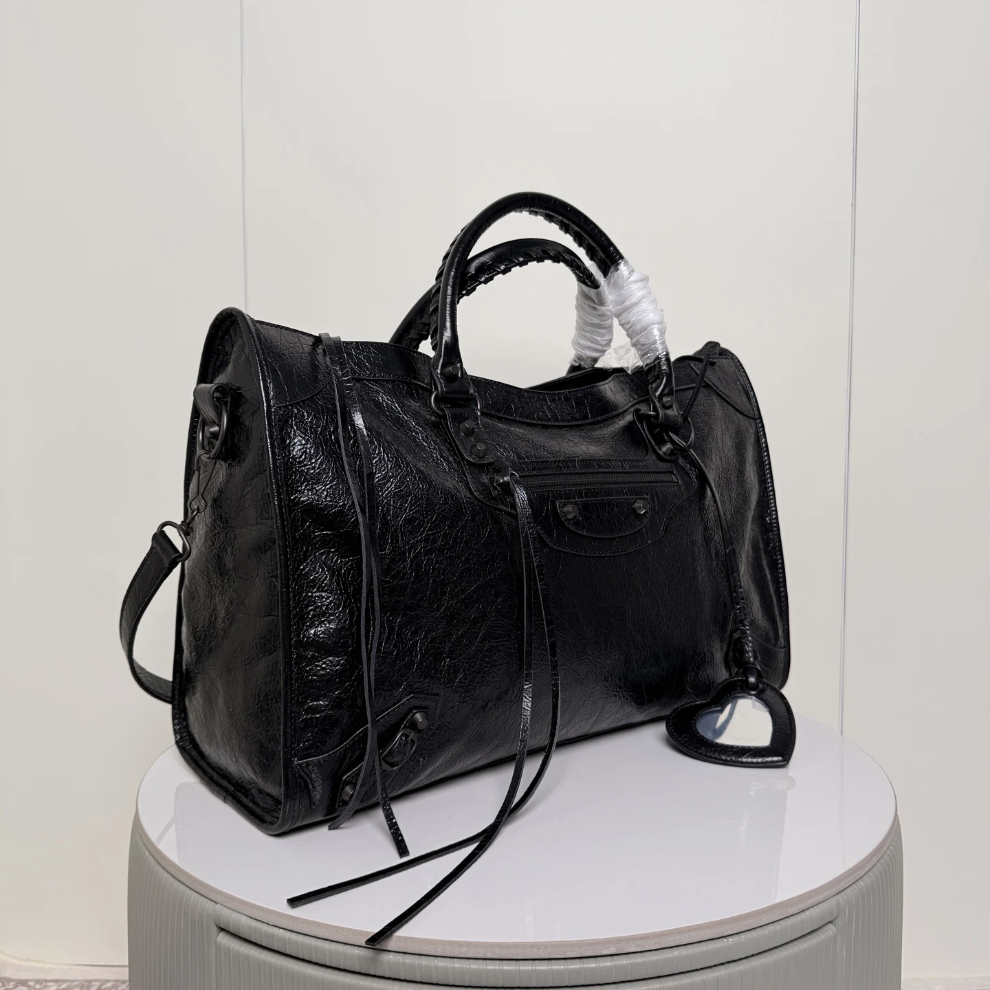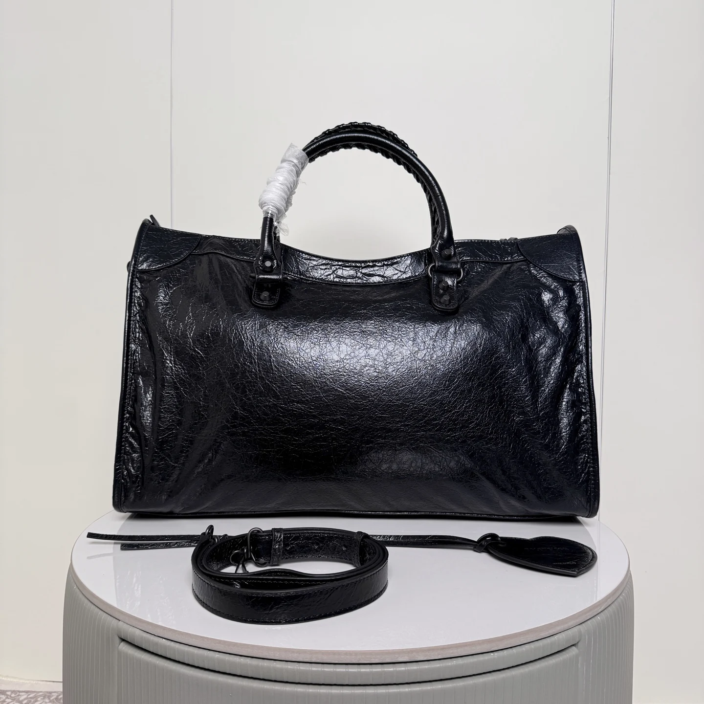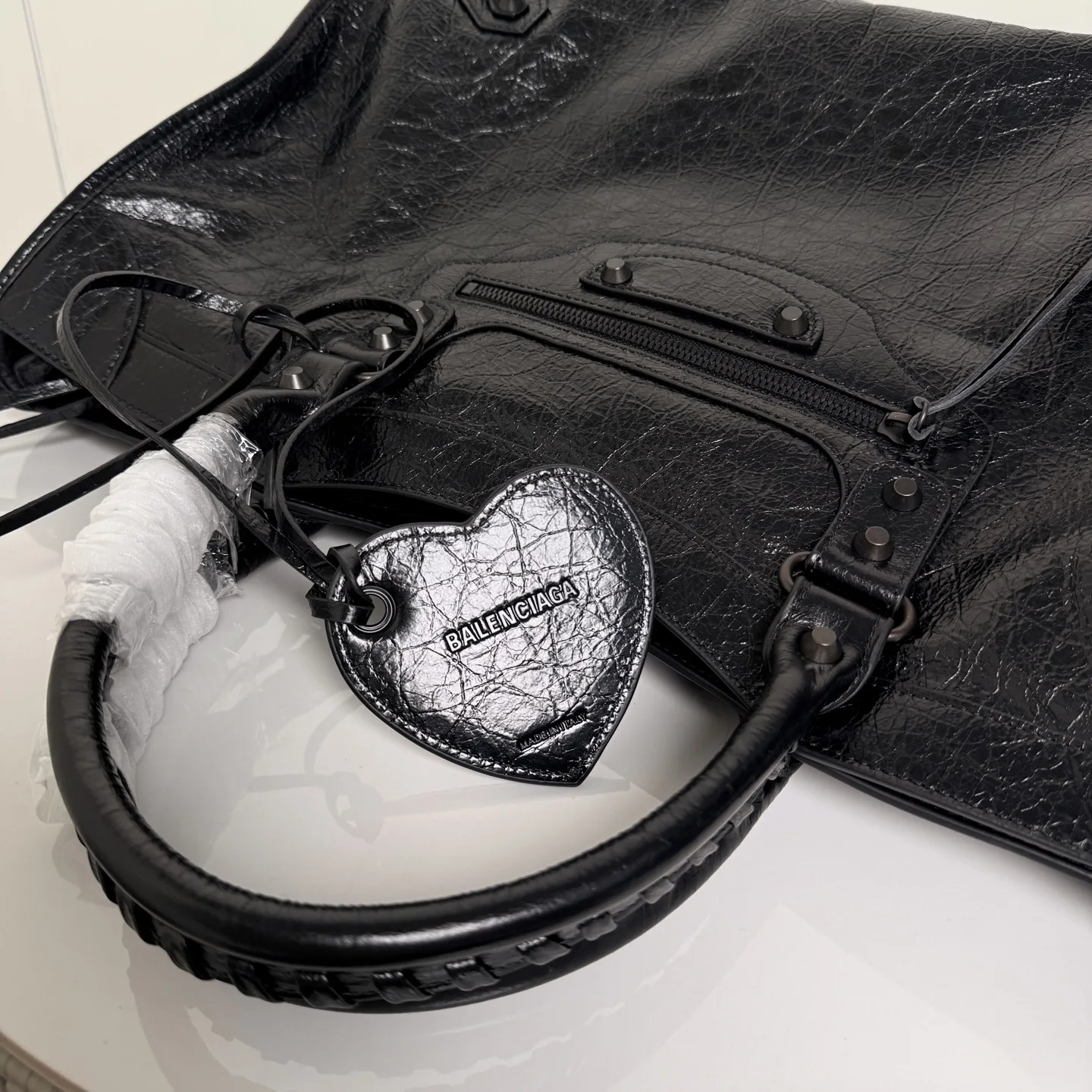 . 46cm. 𝗕𝗔𝗟𝗘𝗡𝗖𝗜𝗔𝗚*𝗟𝗘 𝗖𝗜𝗧Y.巴黎世家 新版机车包 city 黑色.大号 黑铜钉 . 黑色拉链)铆钉闪着细碎光泽 自带故事感 加大号尺寸size 底长46x高29x宽17cm