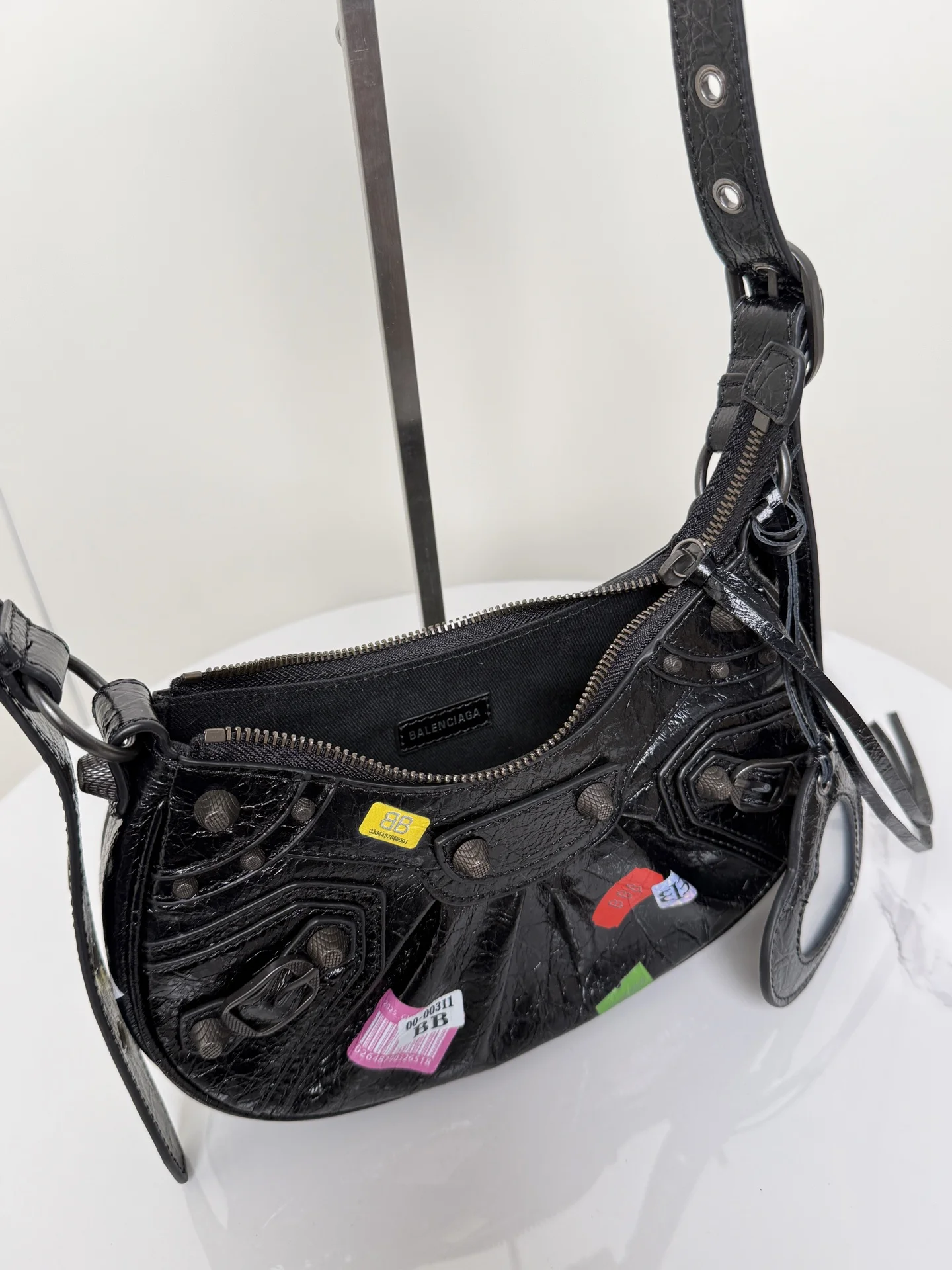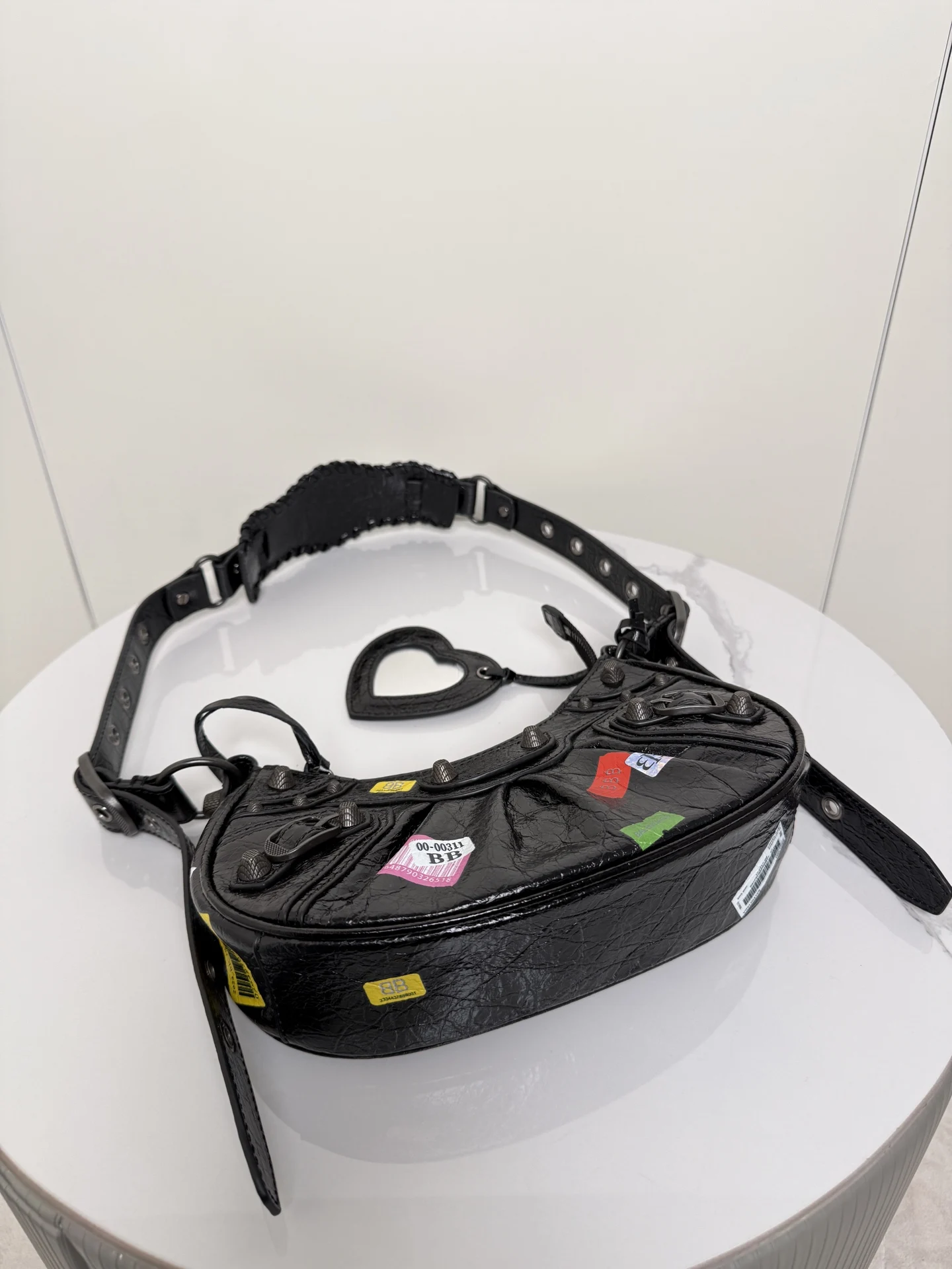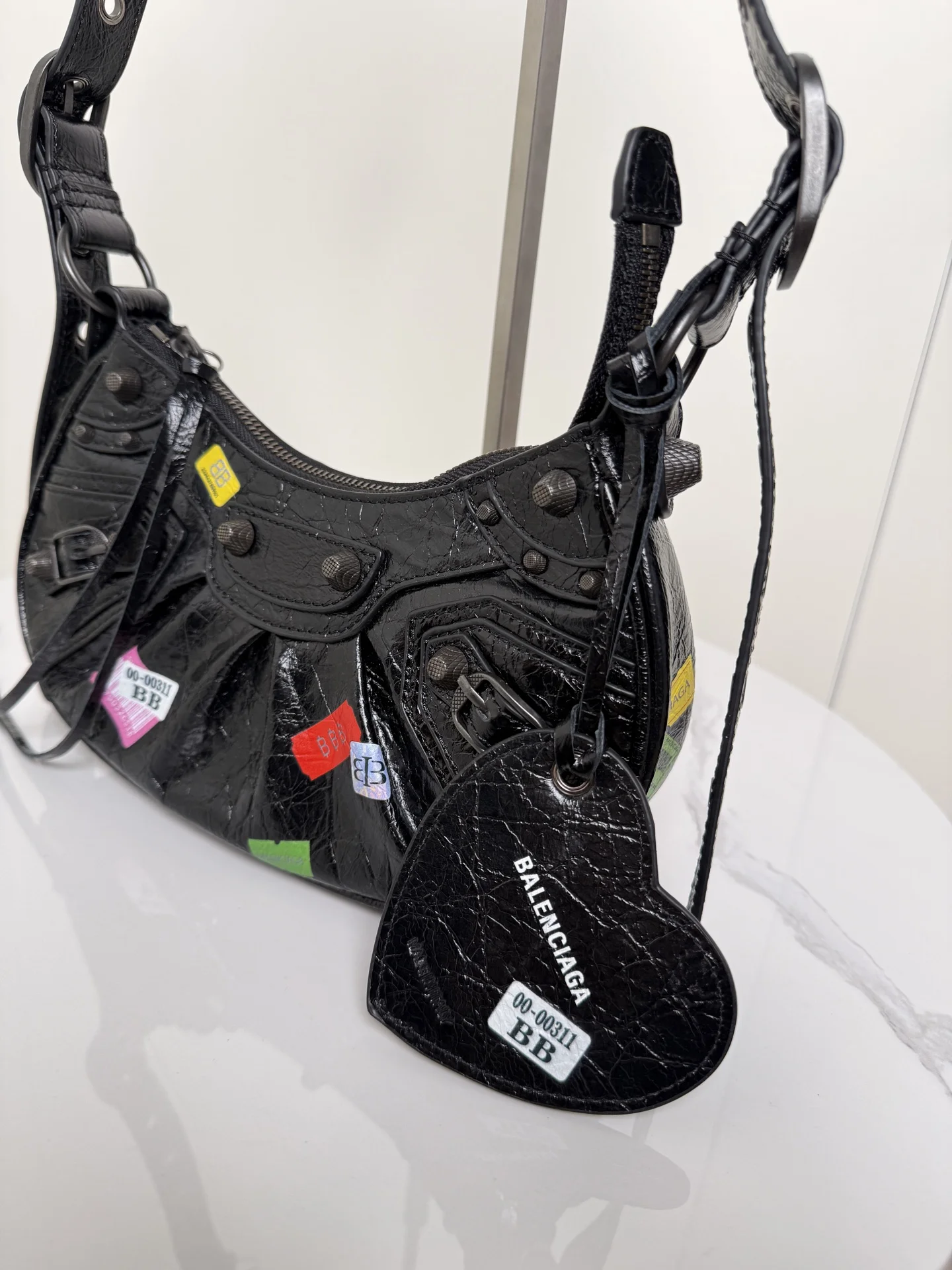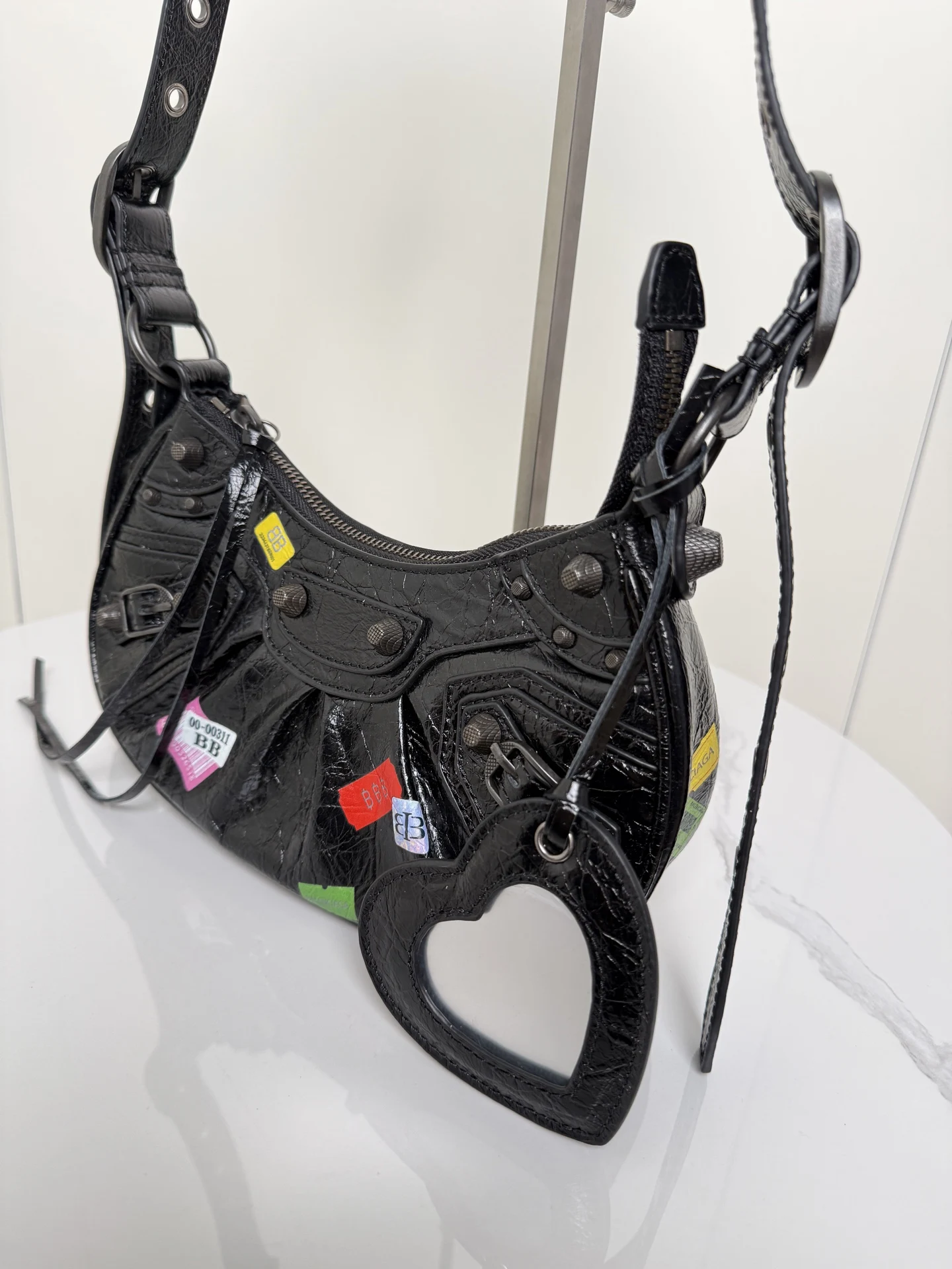 𝐁𝐚𝐥𝐞𝐧𝐜𝐢𝐚𝐠𝐚 Le Cagole涂鸦贴饰月亮包 进口裂纹羊皮 采用银色铆钉流苏拉链 月牙包型立体配上可调节肩带随意切换斜挎单肩 编织宽肩垫背起来舒适度拉满 这款附带1个小配件心形镜子 实用又时髦 甜酷风格轻松拿捏 是时尚爱好者必入的经典热爱款