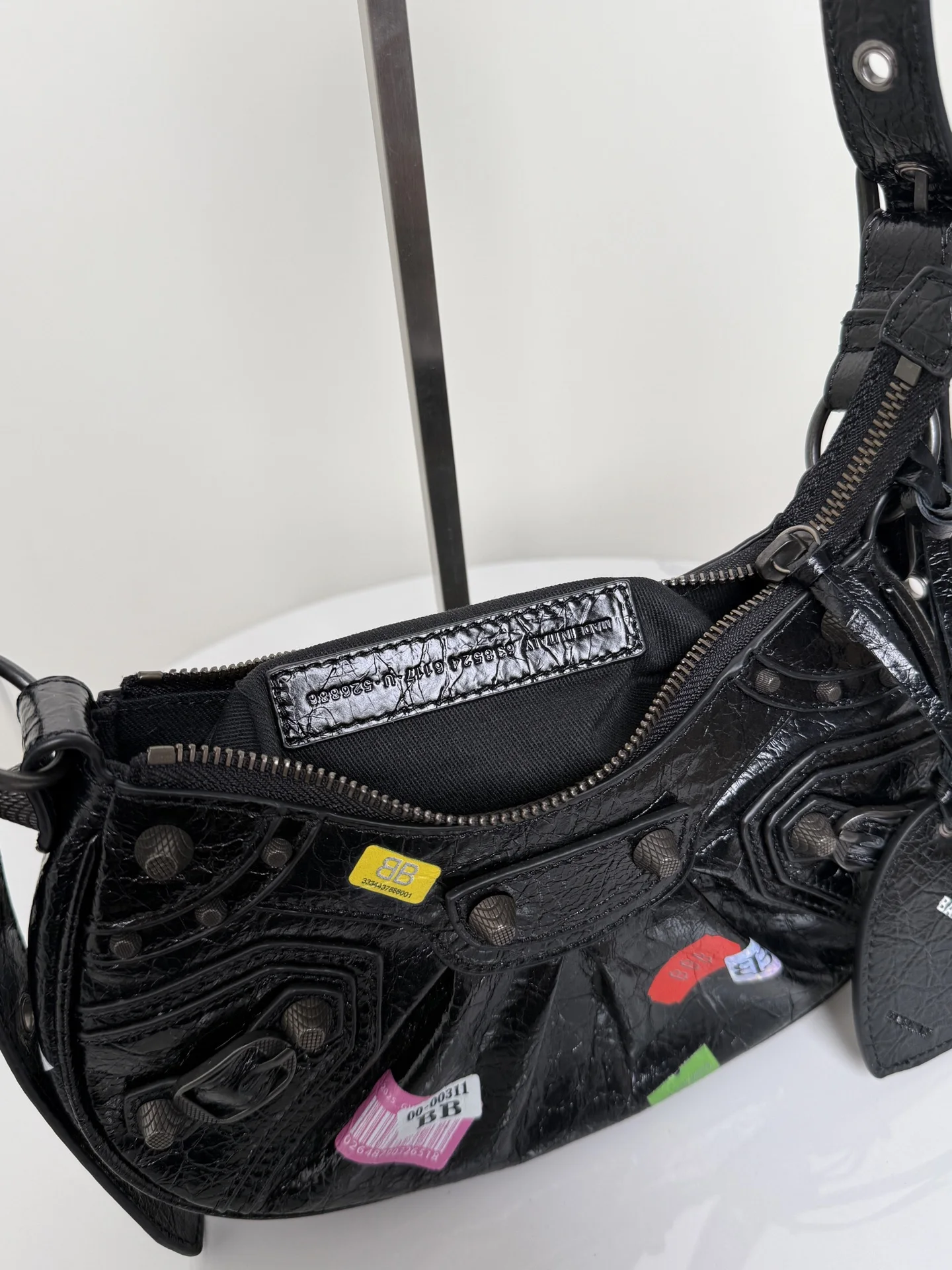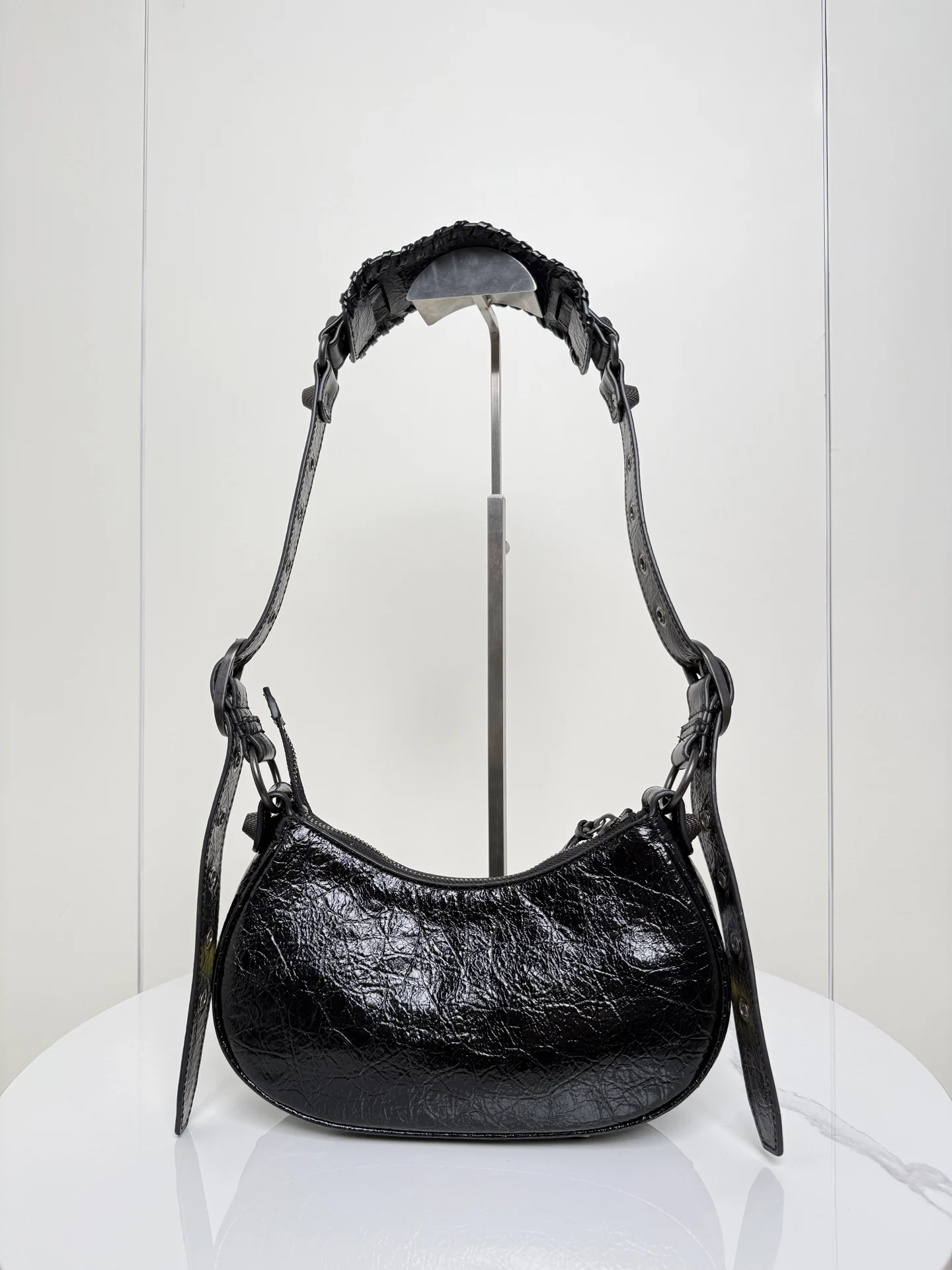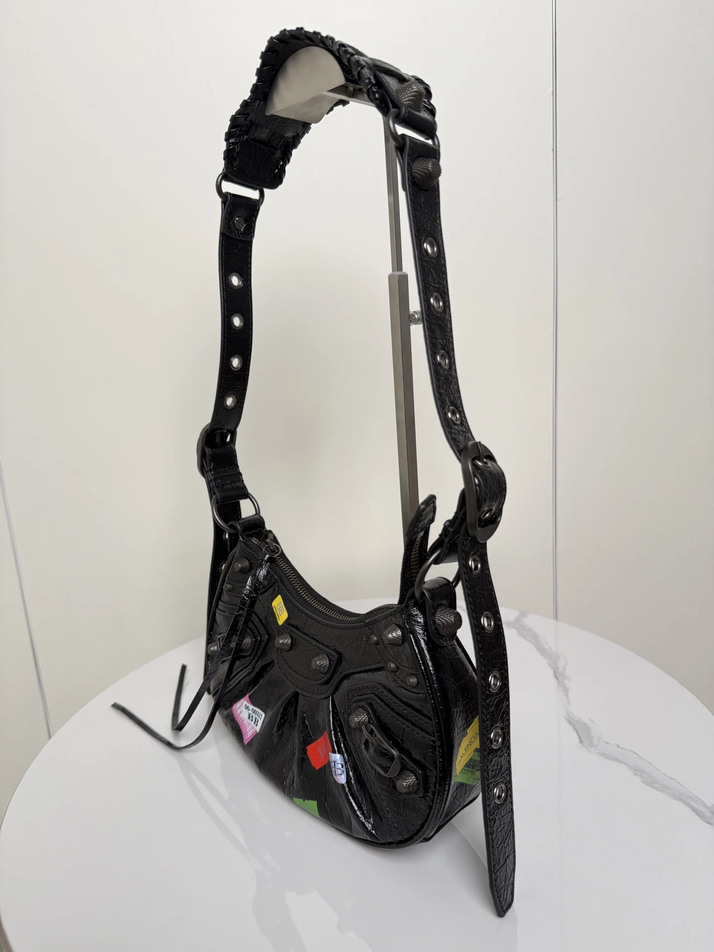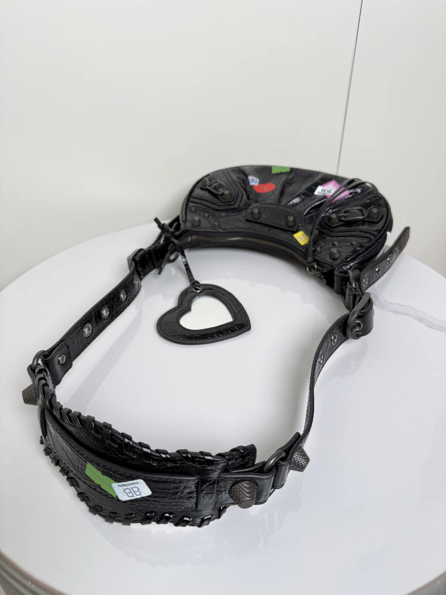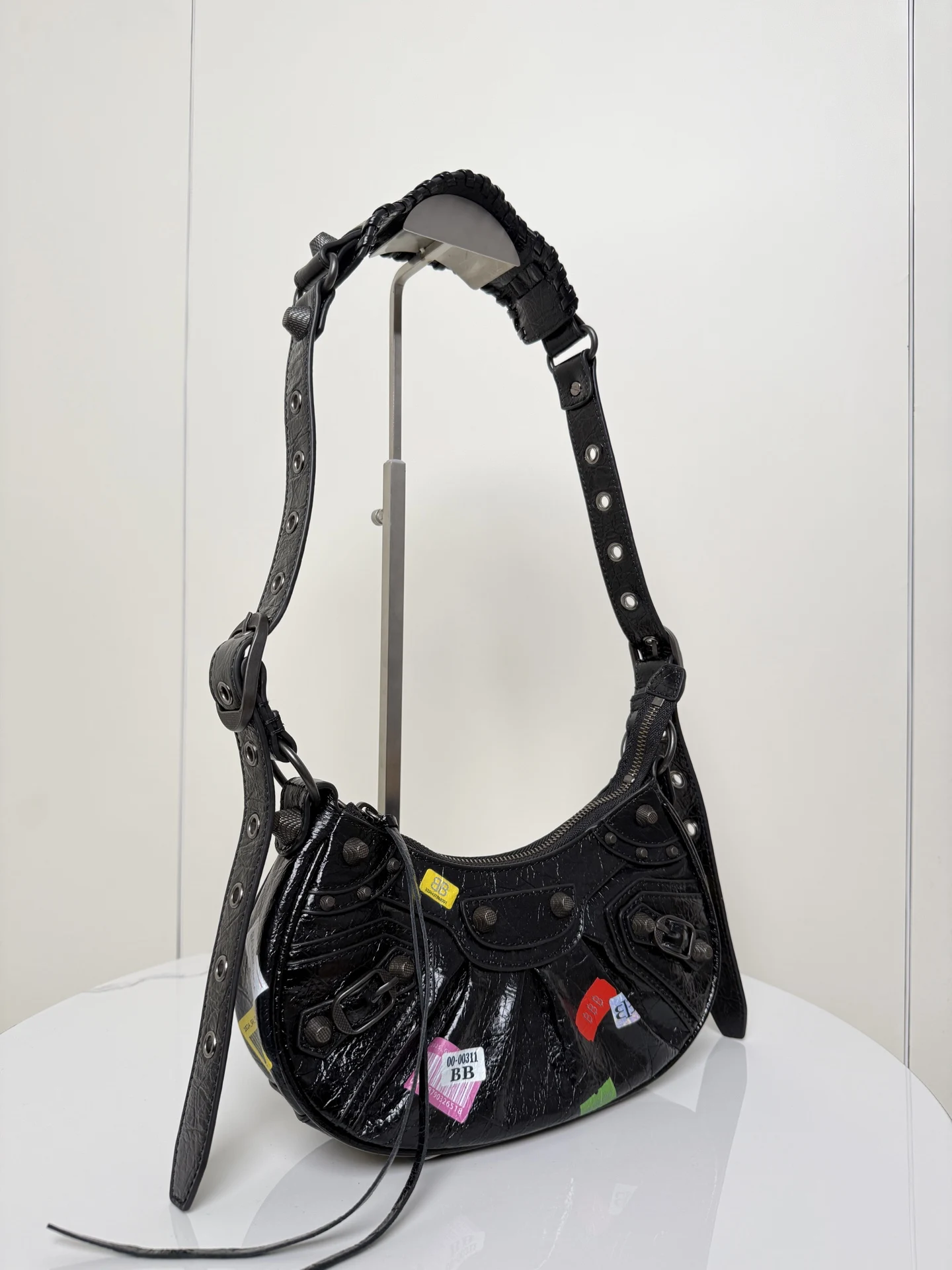 𝐁𝐚𝐥𝐞𝐧𝐜𝐢𝐚𝐠𝐚 Le Cagole涂鸦贴饰月亮包 进口裂纹羊皮 采用银色铆钉流苏拉链 月牙包型立体配上可调节肩带随意切换斜挎单肩 编织宽肩垫背起来舒适度拉满 这款附带1个小配件心形镜子 实用又时髦 甜酷风格轻松拿捏 是时尚爱好者必入的经典热爱款