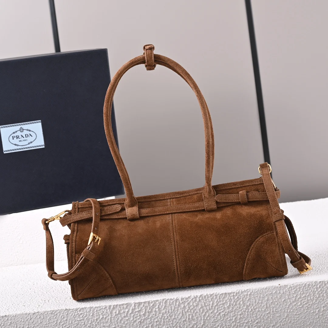 高级麂皮配金色五金标志性三角徽标配有长肩带可手提单肩或者斜挎时髦感直接拉满设计随性简约且精致又实用一款复古风格包包合适日常出行上身真的又酷又飒复古时髦的即视感