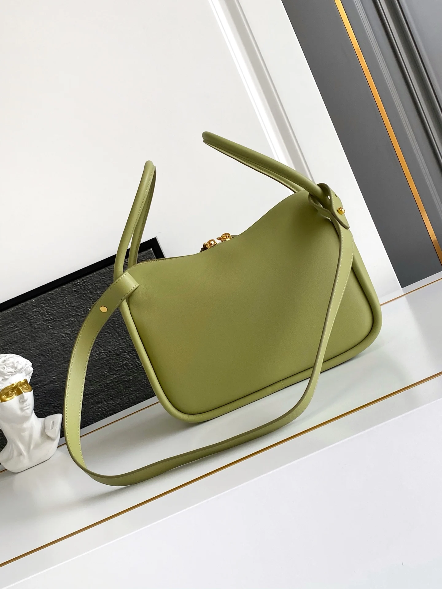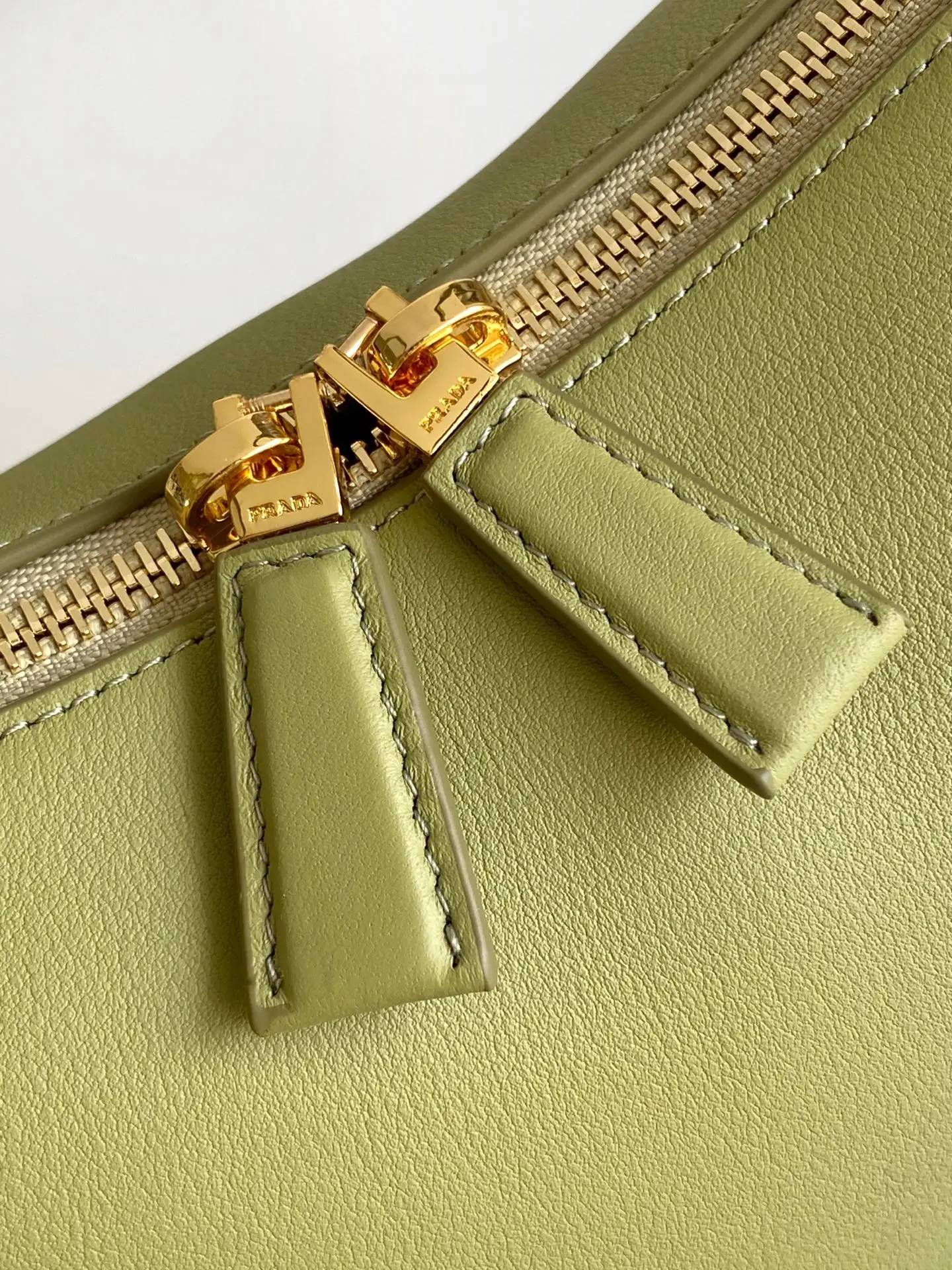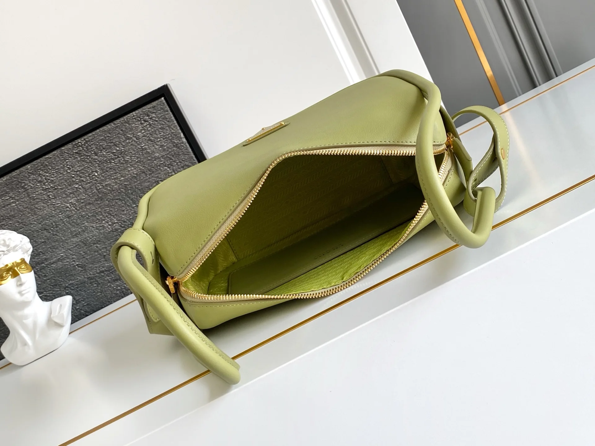 正面经典logo金色三角徽标拉链开合长手柄可手提可腋下背内袋宽敞设有贴袋满足精致收纳需求完美细节