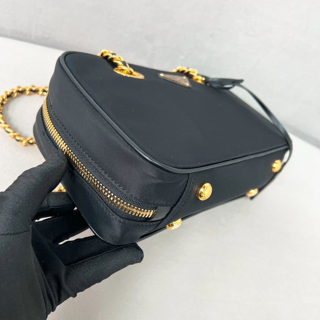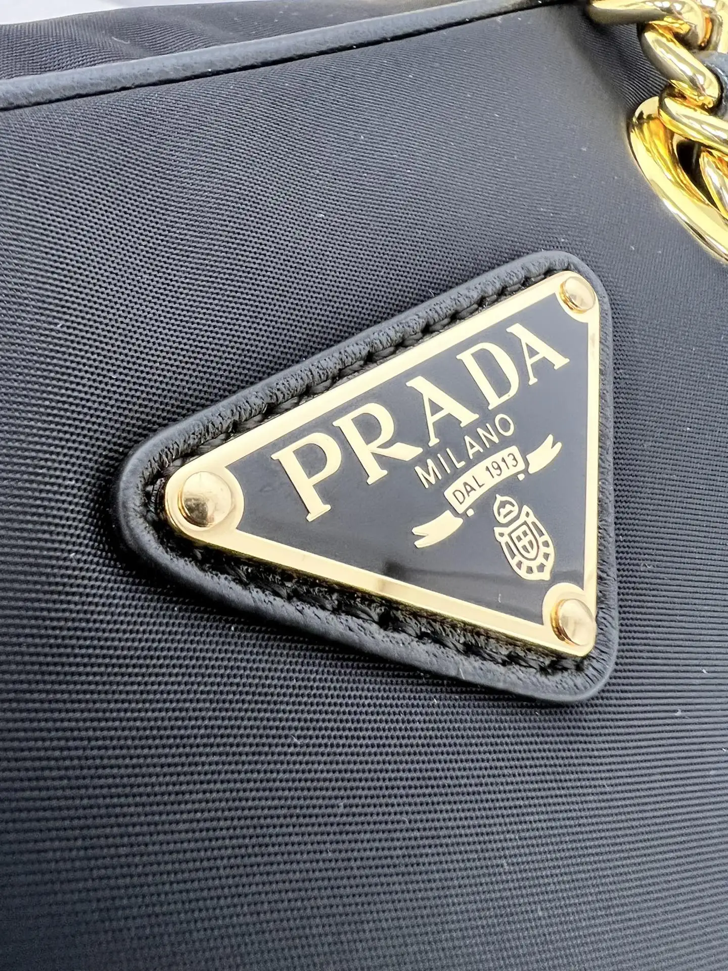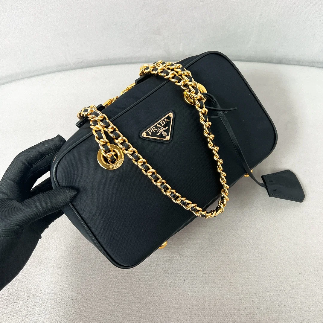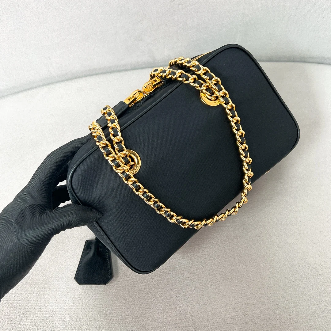 采用进口尼龙面料搭配黑金链条复古典雅优雅简洁的包身设计正面经典logo金色三角徽标全开式拉链开合内里设有拉链隔层和附袋满足精致收纳需求完美细节媲美砖柜超级棒5