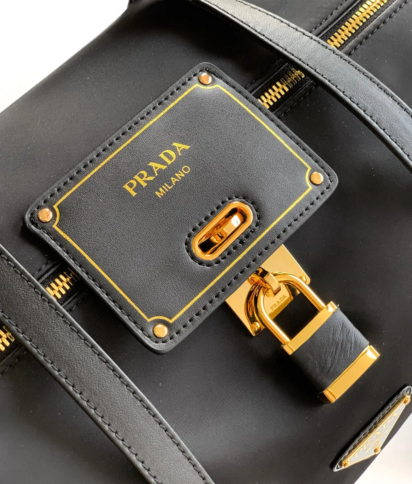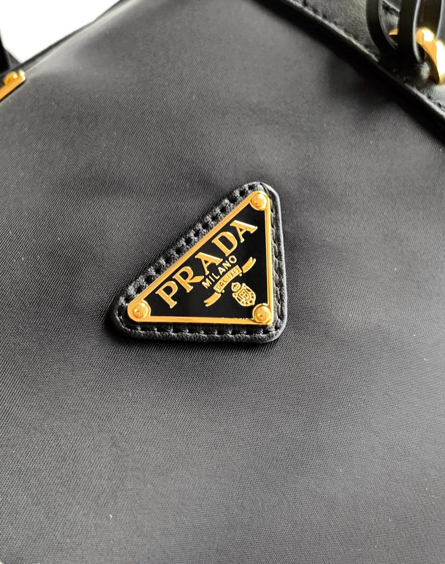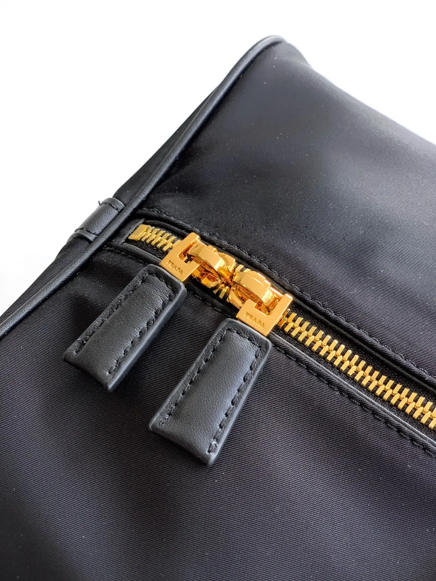 新款大号手提包 这款再生尼龙手袋结合实用细节 点缀皮革饰边 生动演绎档案库设计 大容量 搭配经典锁扣开合 灵感源自旅行箱 皮革手提柄 垂长32厘米 可拆卸皮革钥匙扣 饰有金属五金配件和涂珐琅三角形金属徽标 拉链和挂锁开合增添别致素 容量空间大 可休闲可酷背起来又实用又时尚喜欢的宝宝们赶紧入手吧