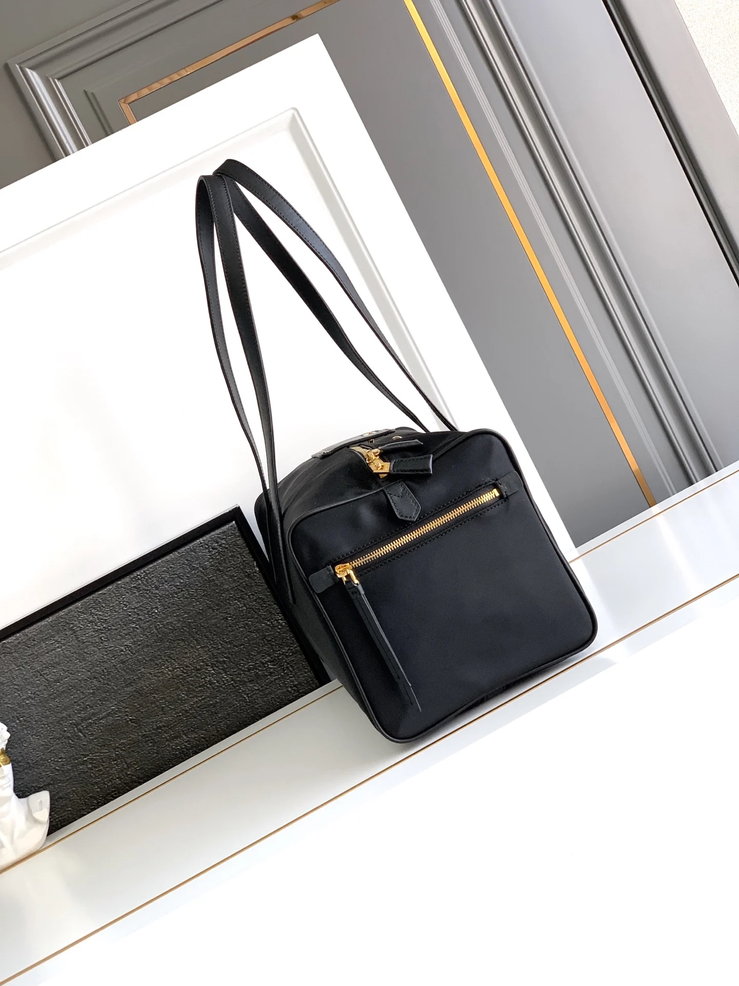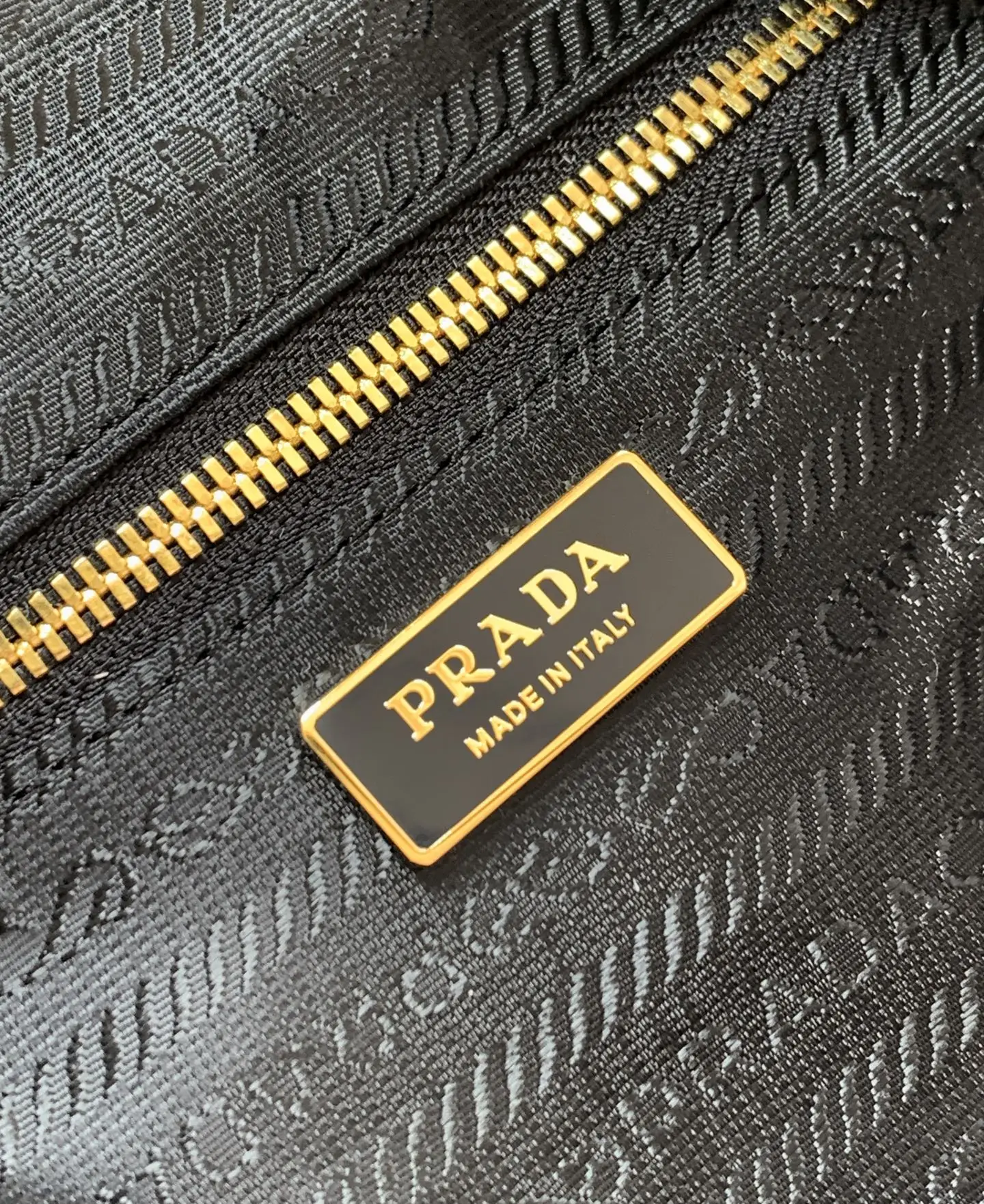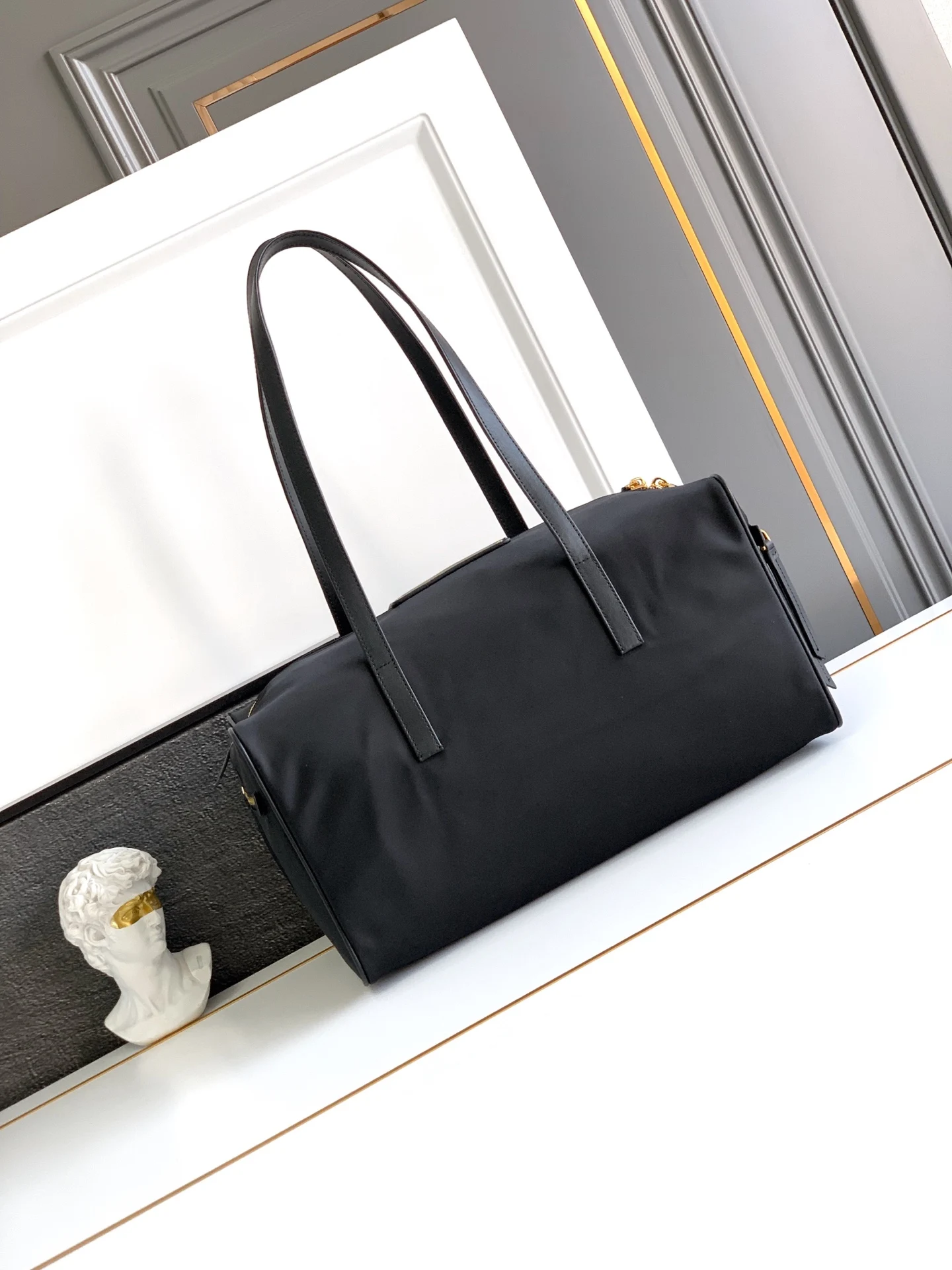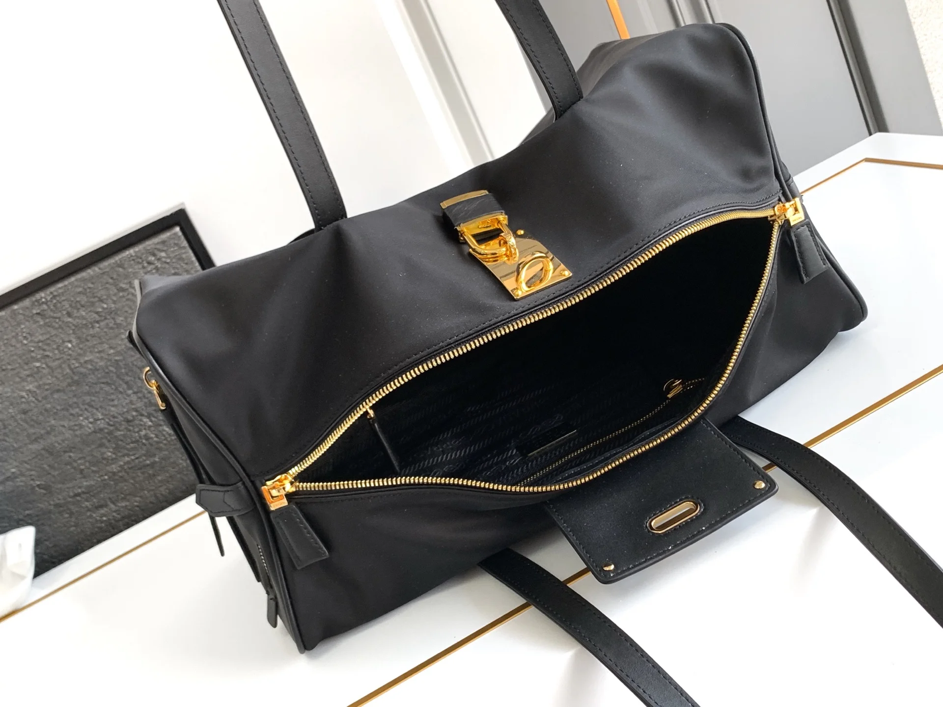 新款大号手提包 这款再生尼龙手袋结合实用细节 点缀皮革饰边 生动演绎档案库设计 大容量 搭配经典锁扣开合 灵感源自旅行箱 皮革手提柄 垂长32厘米 可拆卸皮革钥匙扣 饰有金属五金配件和涂珐琅三角形金属徽标 拉链和挂锁开合增添别致素 容量空间大 可休闲可酷背起来又实用又时尚喜欢的宝宝们赶紧入手吧
