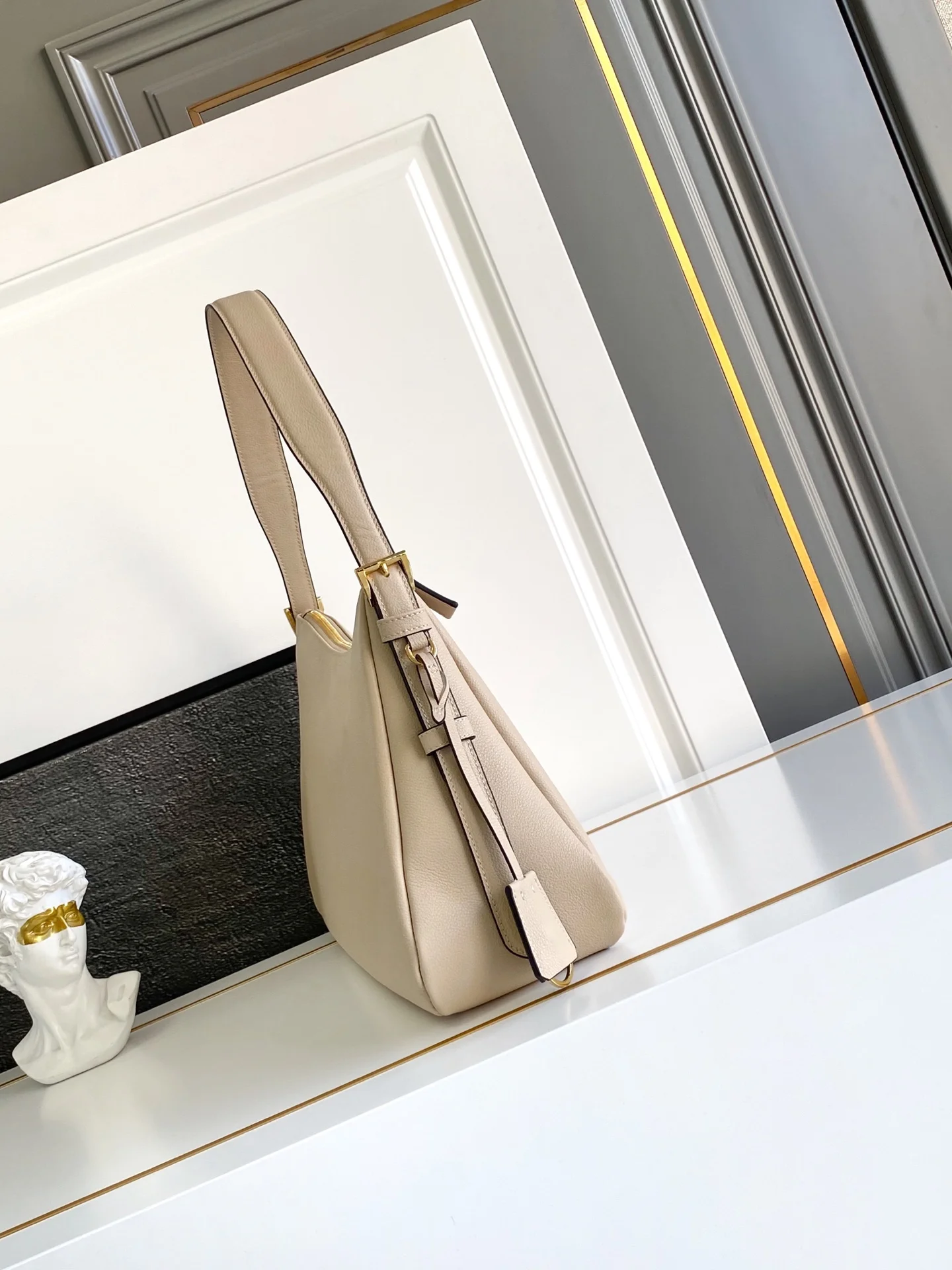 新款Aimee腋下包这款皮革Hobo腋下包设计气质简约 采用进口小牛皮 正面金属三角形珐琅徽标 配有可拆卸皮革肩带 皮质细腻柔软 实用轻便容量空间大高级百搭 又一个时尚爆款 赶紧入手吧 太美了