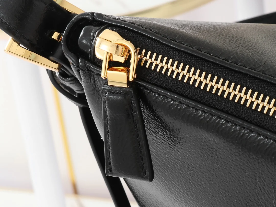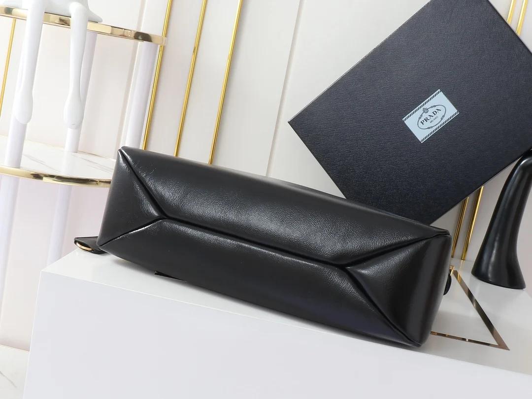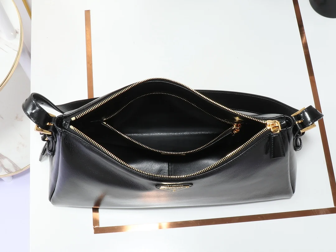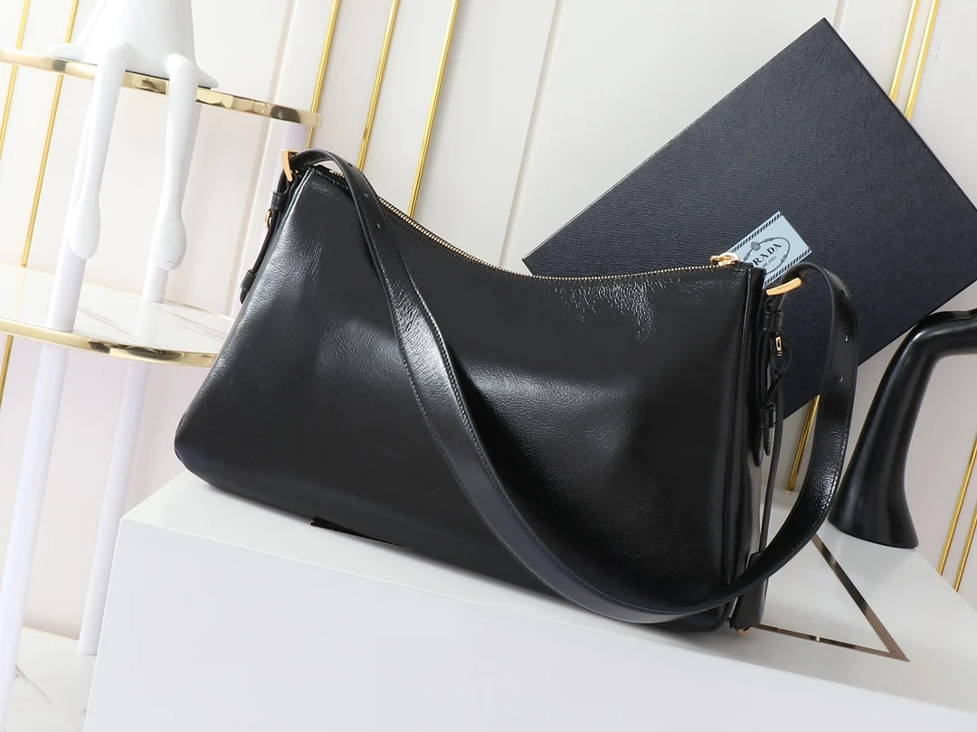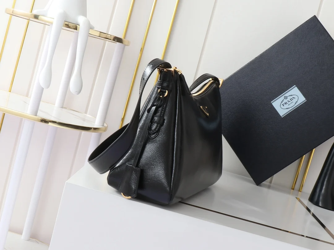 Prada最新款手袋 皱漆皮 新款单肩包的设计灵感源自对Hobo廓形的探索 线条柔美 颇具现代感 皮质柔软 超级百搭 背法很多 婉转的皮革轮廓结合容量大空间充足 內里配有拉链袋 一个插袋金属五金配件点缀其间 上身效果非常时尚又大气 赶紧入手吧 又是一款永久不过时爆款