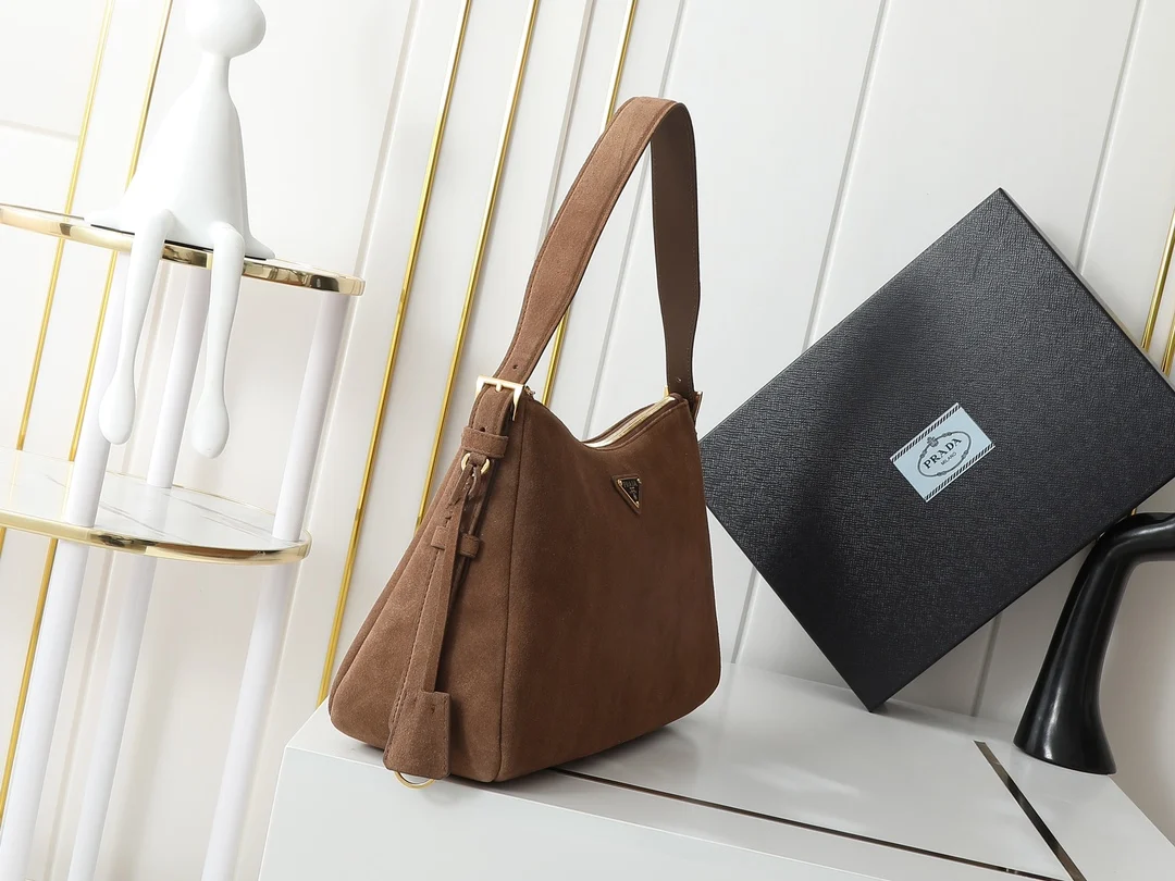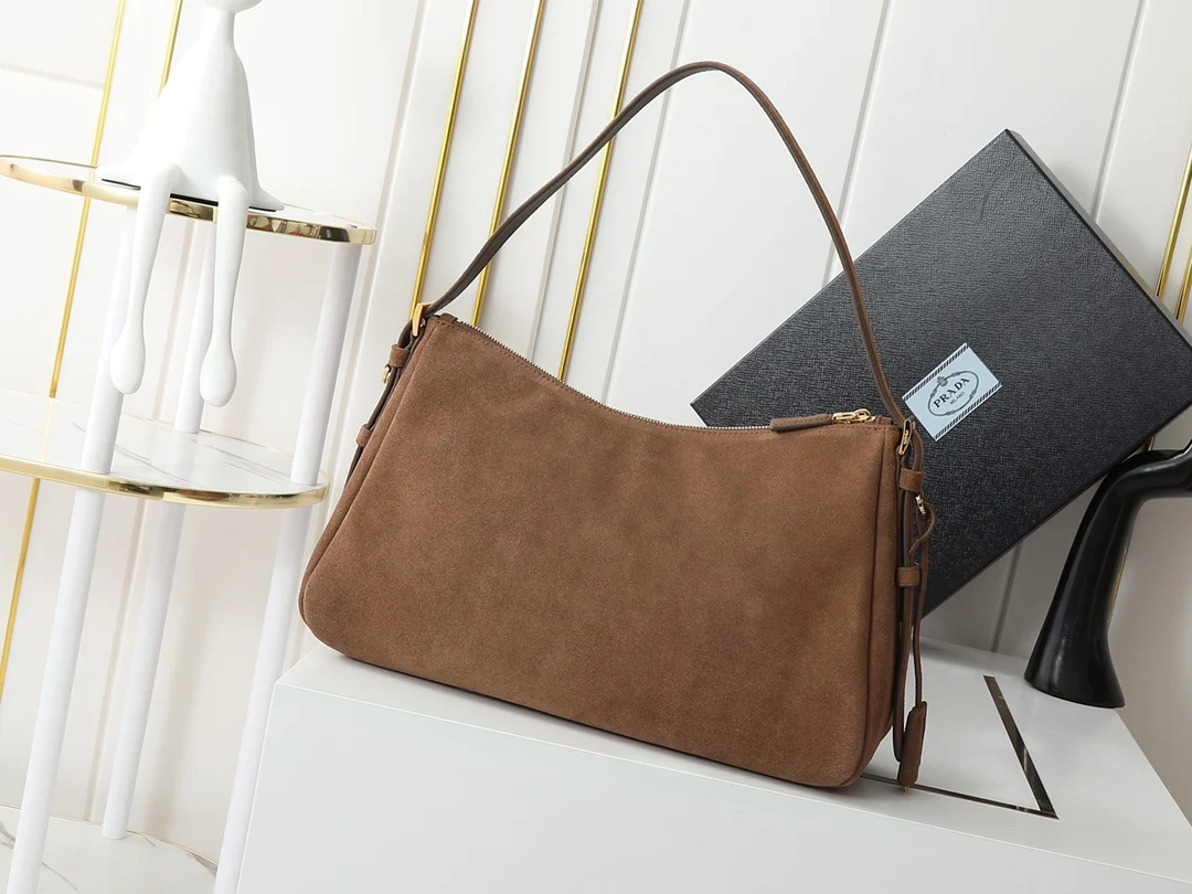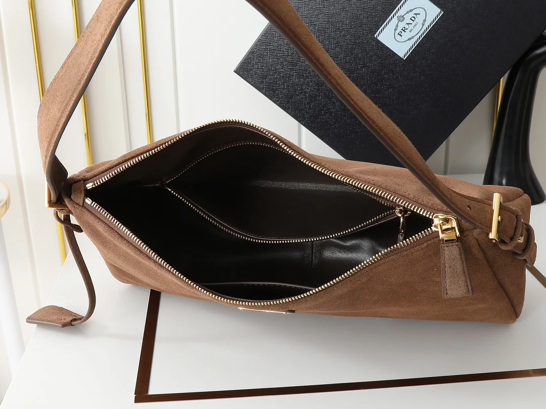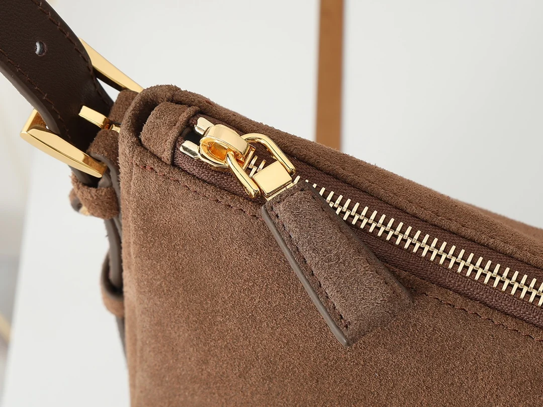 新款腋下包Aimee绒面麂皮 大号磨砂皮到货啦新款单肩包的设计灵感源自对Hobo廓形的探索 线条柔美 颇具现代感 皮质柔软 超级百搭 背法很多 婉转的皮革轮廓结合容量大空间充足 內里配有拉链袋 一个插袋金属五金配件点缀其间 上身效果非常时尚又大气 赶紧入手吧 又是一款永久不过时爆款