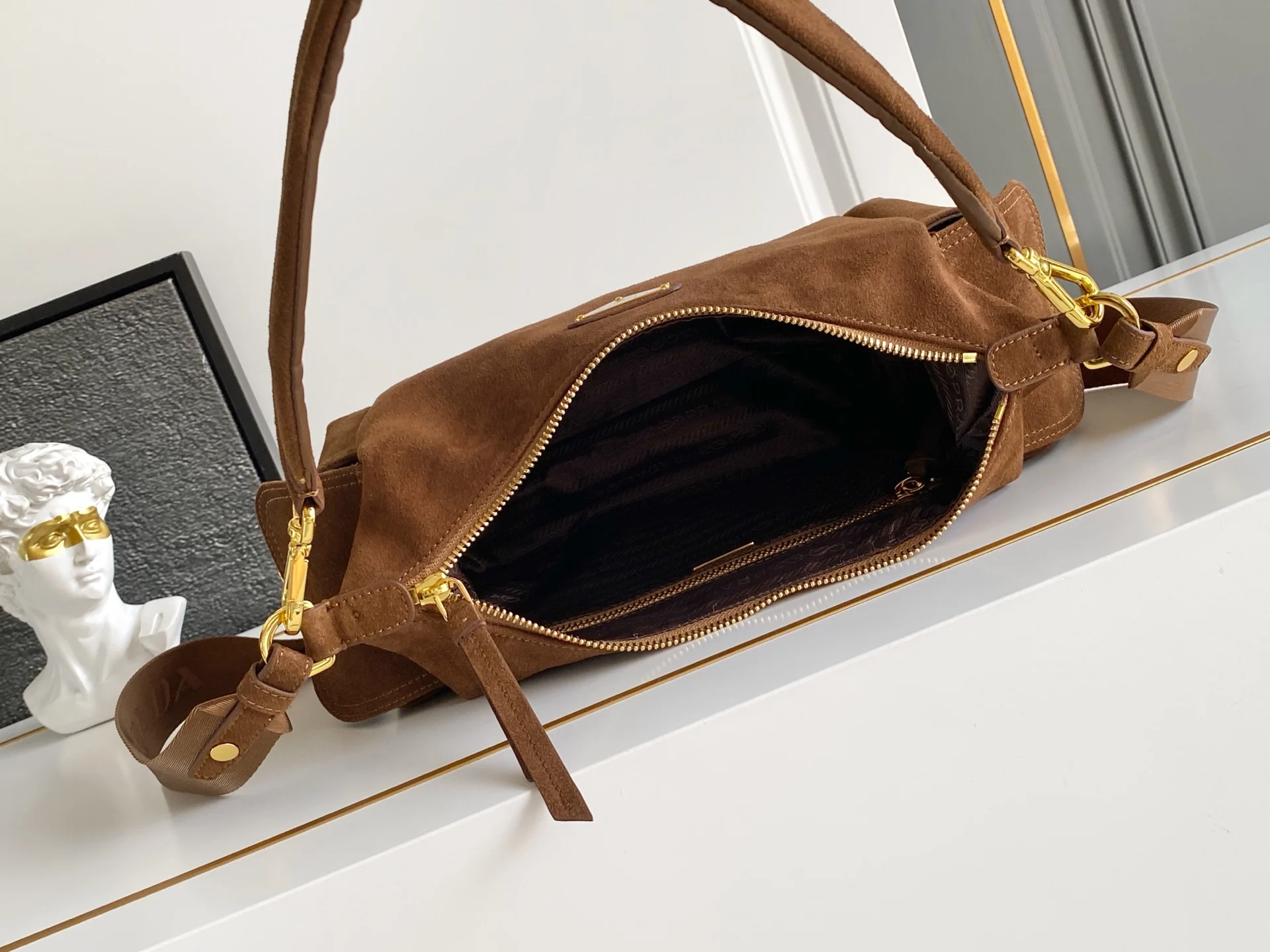 这款探索包采用进口麂皮 具有柔软的轮廓和多个口袋 轻质实用的Re-Nylon强调了设计的多功能风格 而皮革细节和标志性点缀则反映了P家的手工传统 配有2条可拆卸 可调节的编织标志带肩带 容量空间大 上身效果非常时尚 又是一款永久不过时爆款 值得拥有
