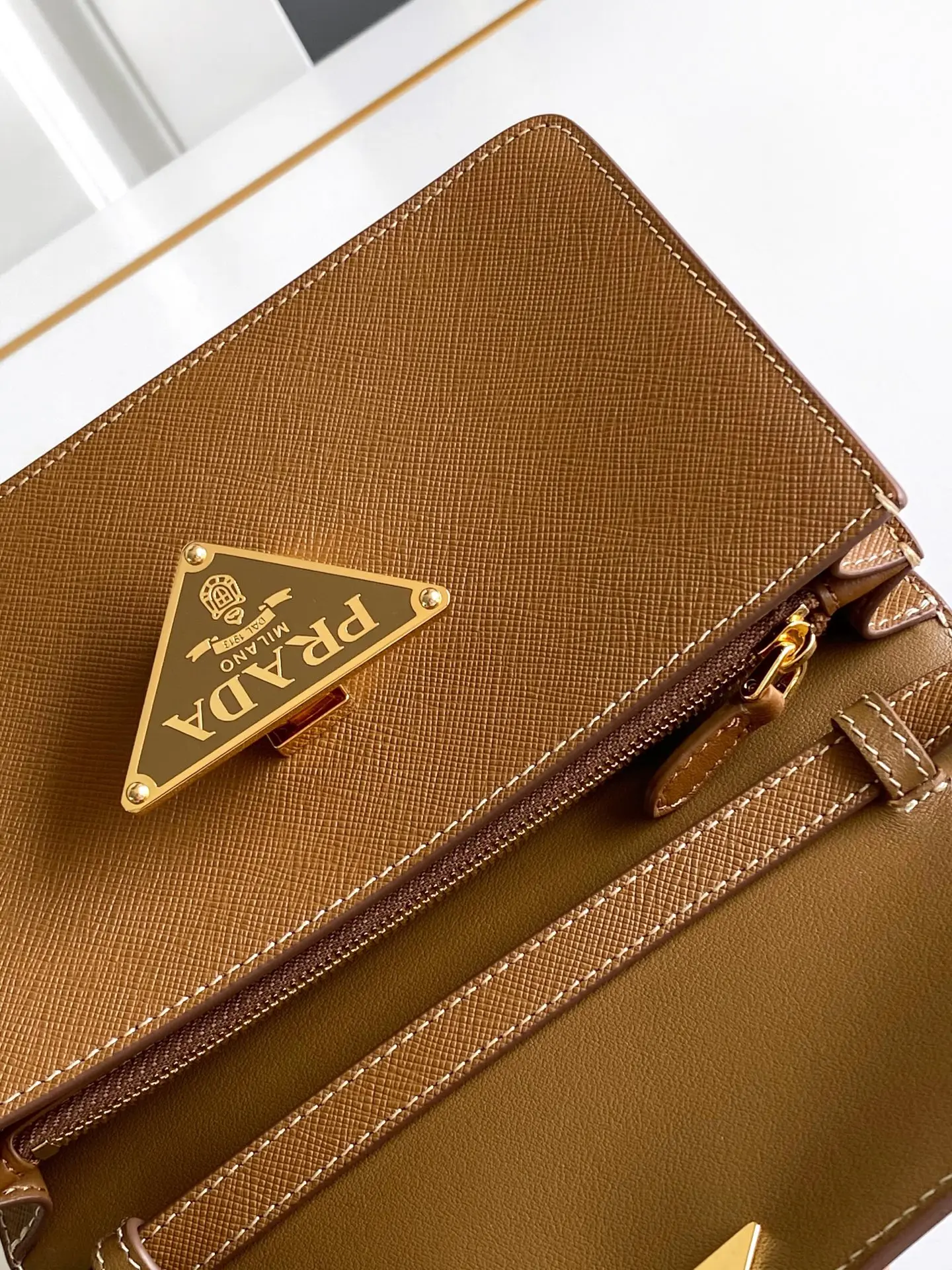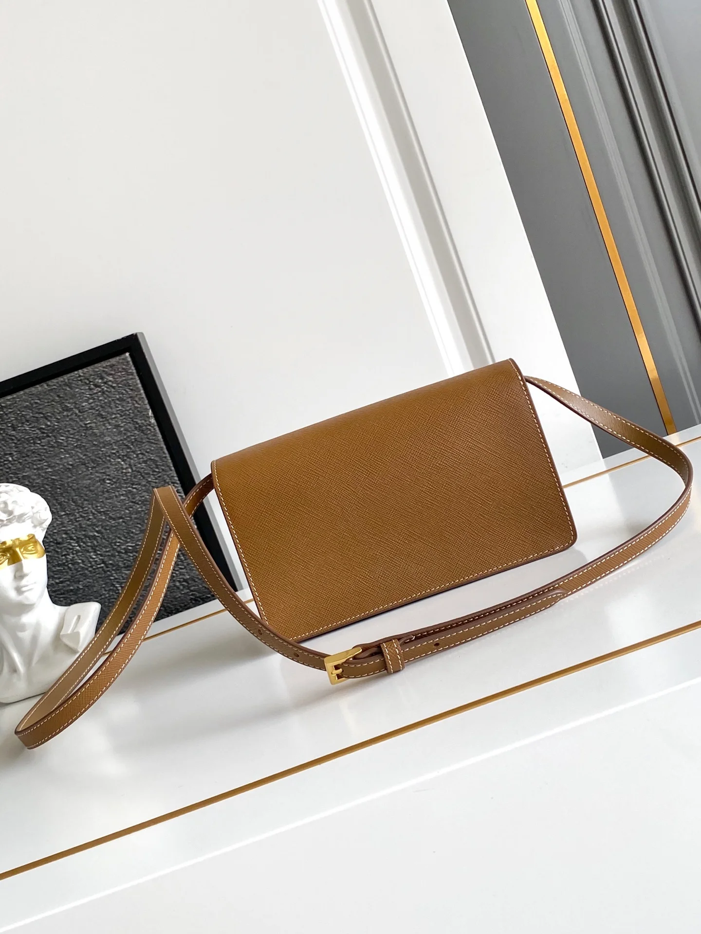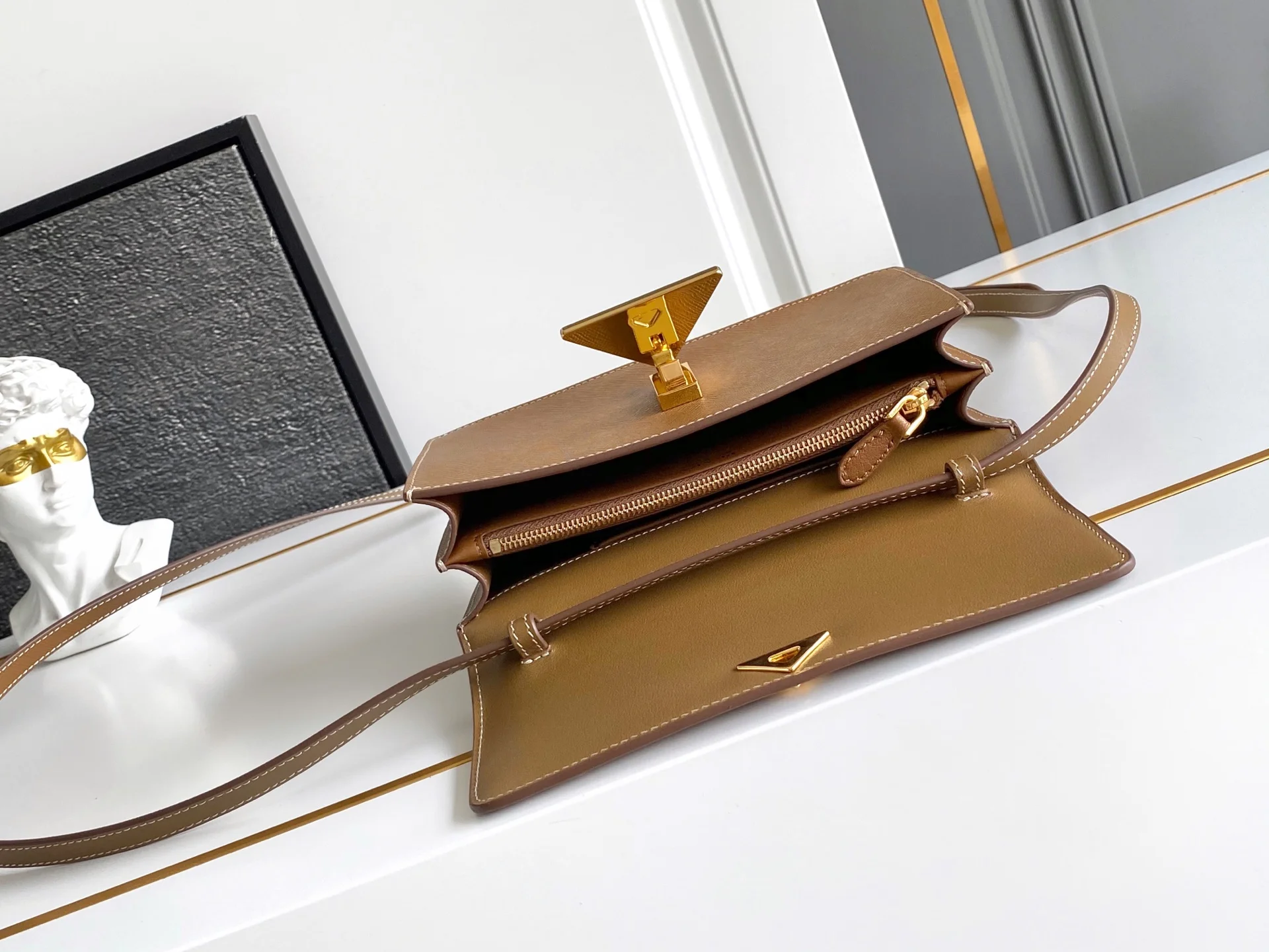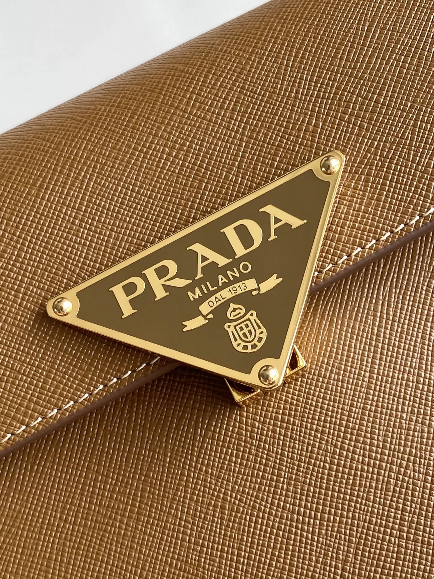 这款迷你手袋采用Saffano牛皮革打造 结构化的轮廓配有内部口袋和卡槽 并以金属标志性的三角形装饰闭合处 配有一条可调节可拆卸的长肩带 内配进口羊皮内里 平时出街容易空间全ok又是一款永久不过时爆款 赶紧入手吧
