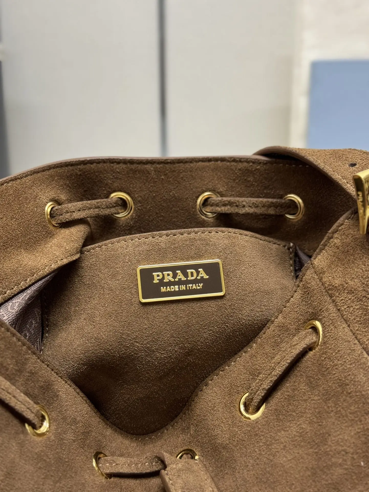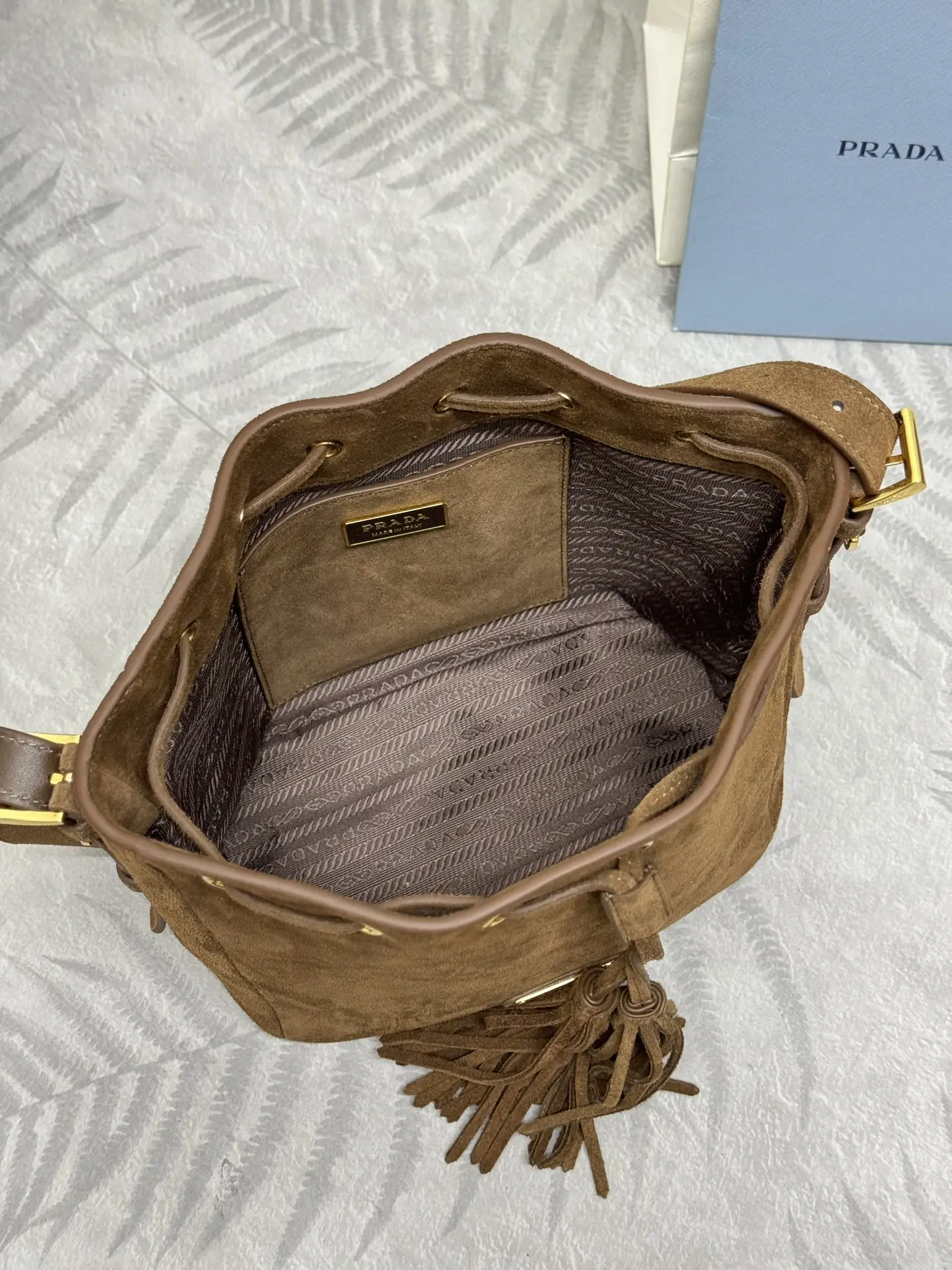 新款 磨砂皮 水桶包 麂皮到货啦绒面小牛皮材质 皮革提手 可拆卸可调节 金属刻字徽标 绒皮小流苏 顶部饰有皮革抽绳 内部有一个皮革口袋女神门赶紧入手