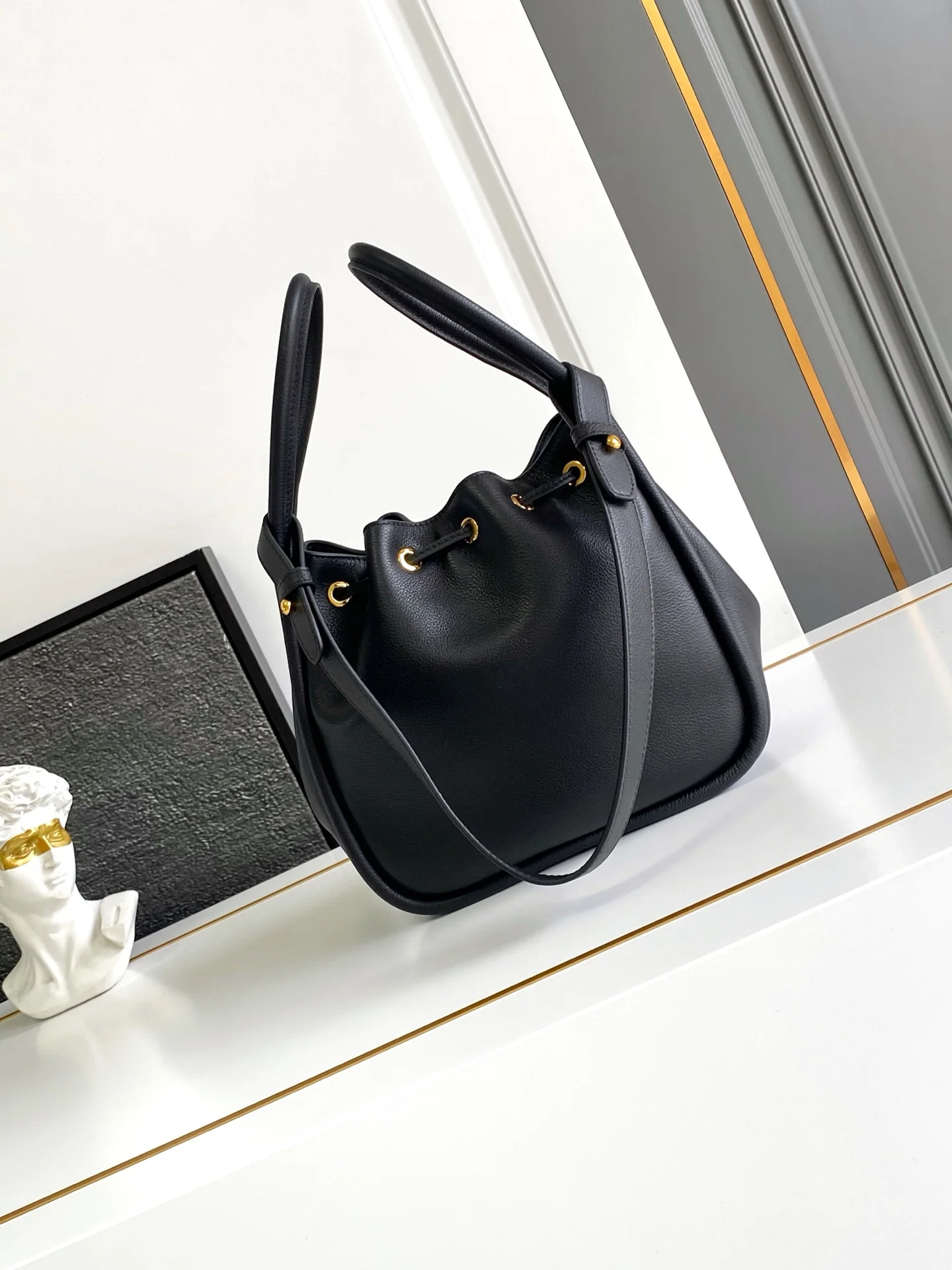 这款水桶包采用进小牛皮 配有一条可拆卸长肩带 多种背法 又可手提又可肩带 袋口为抽绳设计 功能性強 太完美空间大 上身效果好看又时尚 宝宝们 赶紧入手吧
