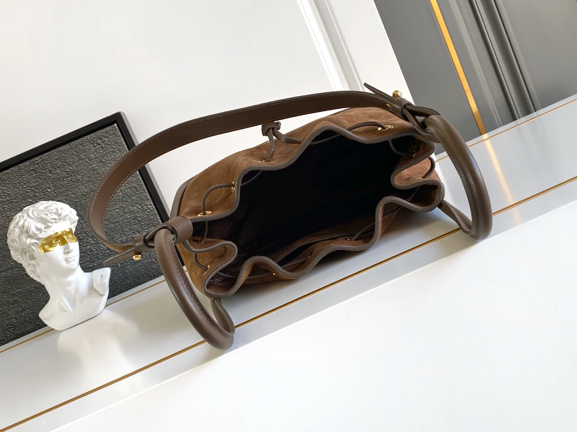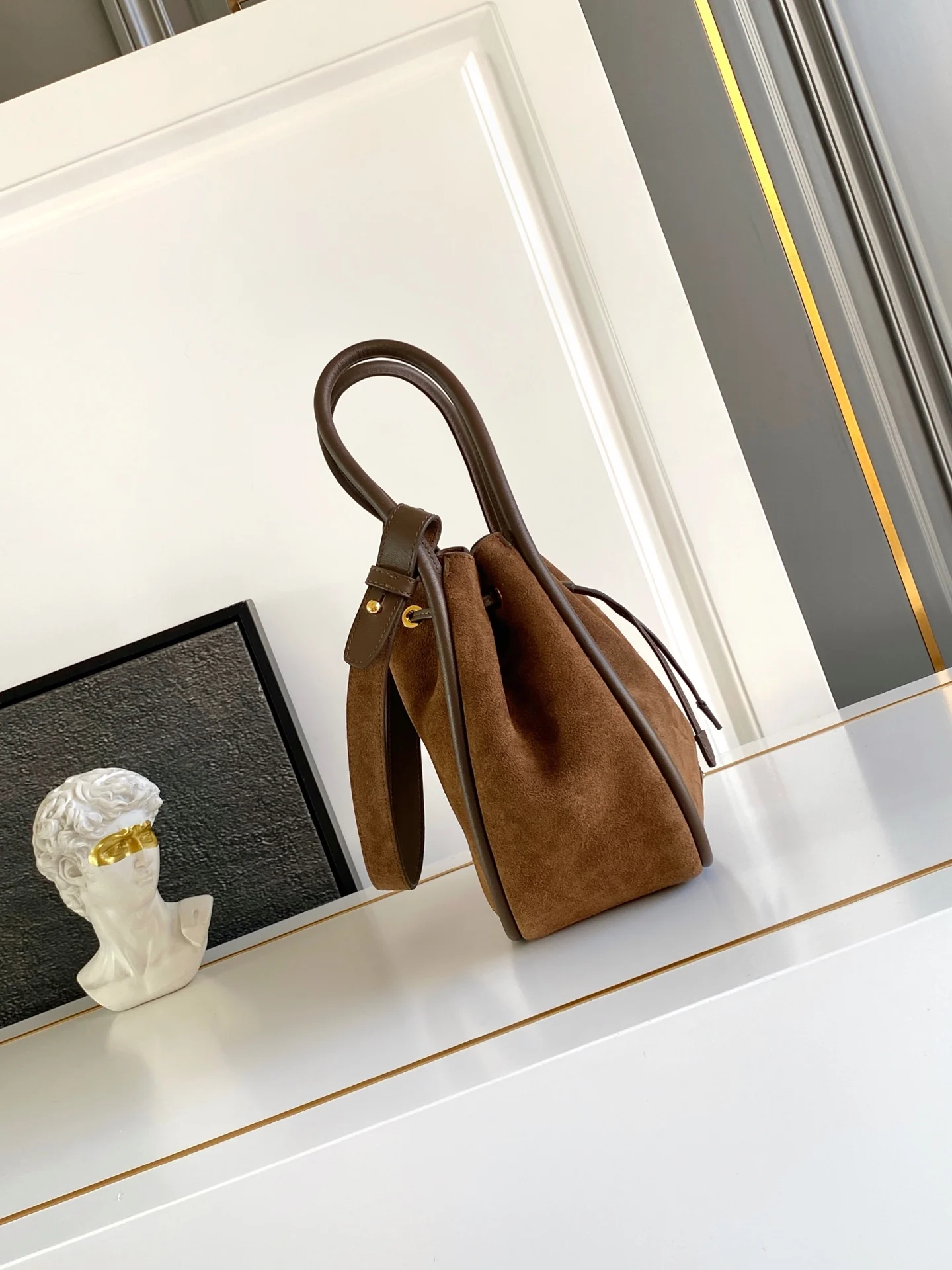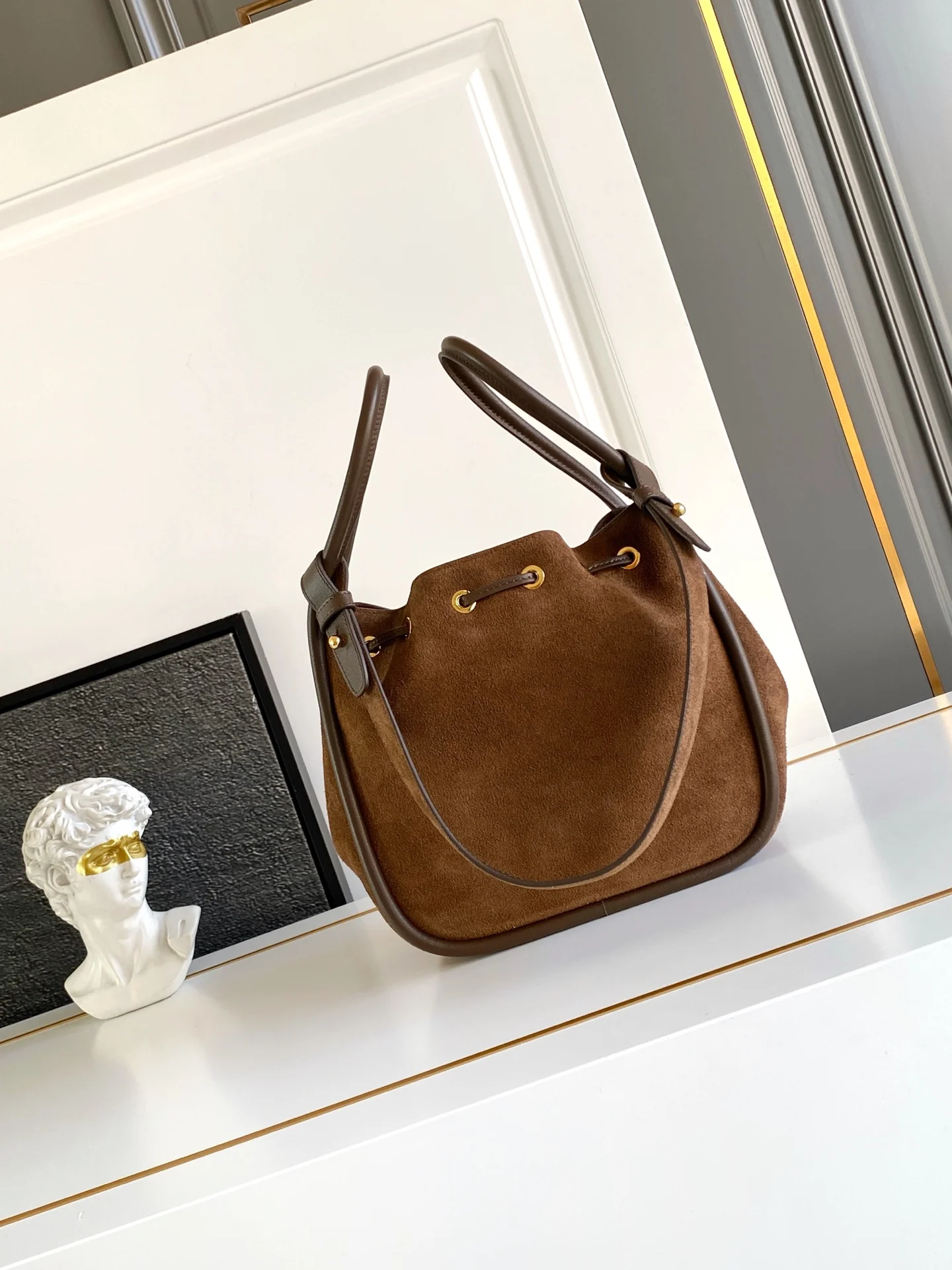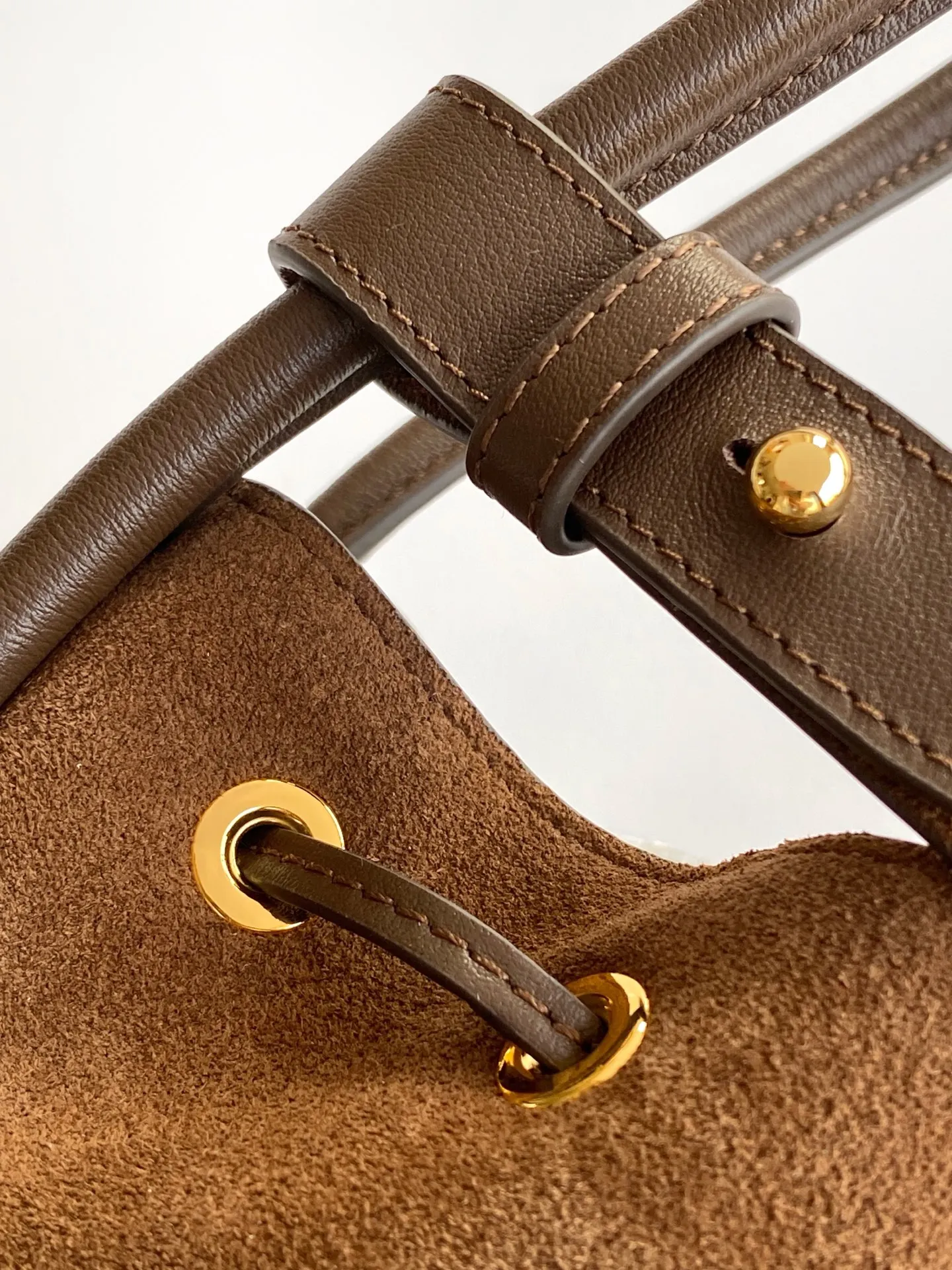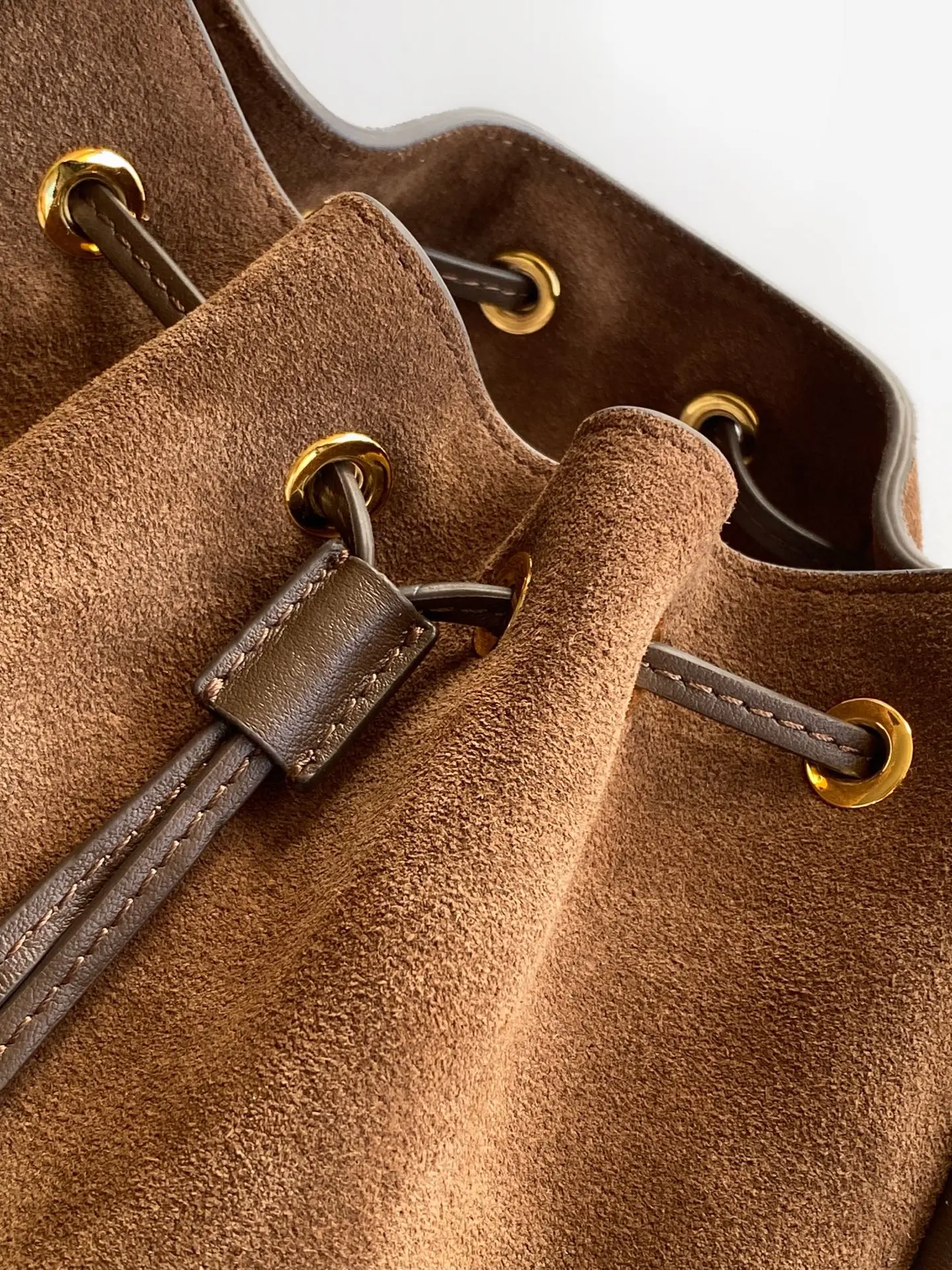 新款水桶包这款水桶包采用进麂皮 配有一条可拆卸长肩带 多种背法 又可手提又可肩带 袋口为抽绳设计 功能性強 太完美空间大 上身效果好看又时尚 宝宝们 赶紧入手吧
