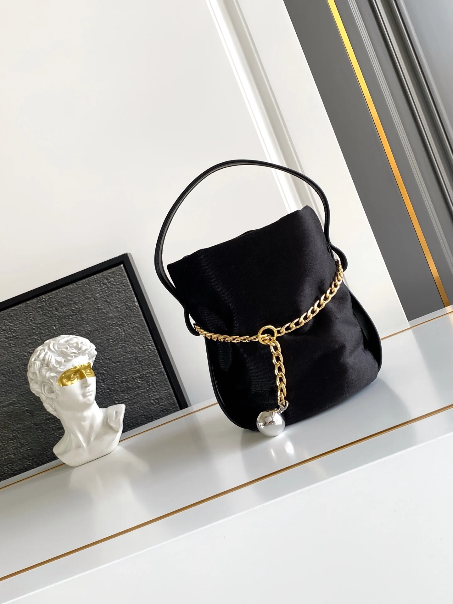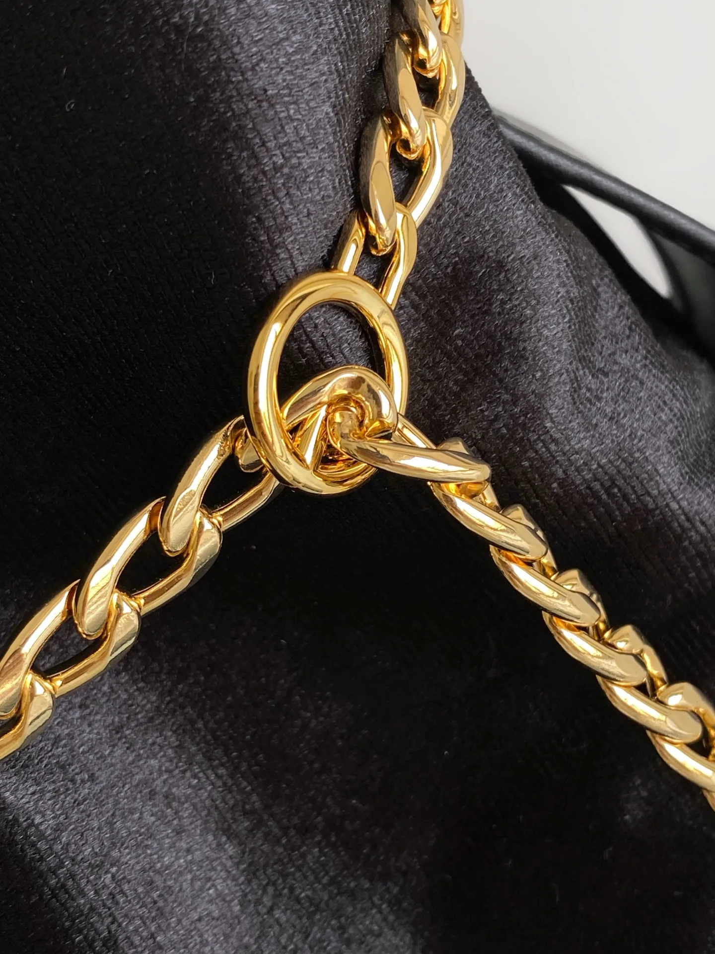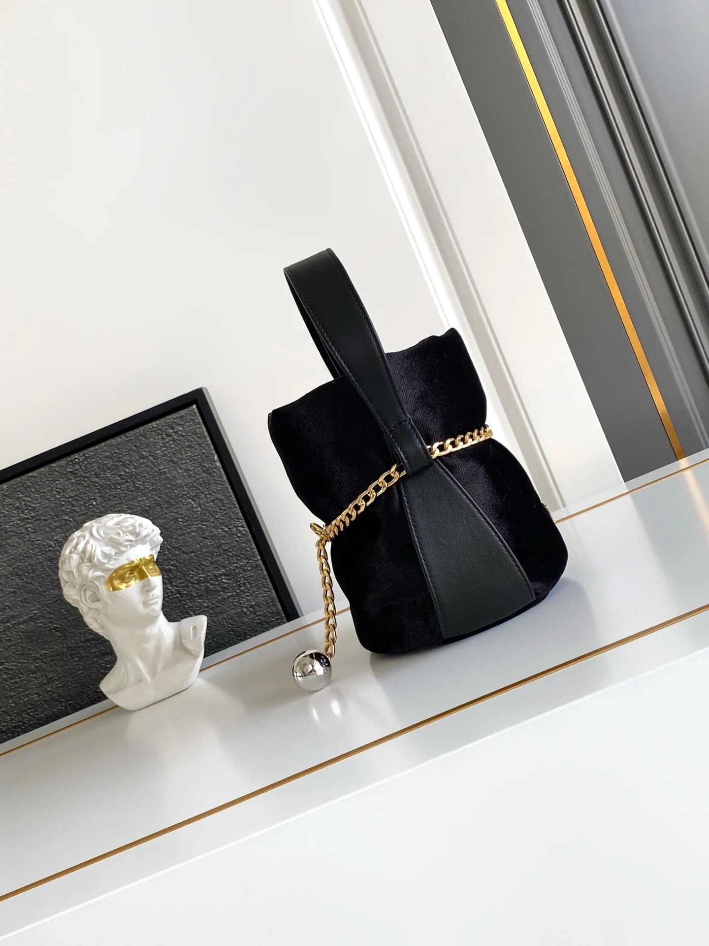 这款水桶包以天鹅绒和Nappa皮革精制而成 呈现柔和廓形 彰显高雅现代风格 设计的简约流畅与细节相结合 链条搭配球形吊坠 赋予其精致独特的风格 Nappa皮革手提柄 垂直长度10厘米