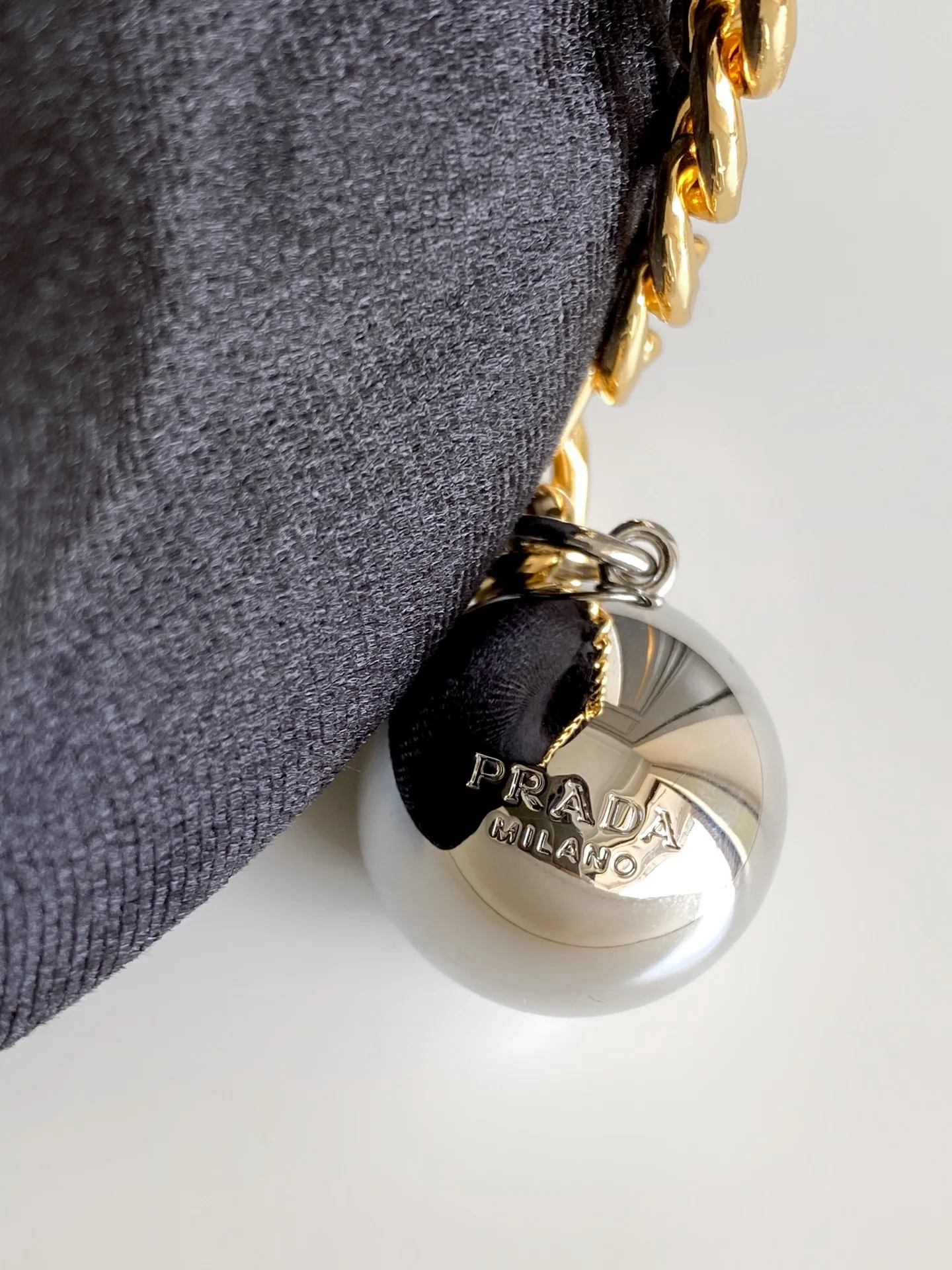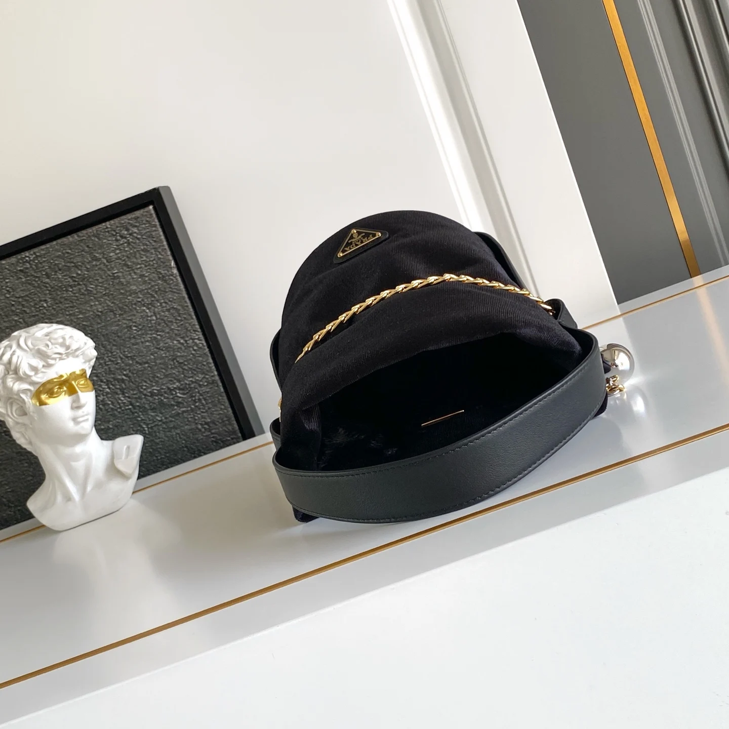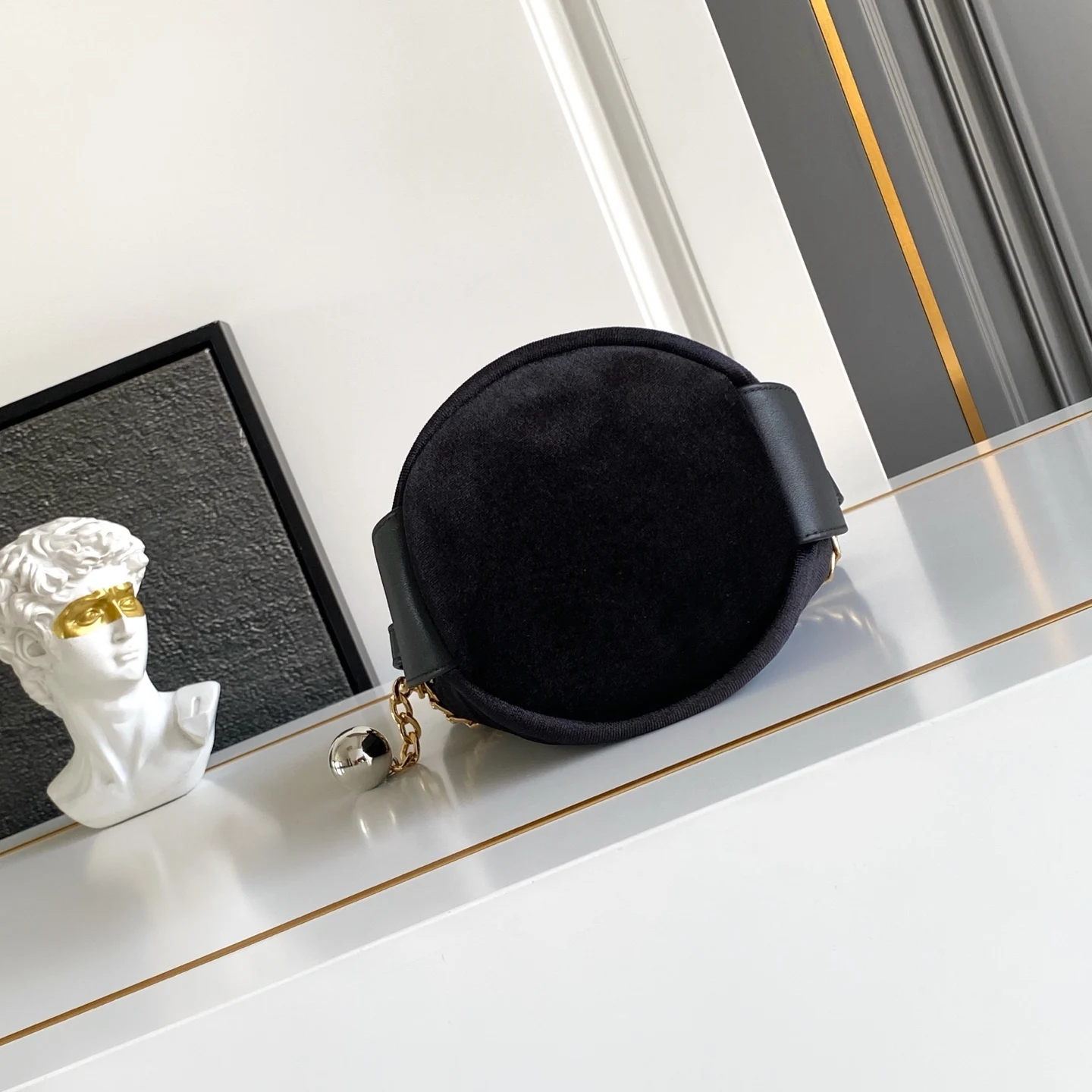 这款水桶包以天鹅绒和Nappa皮革精制而成 呈现柔和廓形 彰显高雅现代风格 设计的简约流畅与细节相结合 链条搭配球形吊坠 赋予其精致独特的风格 Nappa皮革手提柄 垂直长度10厘米