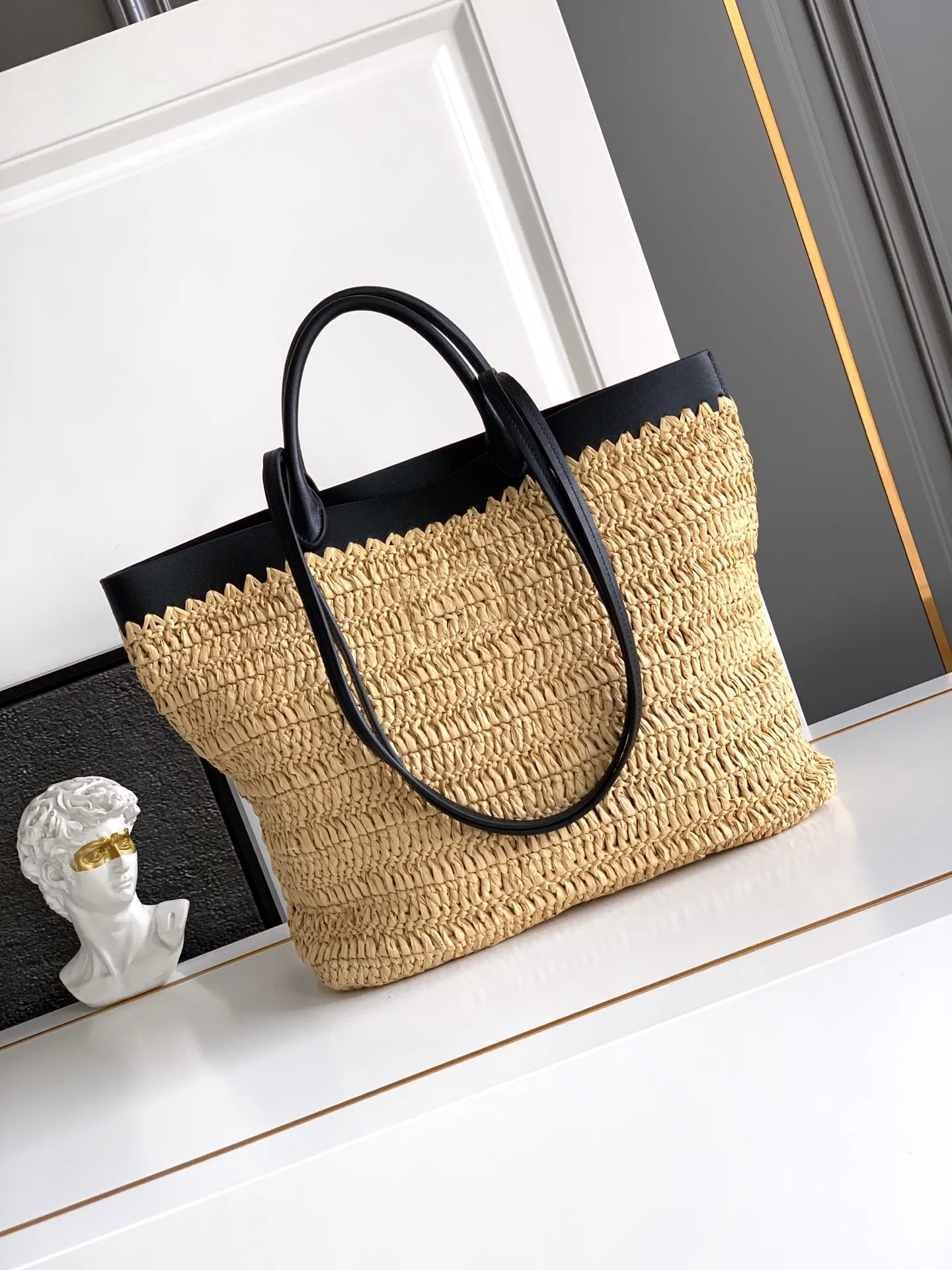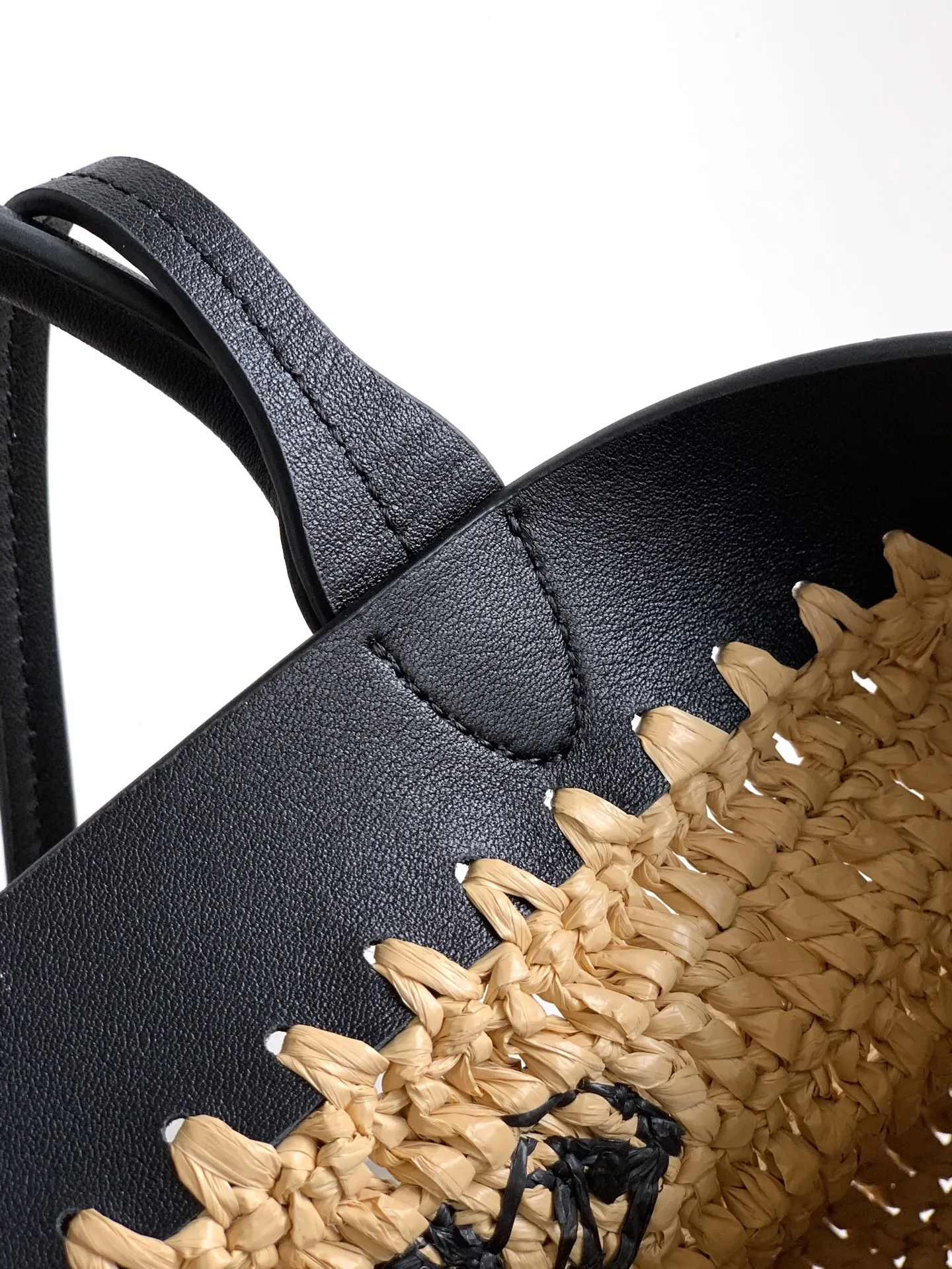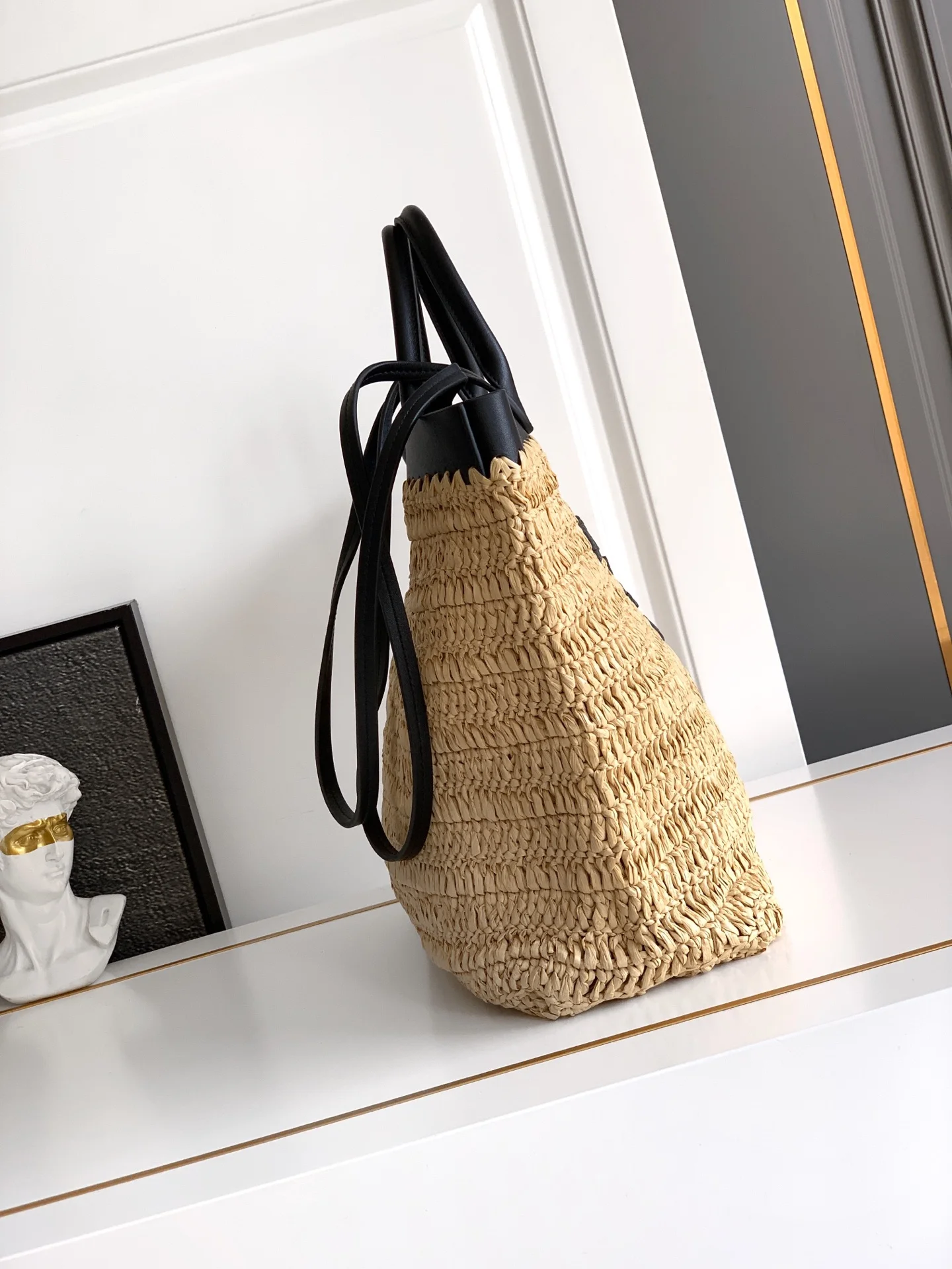 新款草编托特包 这款现代而精致的托特包结合钩编工艺和皮革细节 营造出夏日氛围 牛皮双提手 可用作手提包或单肩包 正面饰以撞色刺绣字母徽标 增添辨识度 精致的编织包身散发出浓郁的春夏气息啦 简单背着就能赋予无与伦比的高级质感啦 空间容量大 又是一个经典爆款啦