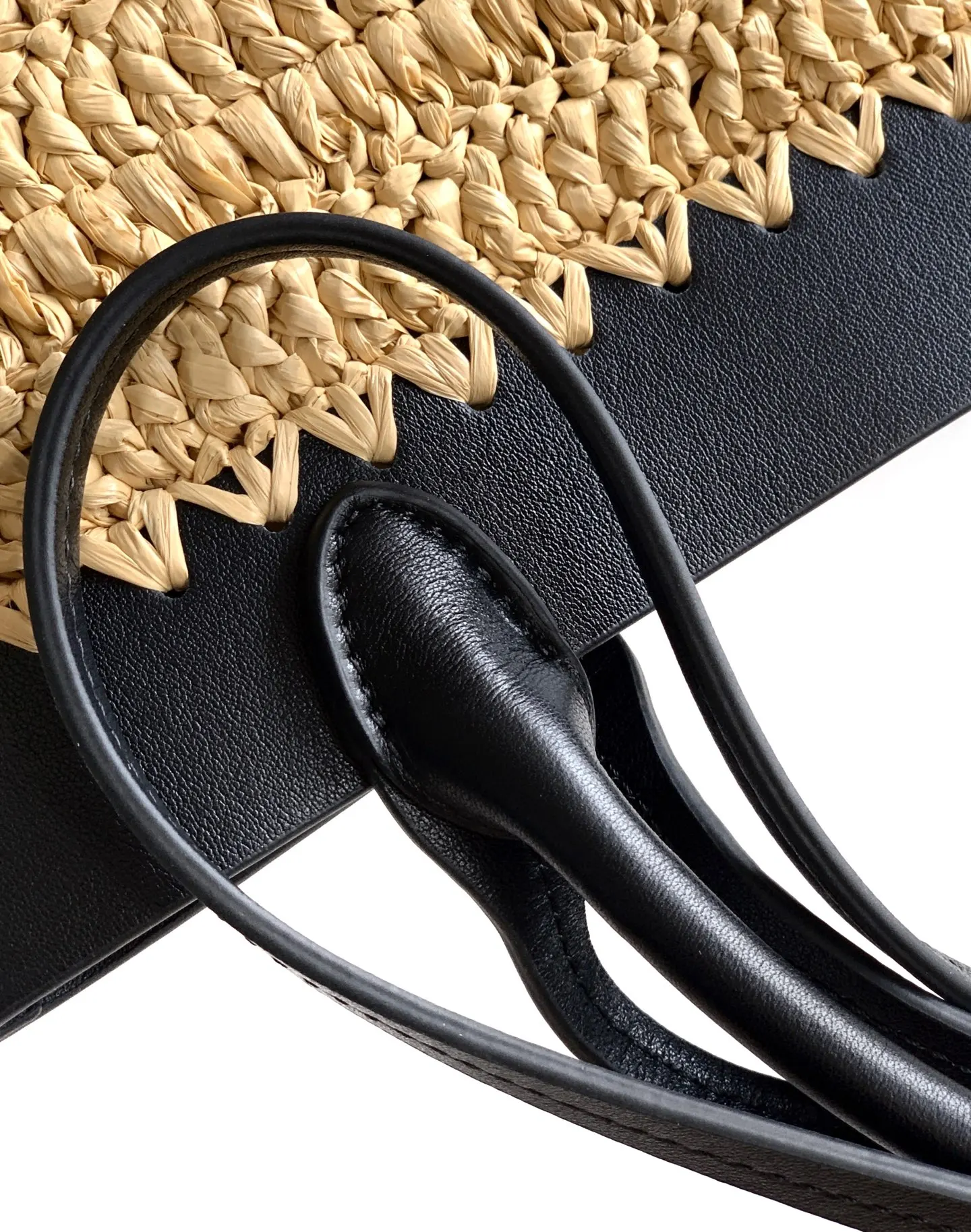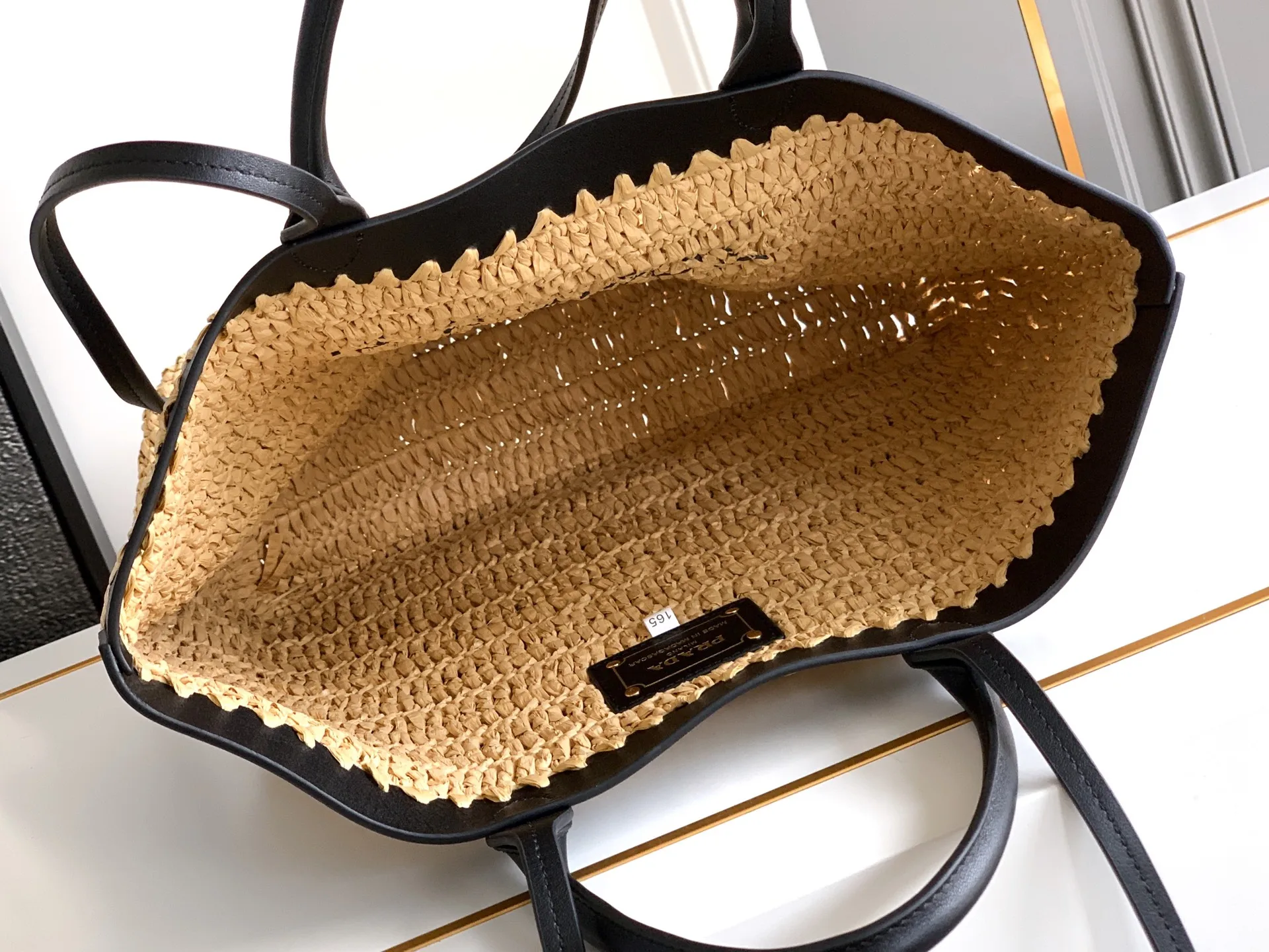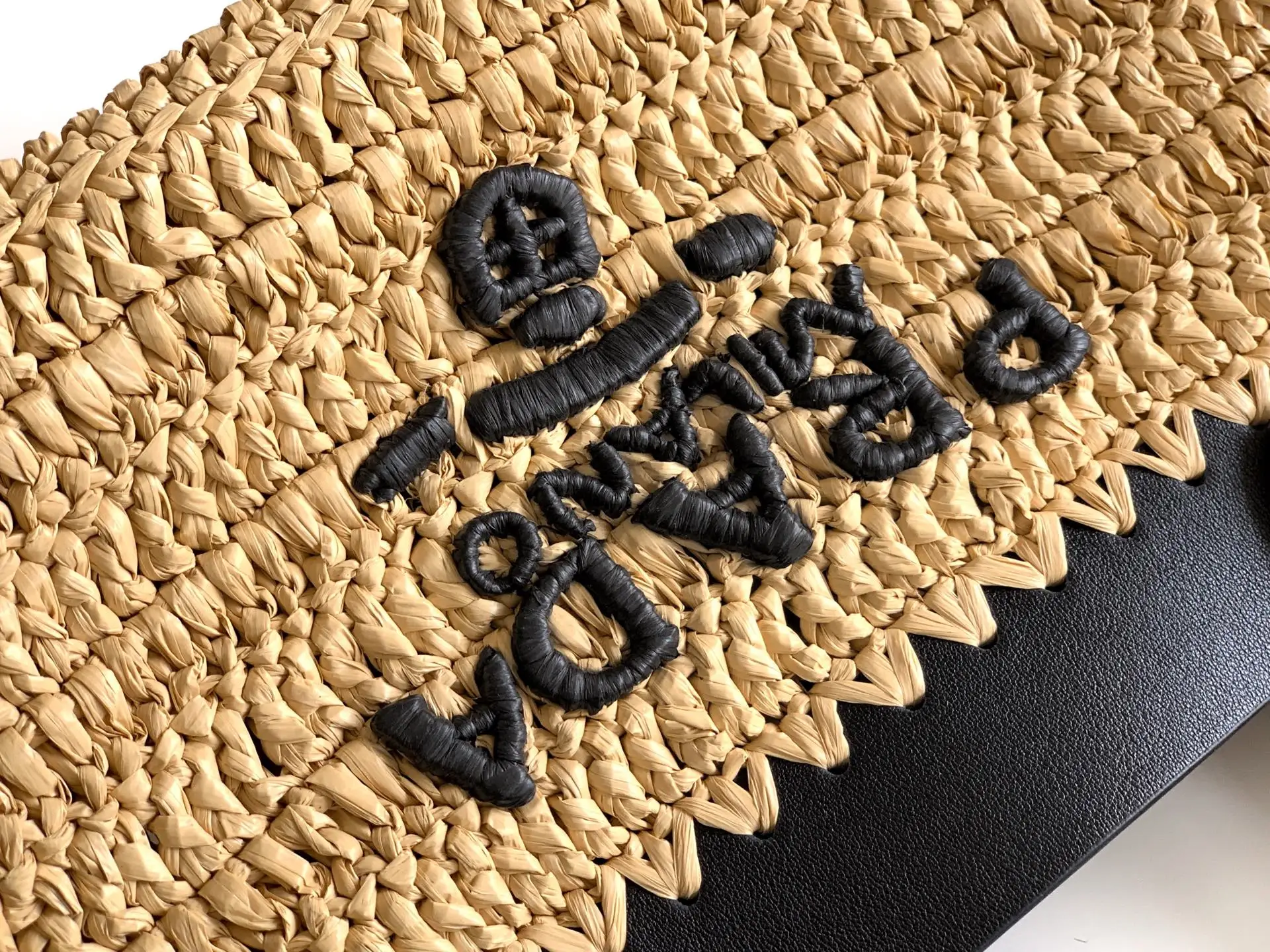 新款草编托特包 这款现代而精致的托特包结合钩编工艺和皮革细节 营造出夏日氛围 牛皮双提手 可用作手提包或单肩包 正面饰以撞色刺绣字母徽标 增添辨识度 精致的编织包身散发出浓郁的春夏气息啦 简单背着就能赋予无与伦比的高级质感啦 空间容量大 又是一个经典爆款啦